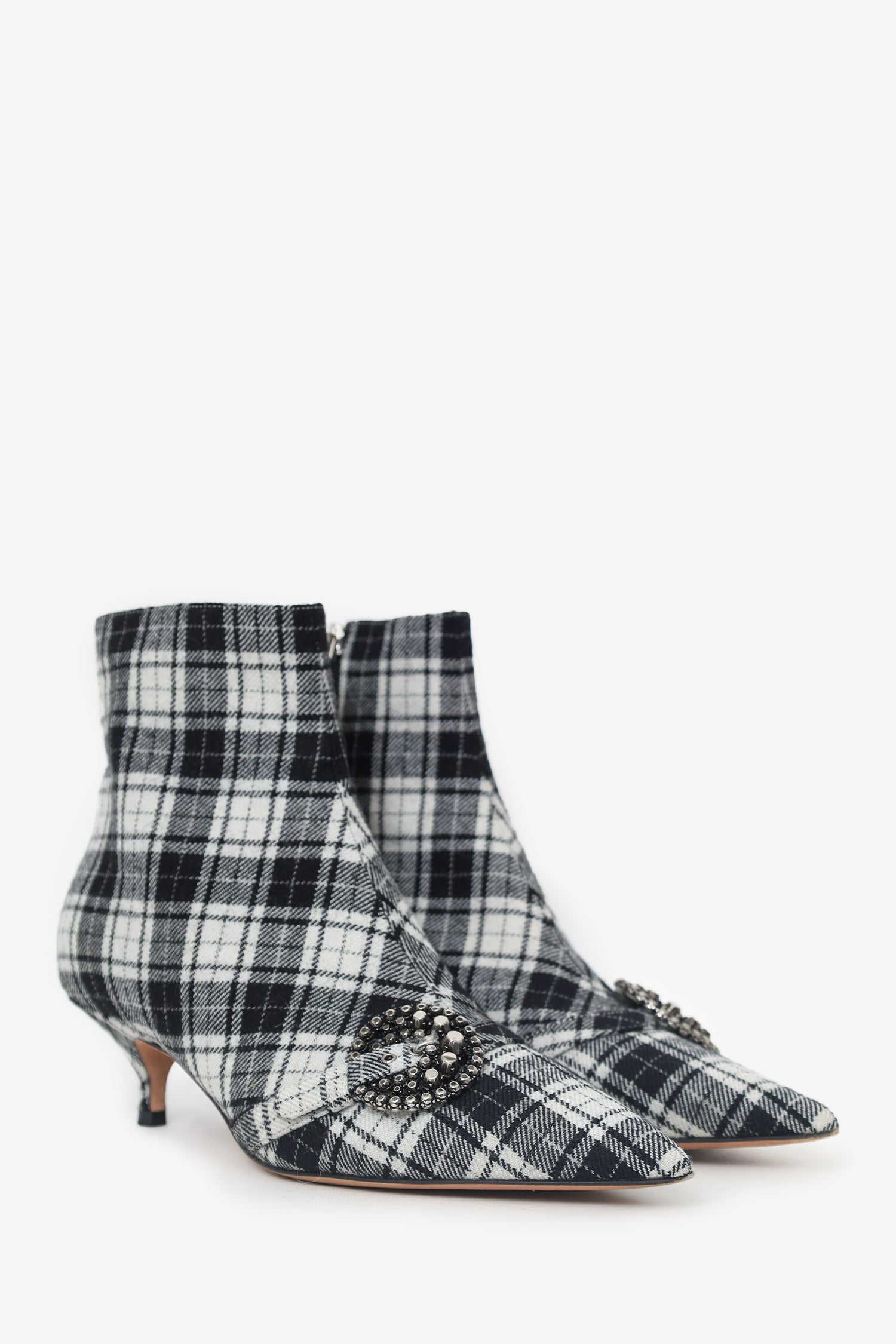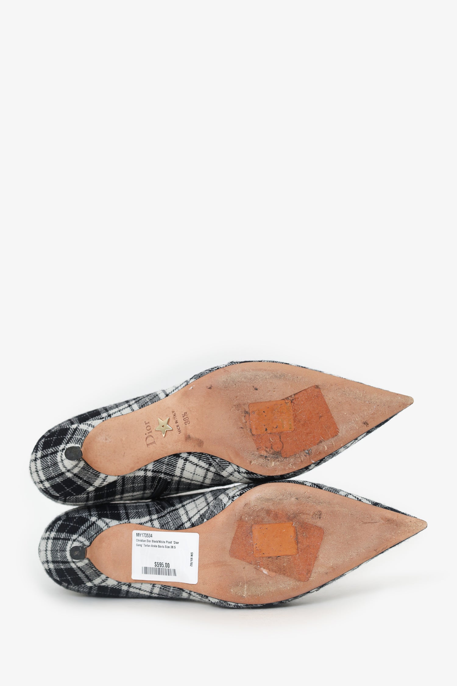 Refresh availabilityChristian Dior Black/White Plaid 'Dior Gang' Tartan Ankle Boots. Pull-on. Pointed toe. Side zip closure. Buckle embellishment on vamp. Leather lined interior. Silver-tone hardware. Tonal stitching.
