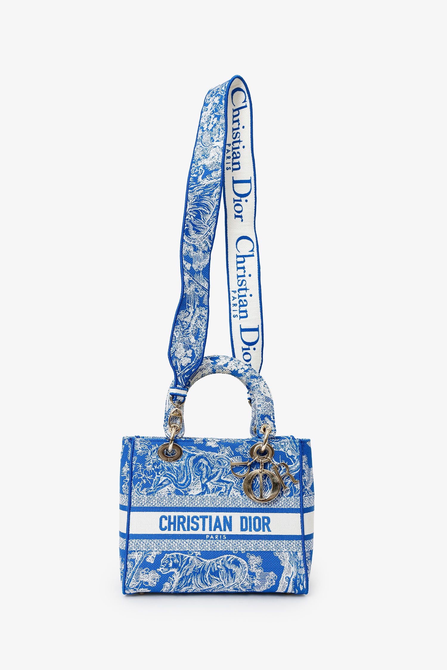 Refresh availabilityChristian Dior Blue/White 'Lady D-Lite' Top Handle With Strap. Interior fold-over-flap. Twin top handles. Removable canvas shoulder strap with clasp closure. Protective base studs. Lined interior with 2 pockets; 1 zip and 1 slip. Gold-tone hardware. Tonal stitching.