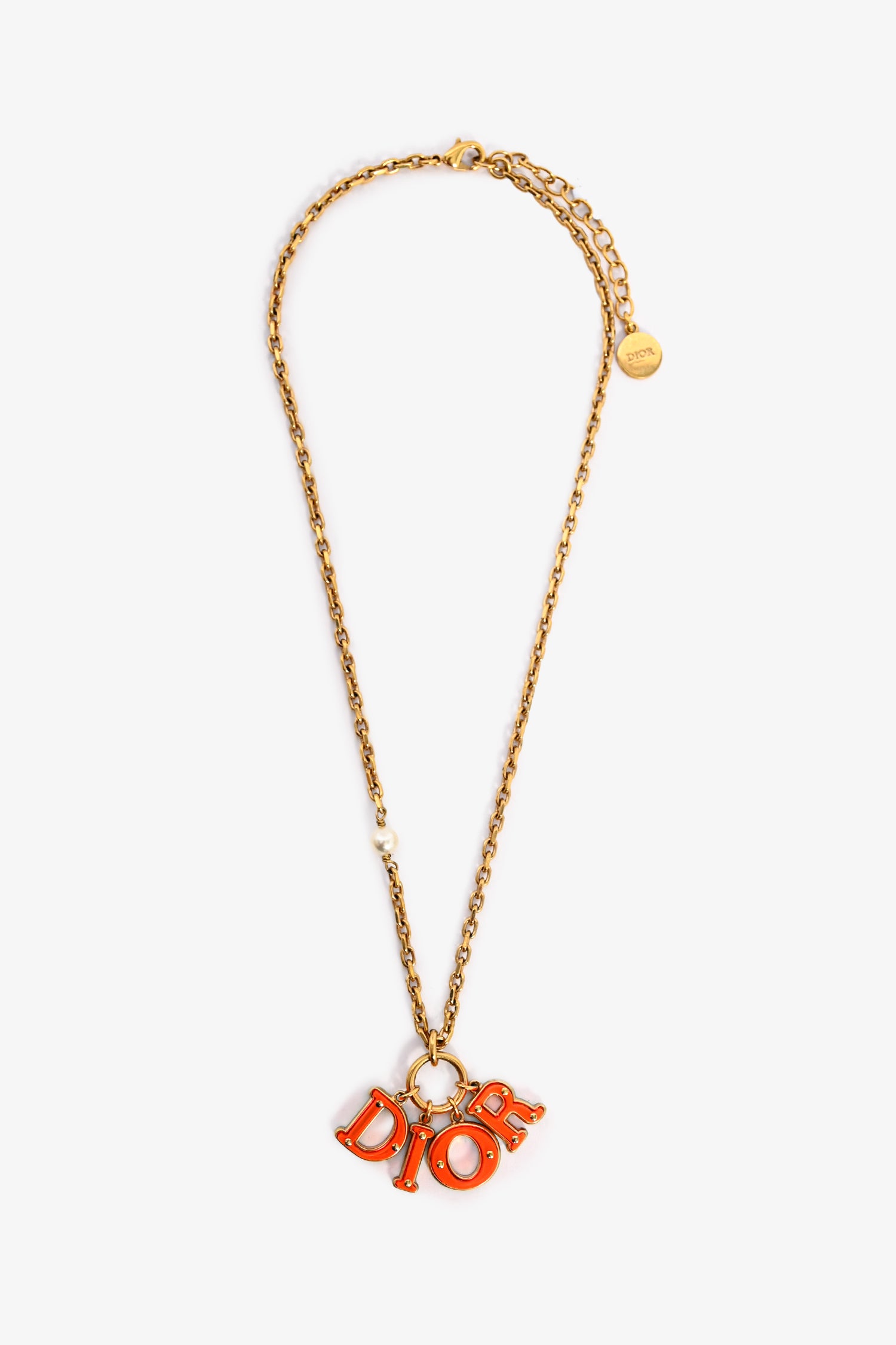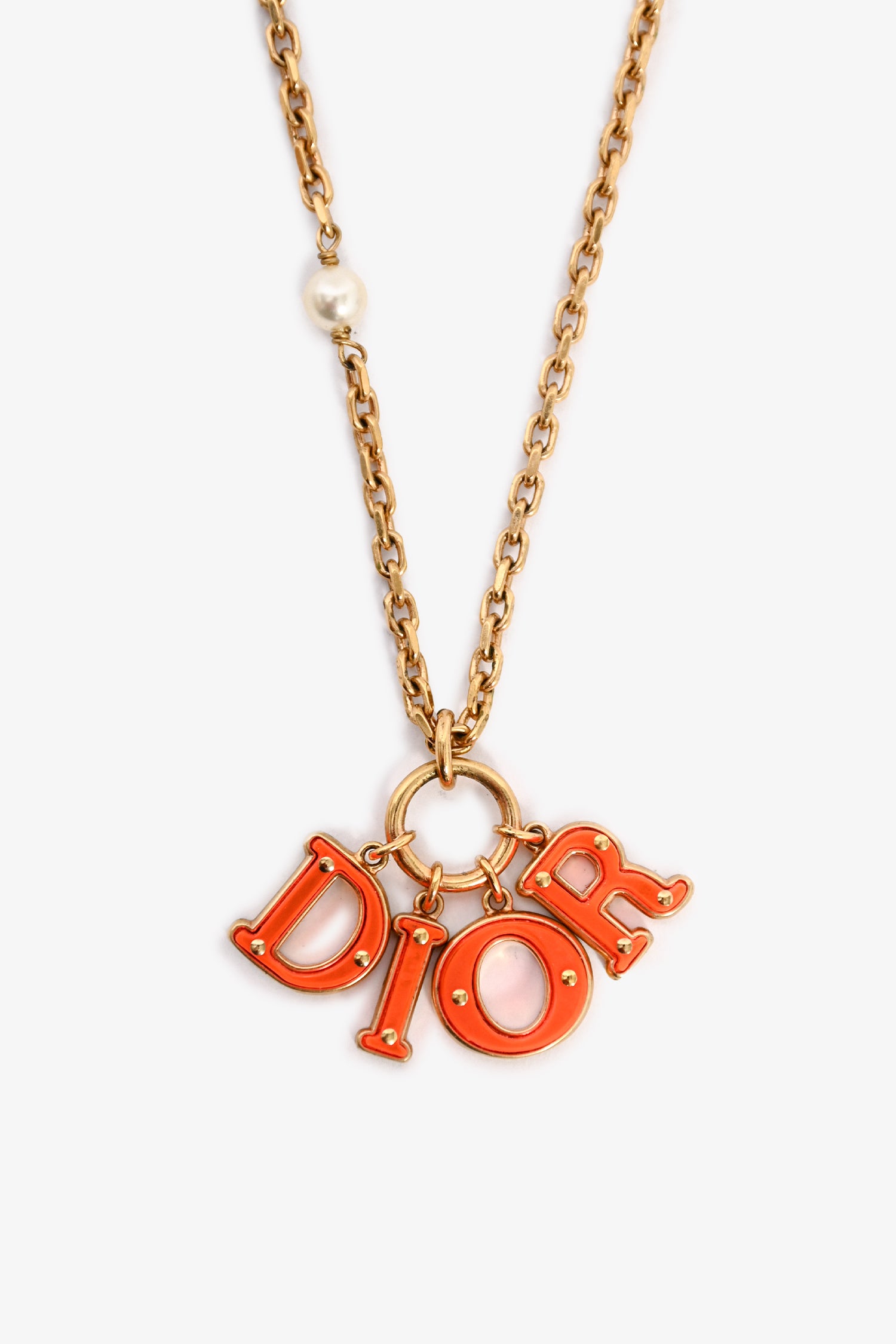 Refresh availabilityChristian Dior Gold Toned Orange Resin Logo Necklace. Lobster clasp closure. Faux pearl detail.