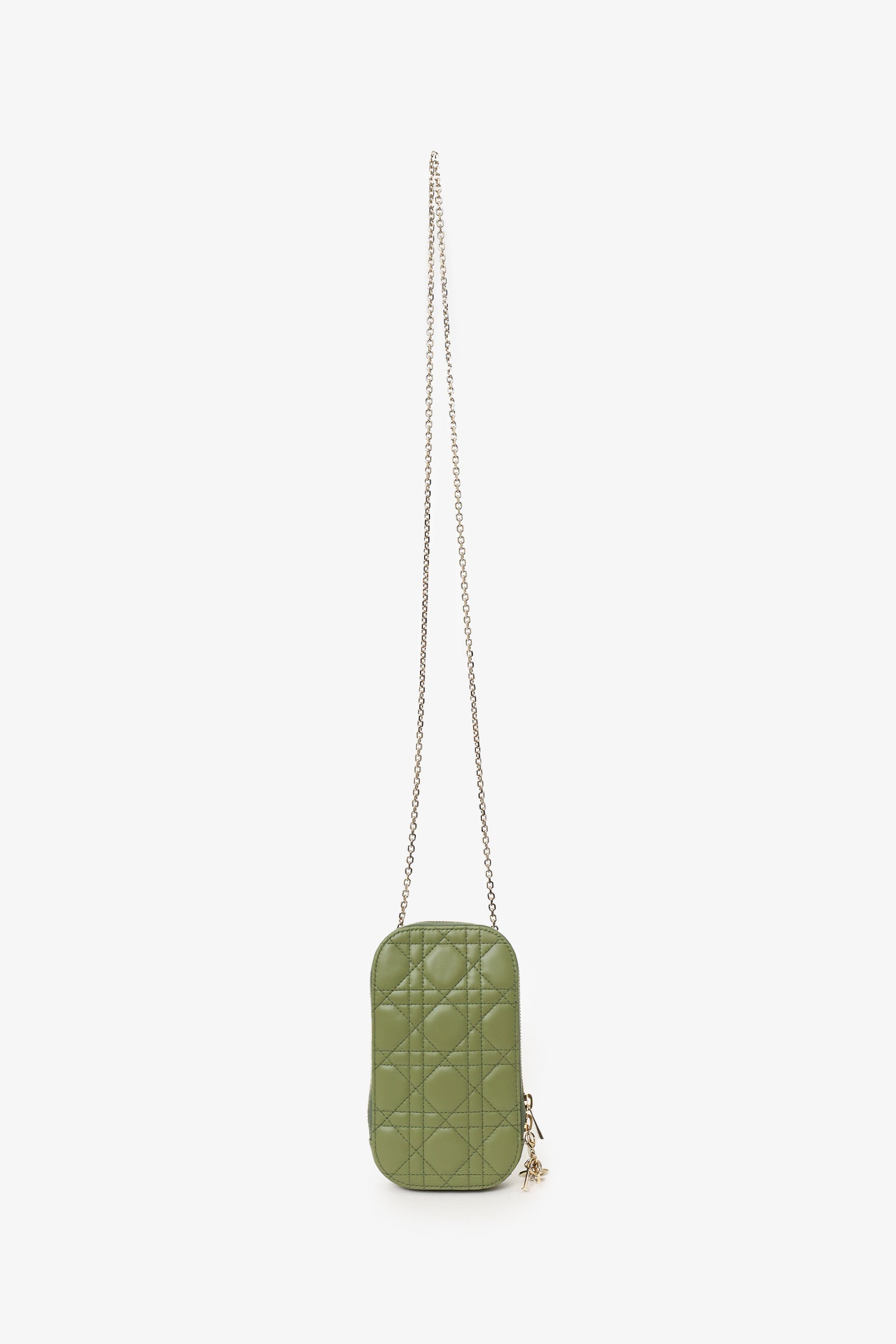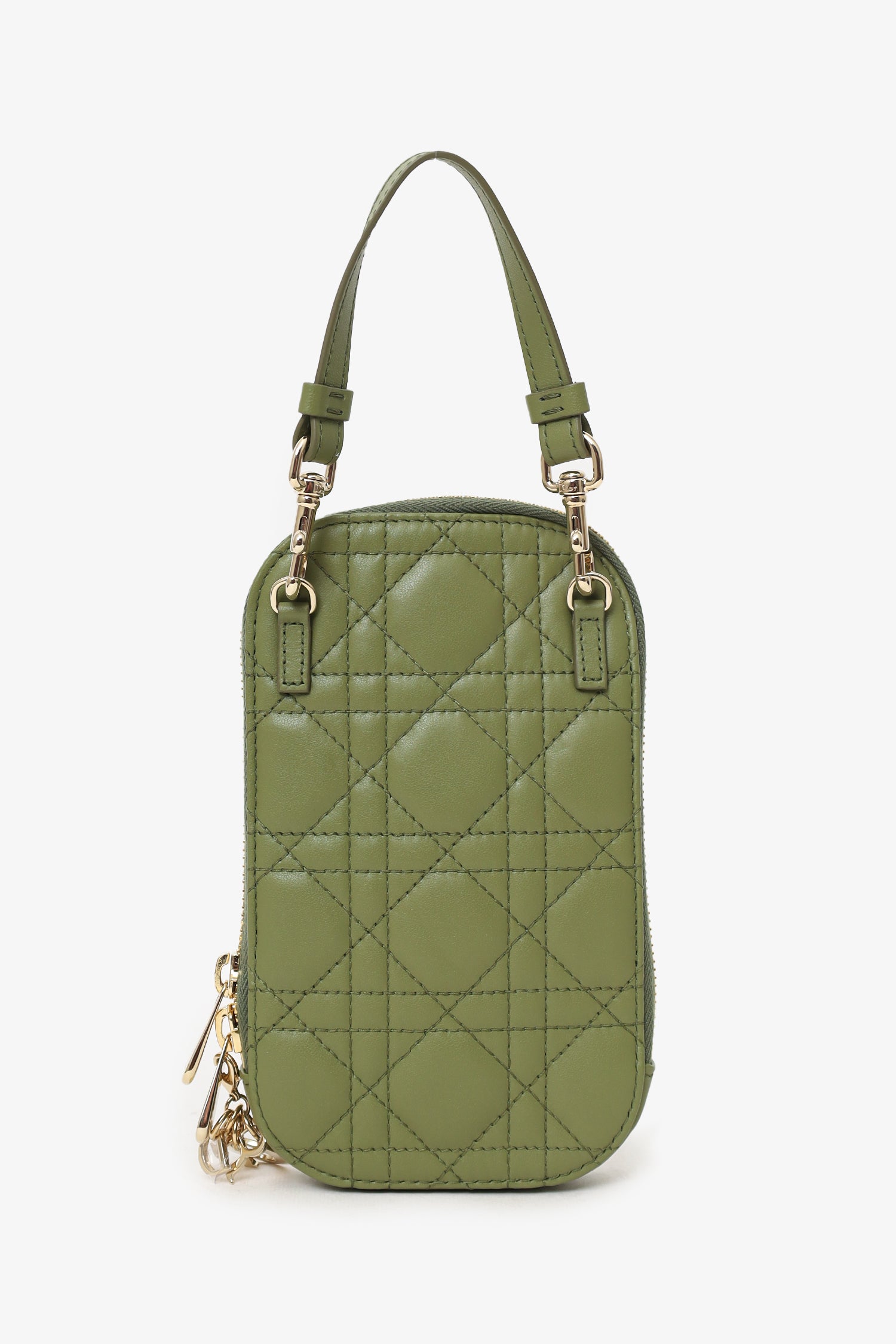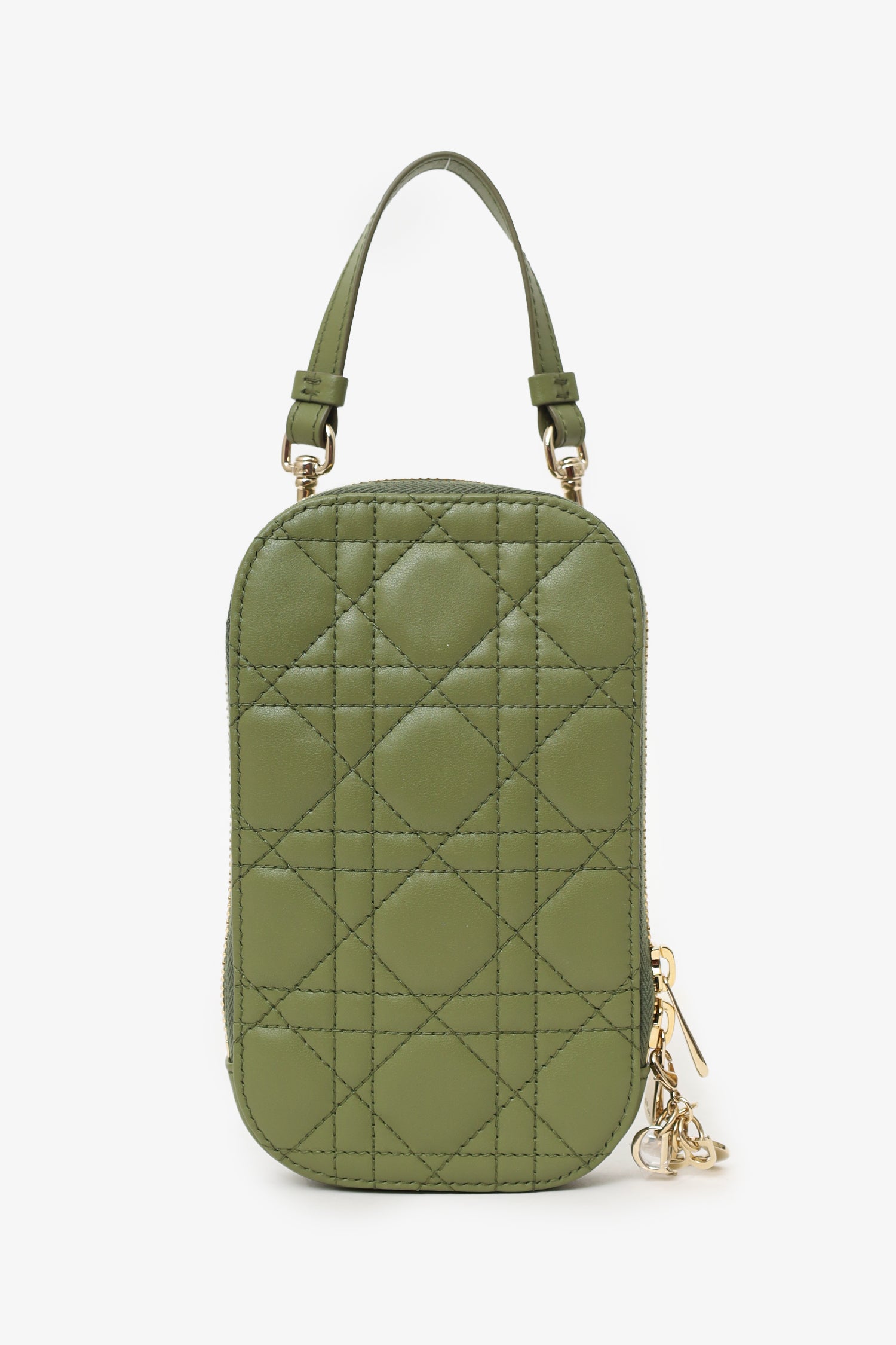 Refresh availabilityChristian Dior Green Quilted Cannage Phone Holder Case. Top 3/4 zip closure. Removable leather handle. Removable chainlink strap. Lined interior. 3 interior card slots. Gold-tone hardware. Tonal stitching.