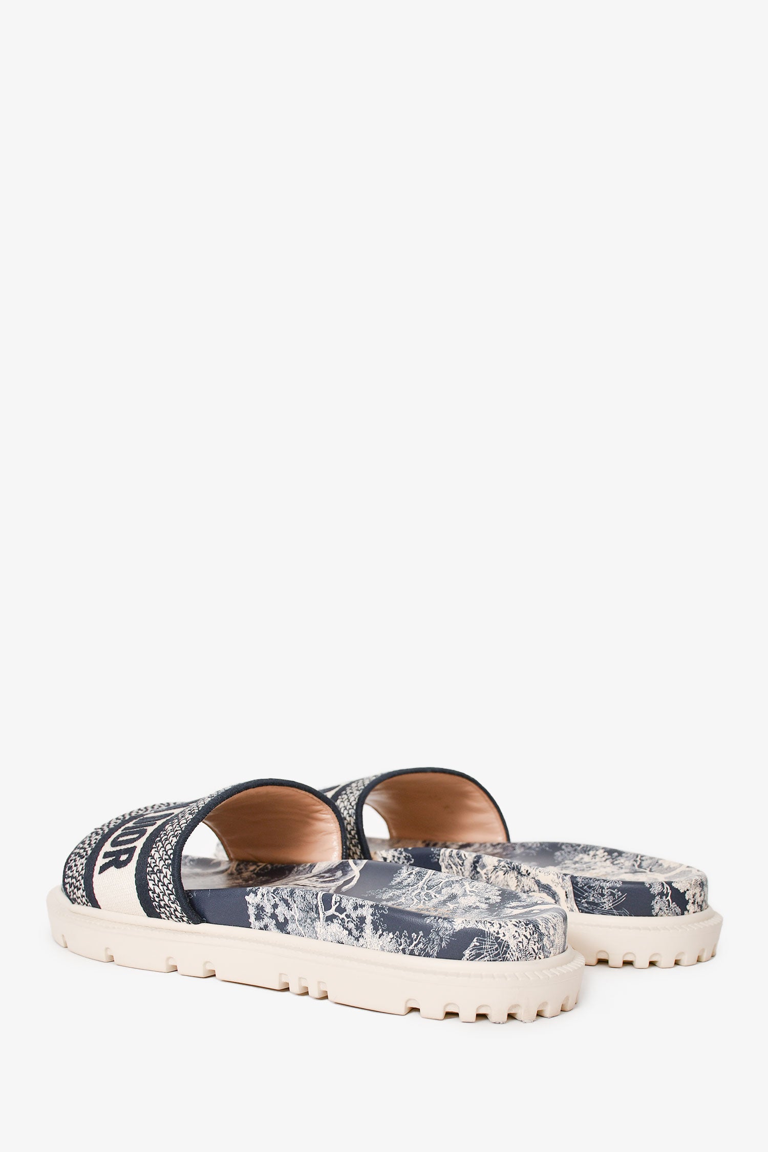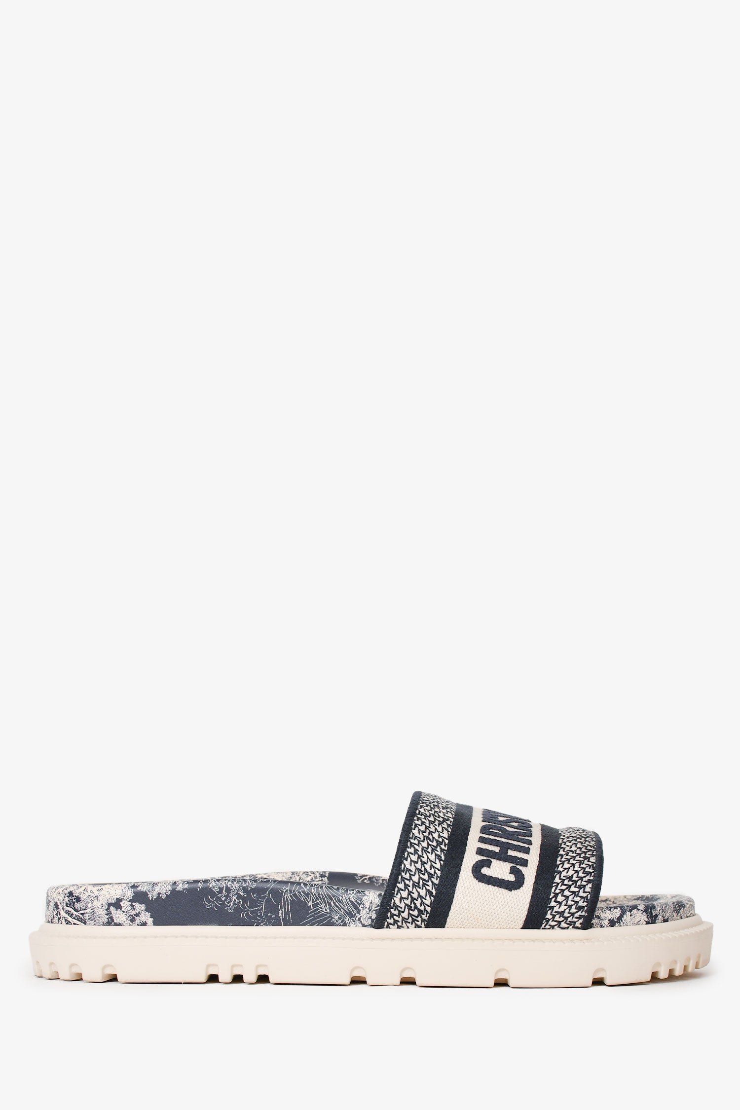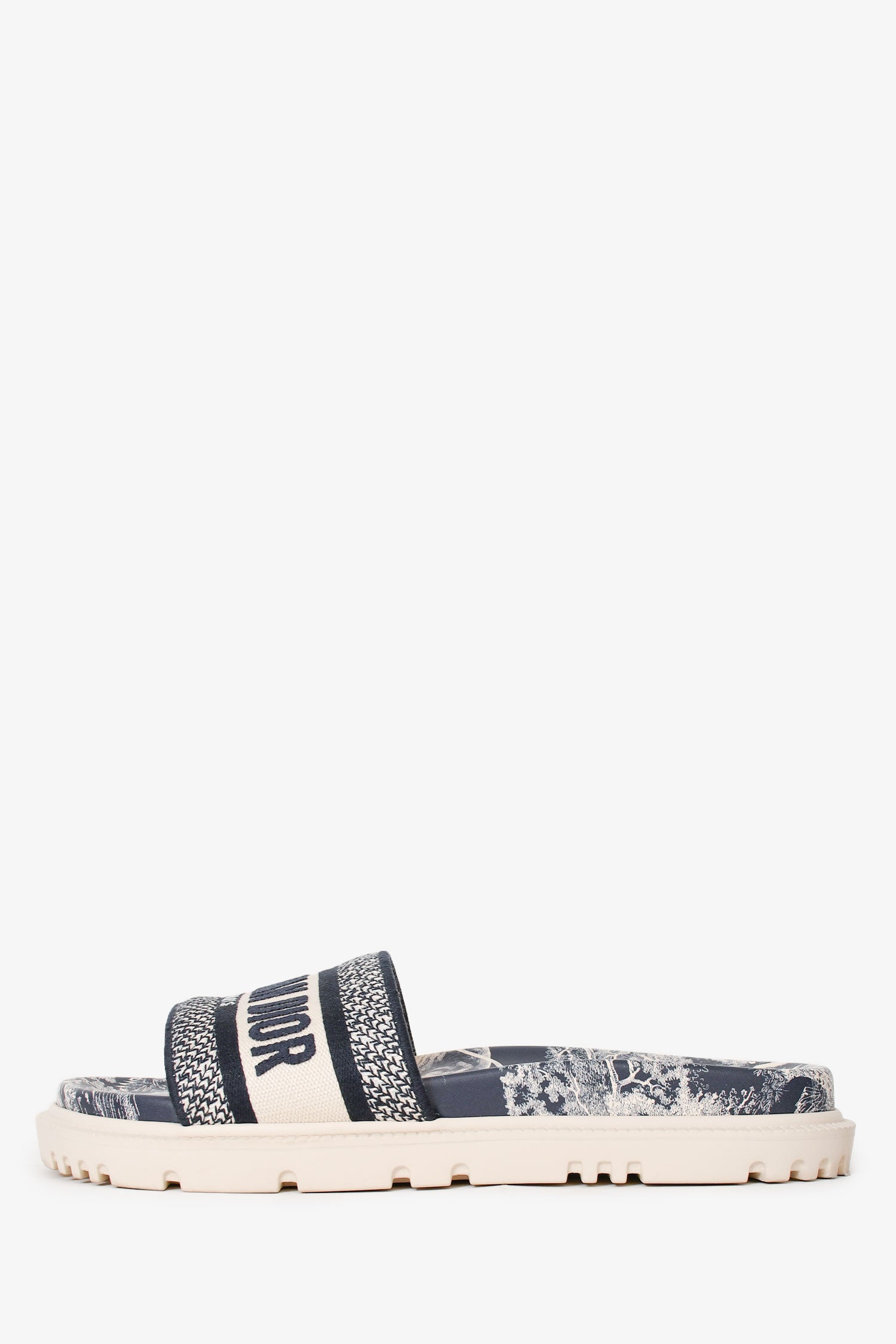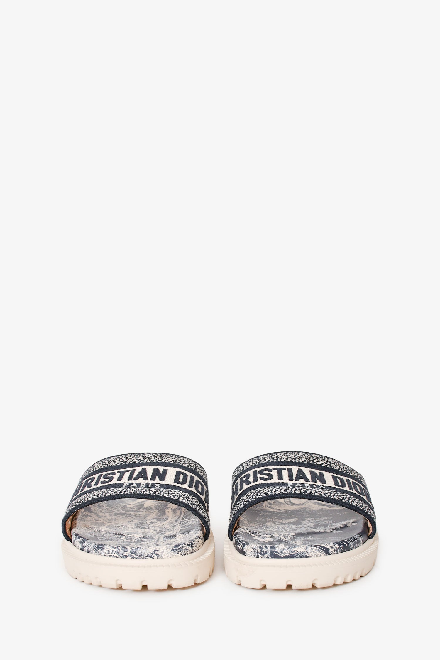 Refresh availabilityChristian Dior Navy/White Logo Embroidered Canvas Toile De Jouy Dway Slides. Open toe. Slip-on. Tonal stitching.