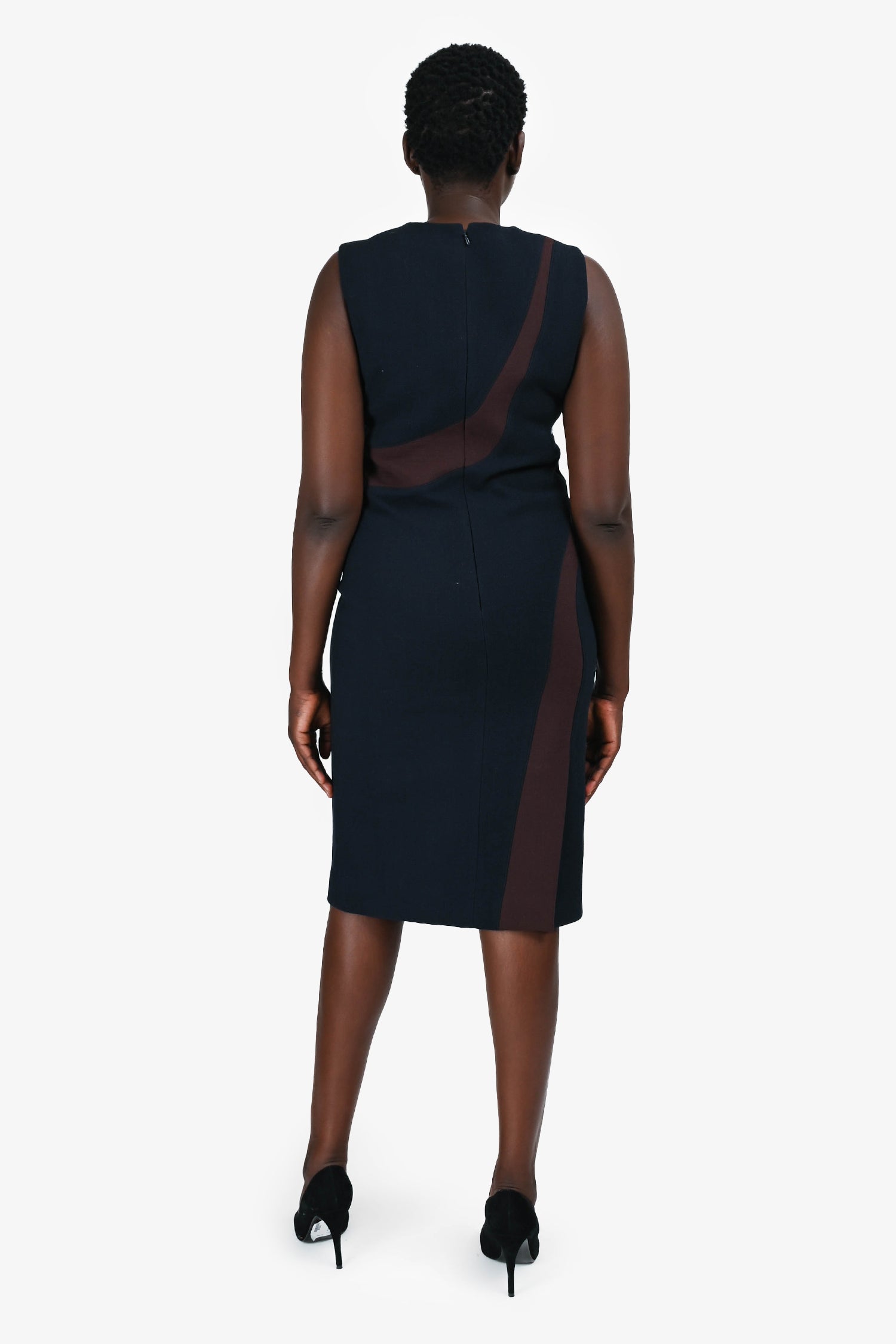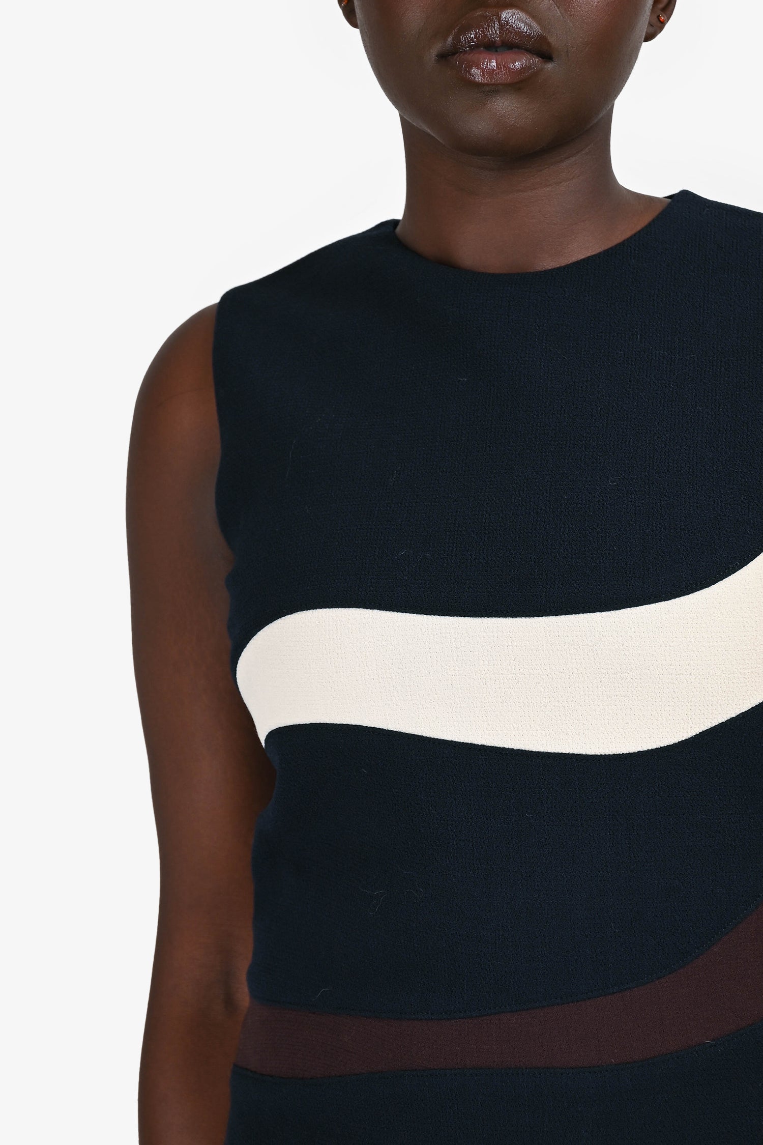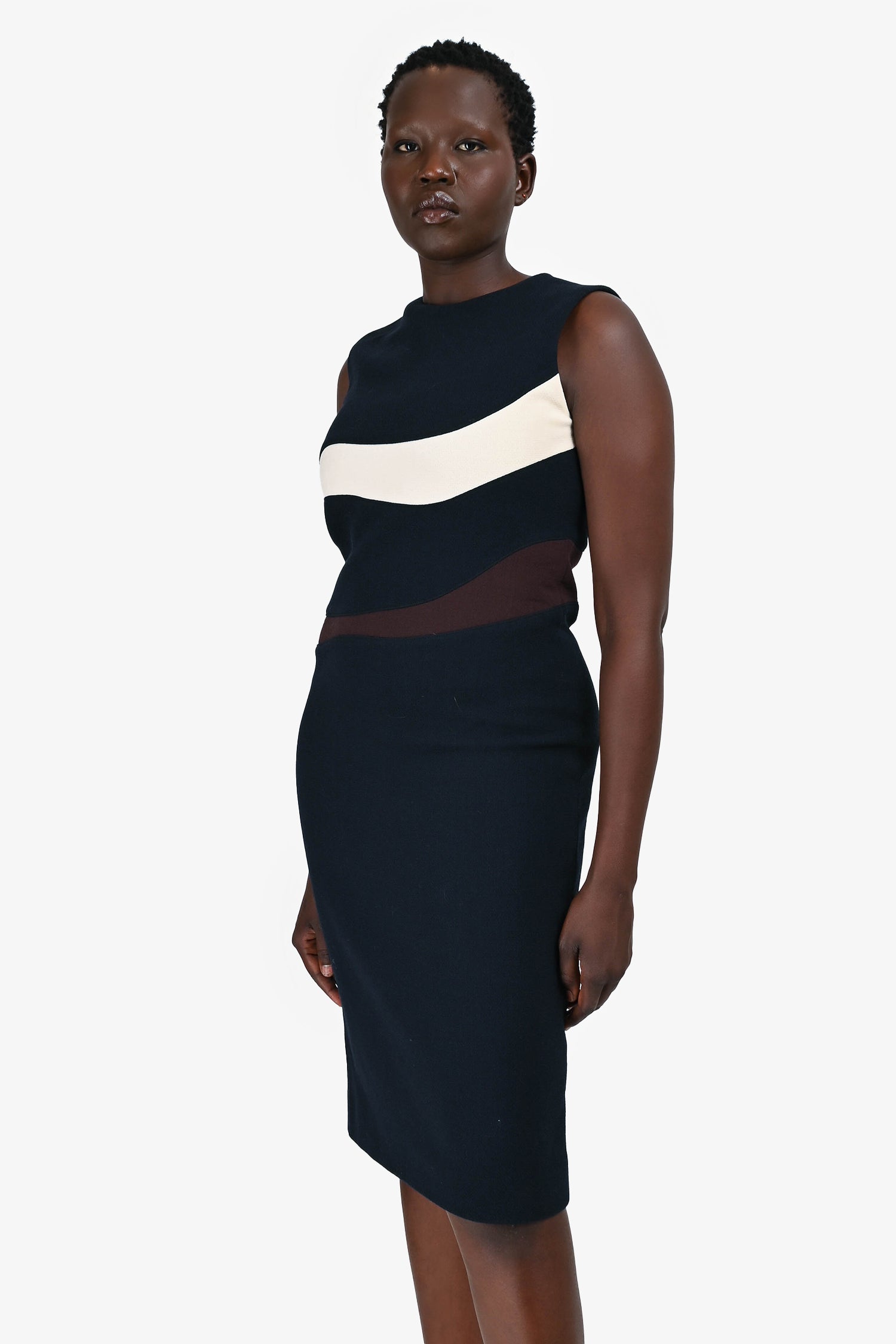 Refresh availabilityChristian Dior Navy Wool White/Brown Stripe Sleeveless Midi Dress. Round neck. Rear zip and hook closure. Lined.