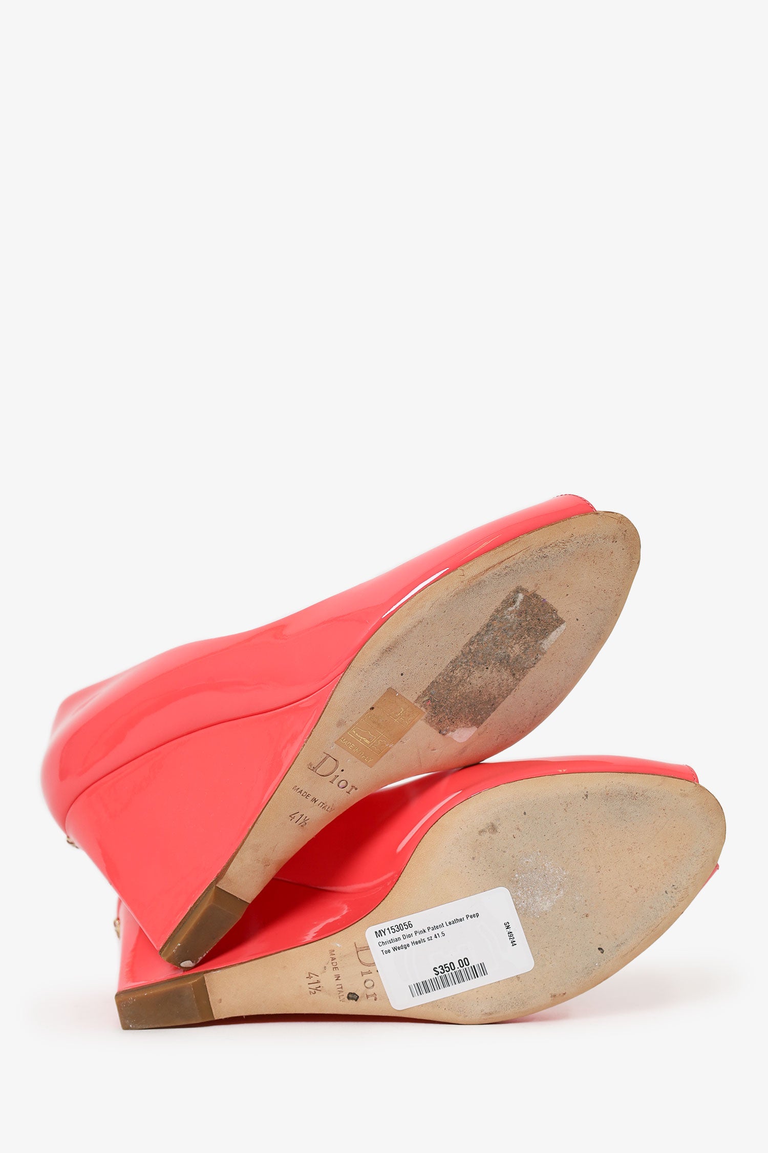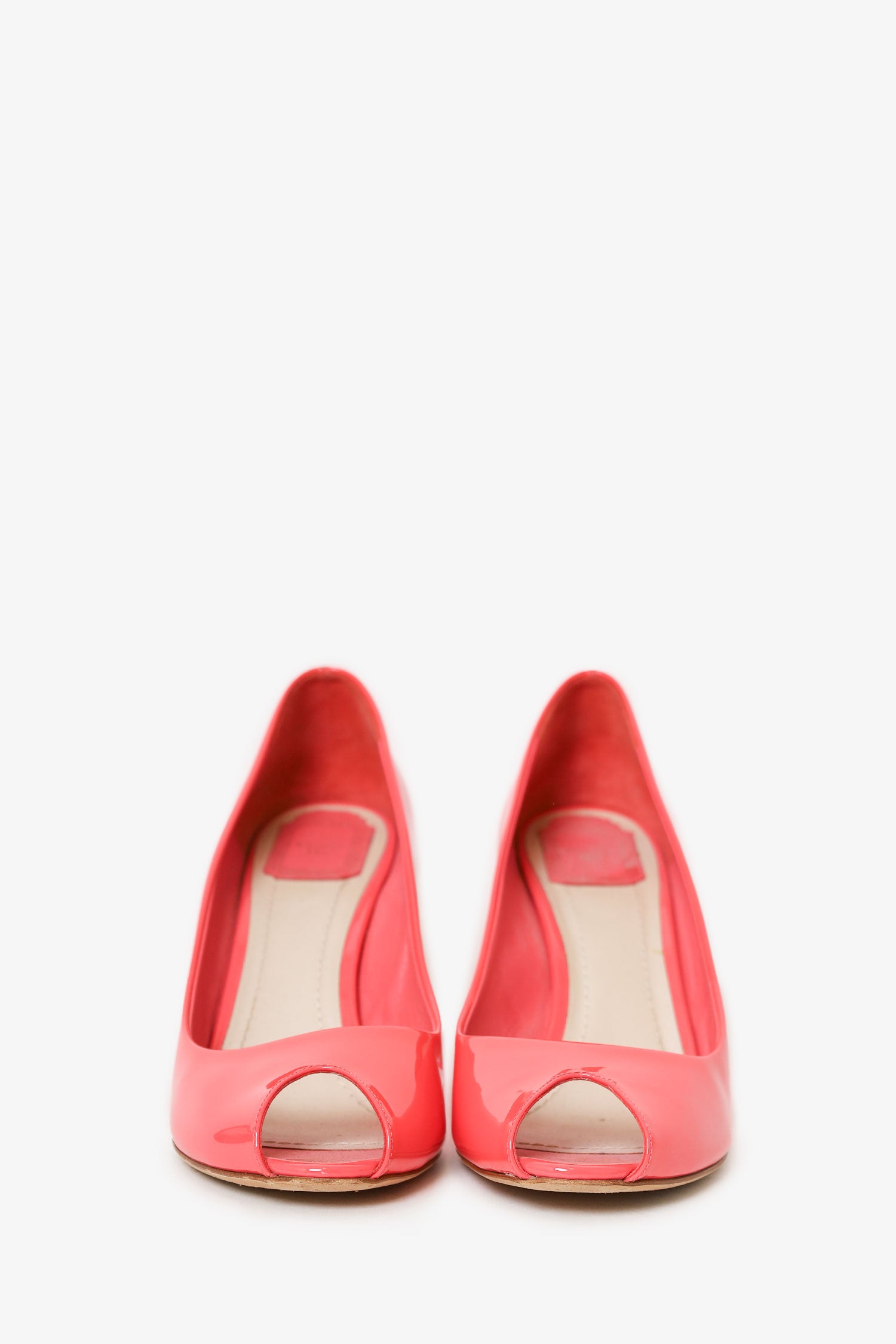 Refresh availabilityChristian Dior Pink Patent Leather Peep Toe Wedge Heels. Slip on. Open round toe. Tonal stitching. Gold-toned hardware.
