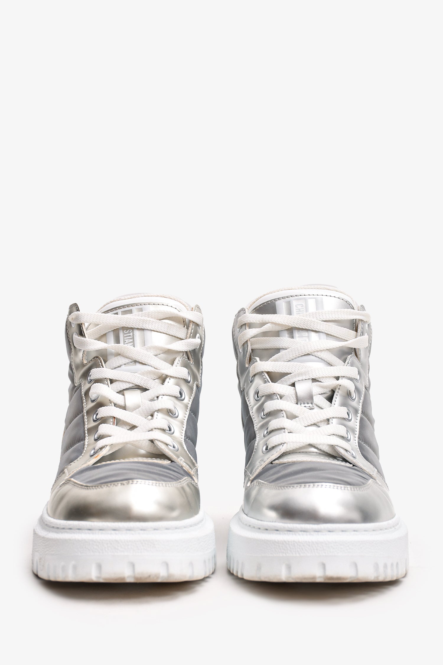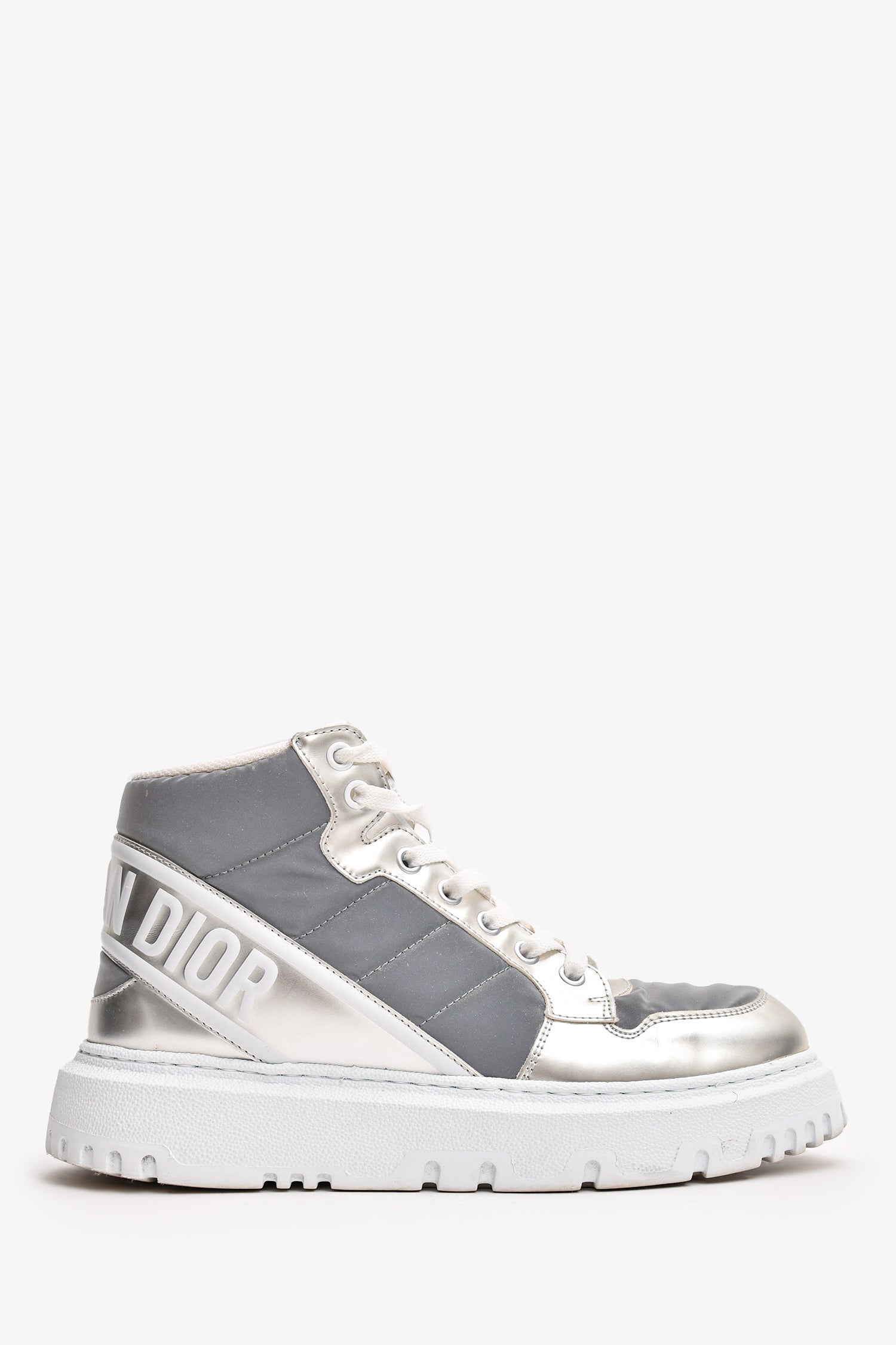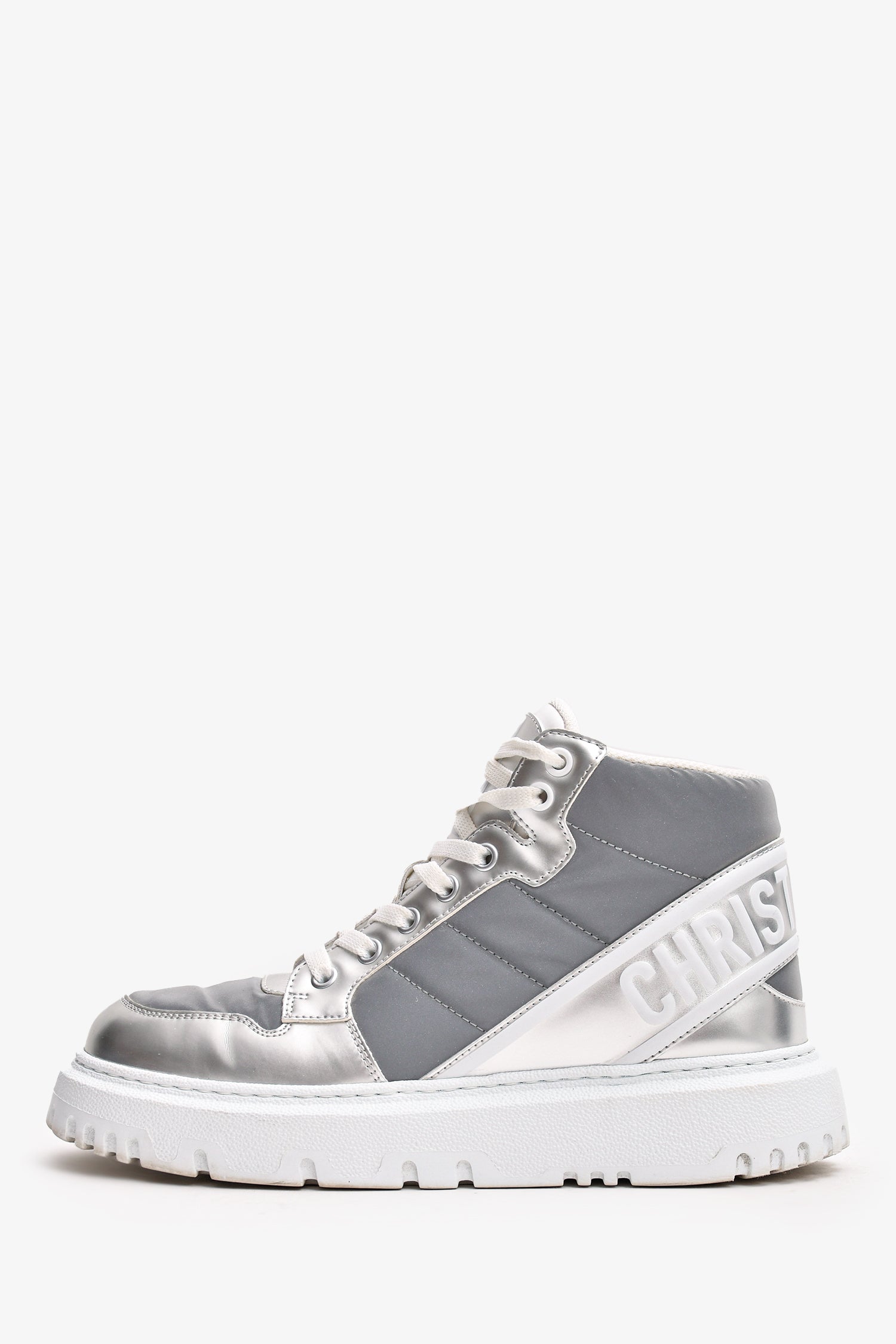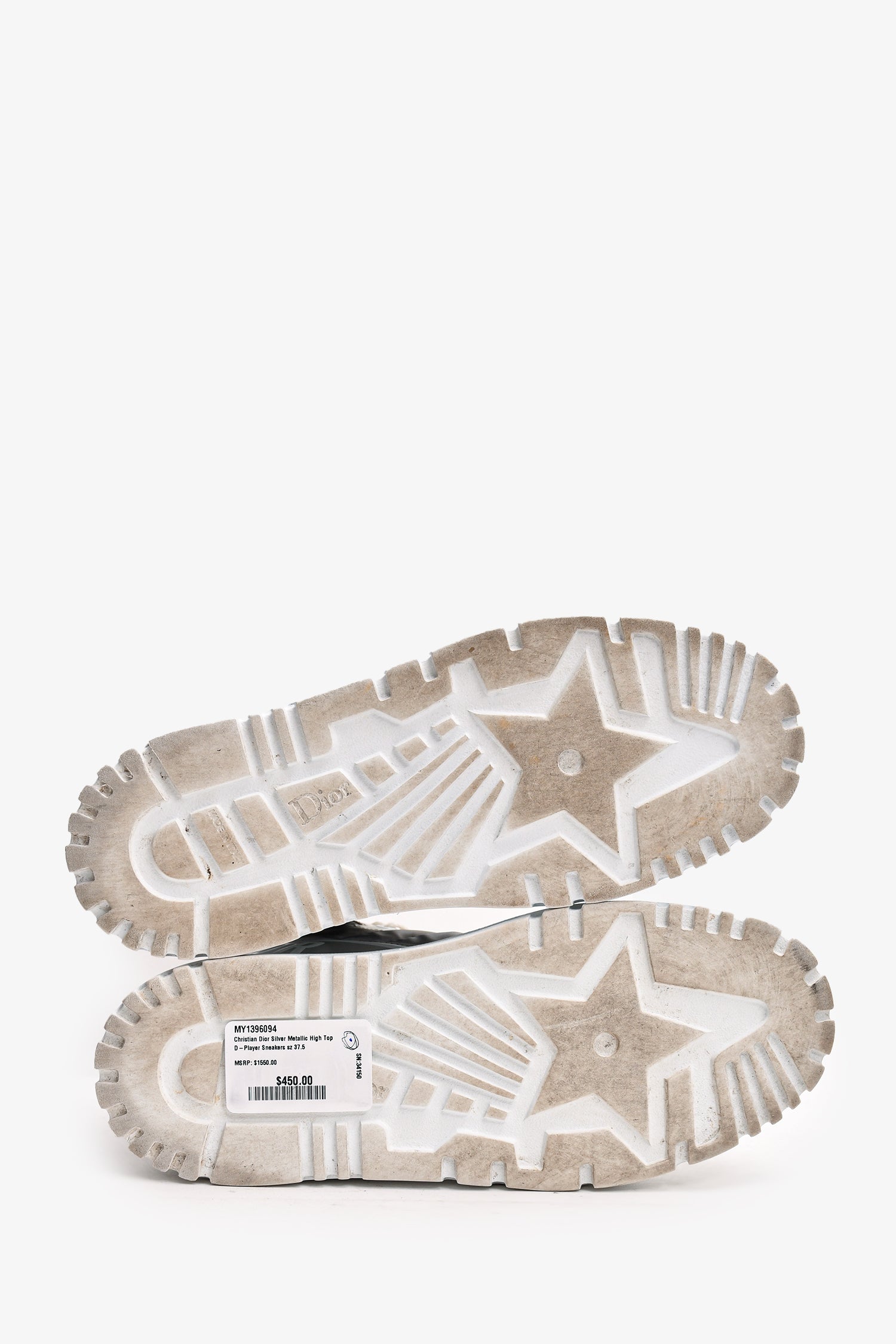 Refresh availabilityChristian Dior Silver Metallic High Top D-Player Sneakers. Front lace-up closure. Round toe. Tonal stitching.