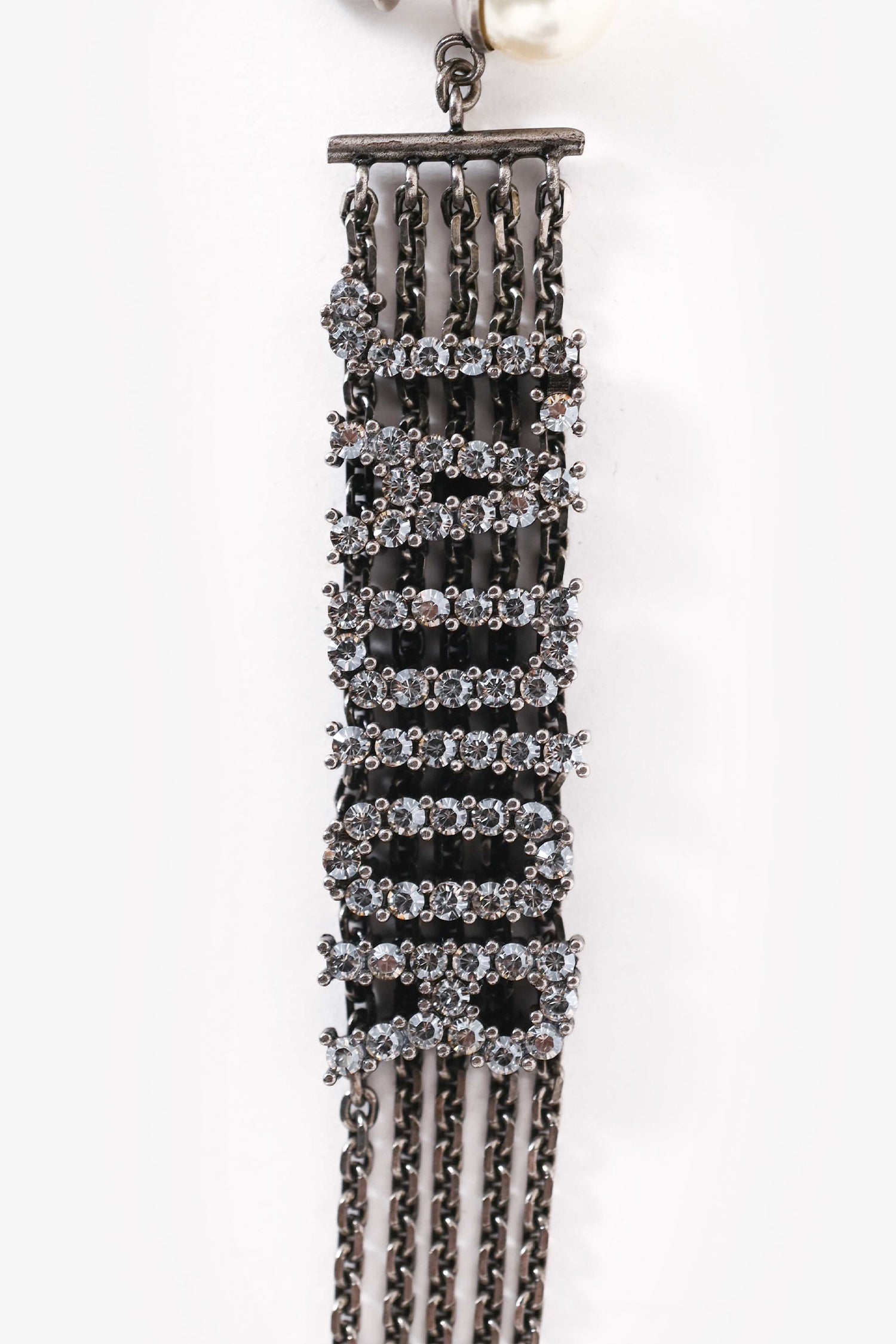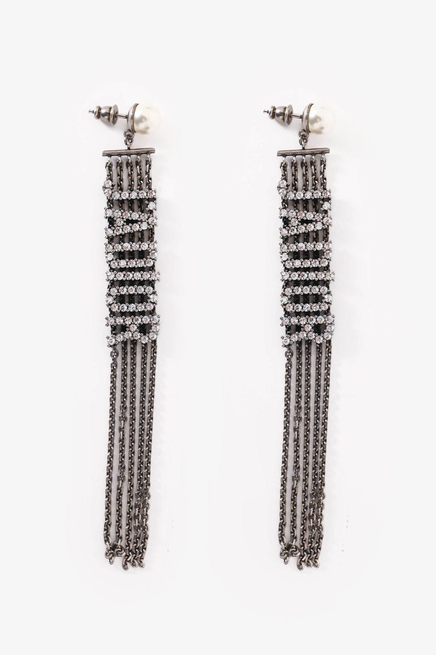 Refresh availabilityChristian Dior Silver Tone Metal/Faux Pearl/Crystal Embellished J'ADior Ear Pendants. Post-back fastening with faux pearl studs. Logo-detail upper bar accented with crystal embellishments and cascading chain fringe. Polished finish.
