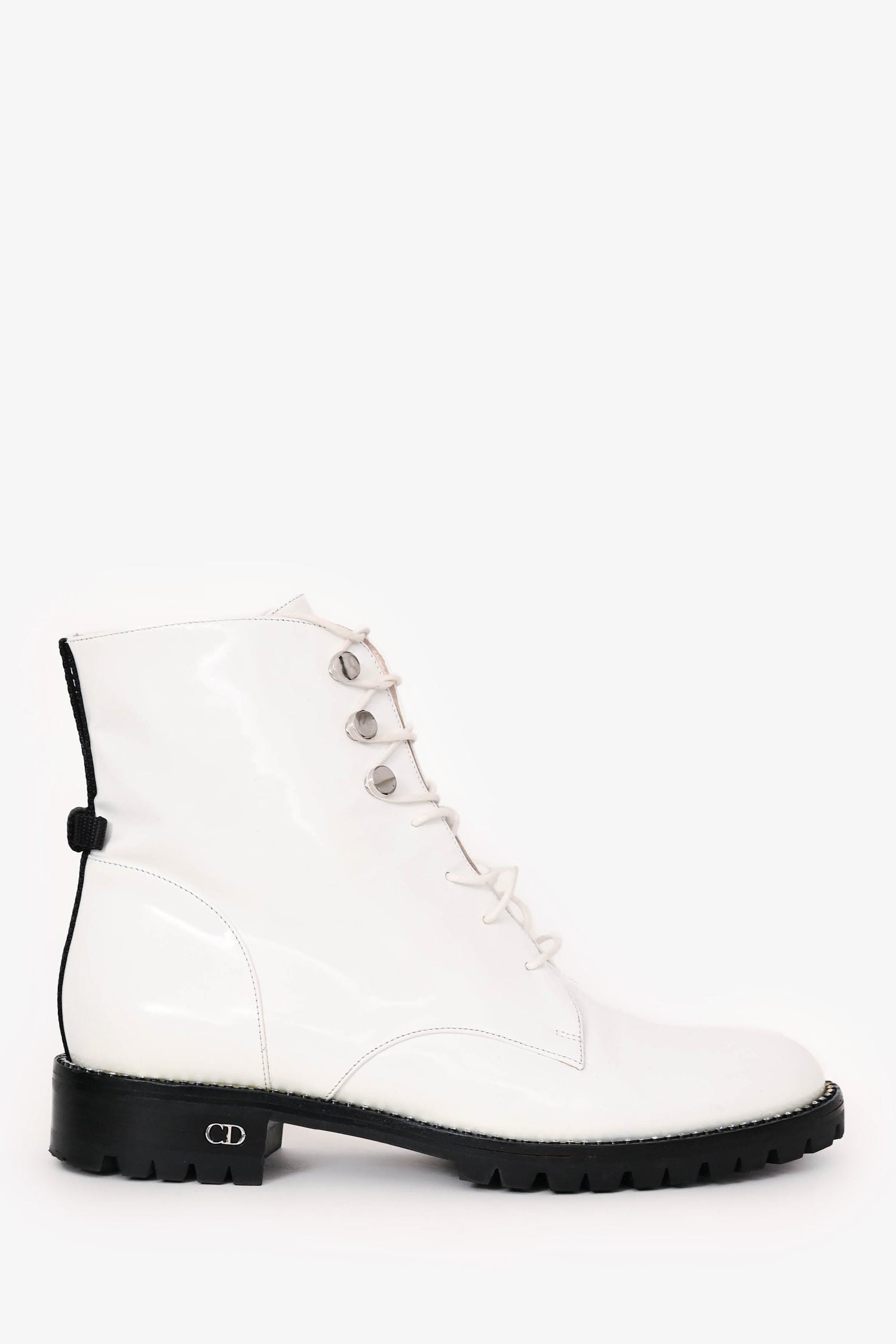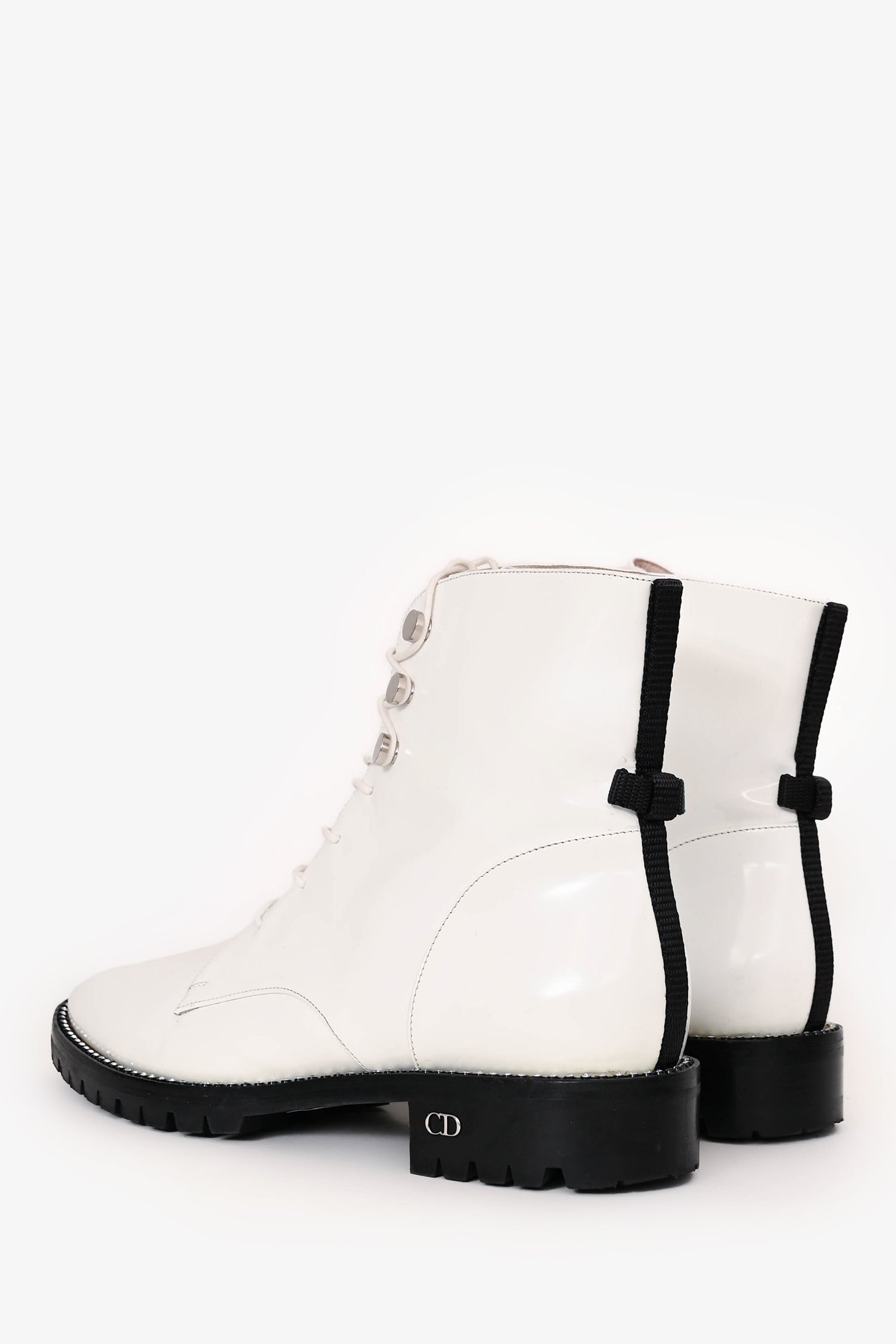 Refresh availabilityChristian Dior White Leather Crystal-Trimmed CD Combat Boots. Slip-on. Almond toe. Lace-up front closure. Crystal embellishment along the sole. Leather lining and insole. Rubber sole. Silver-tone hardware. Tonal stitching.