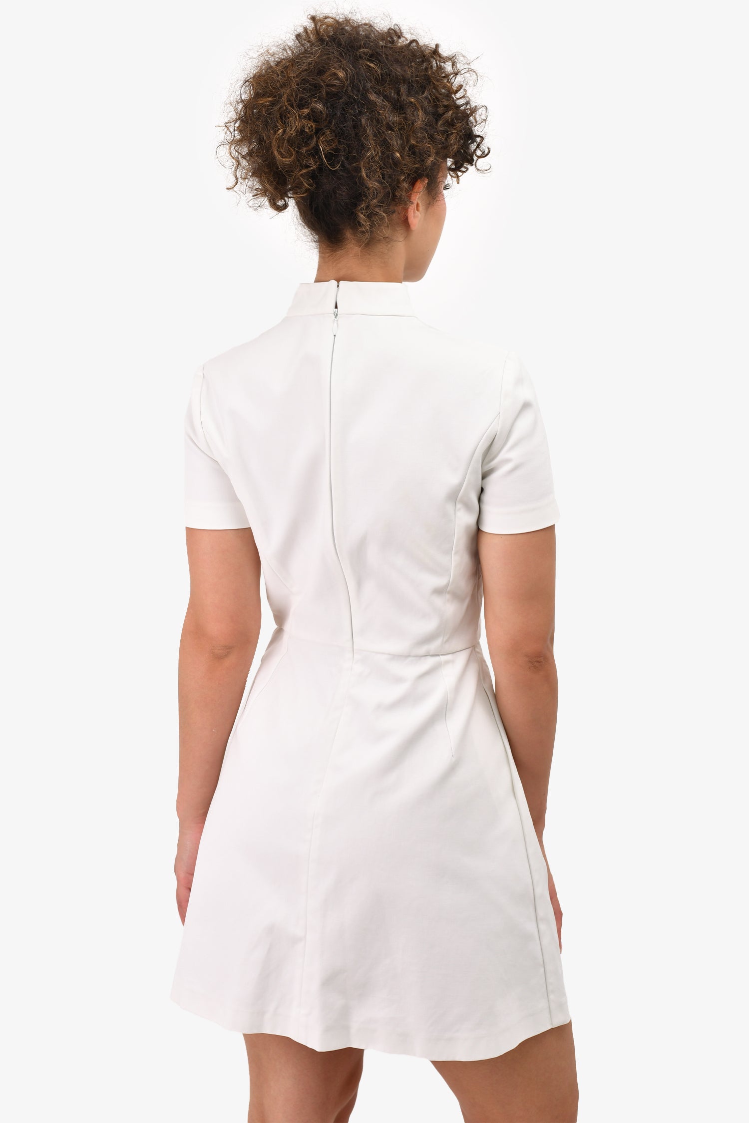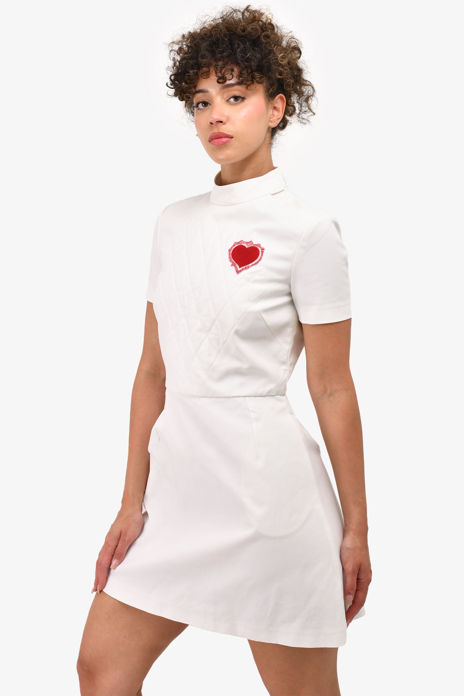 Refresh availabilityChristian Dior White Quilted Mock Neck Short Sleeve Heart Detail Mini Dress. Rear zip with clasp closure. Tonal stitching.