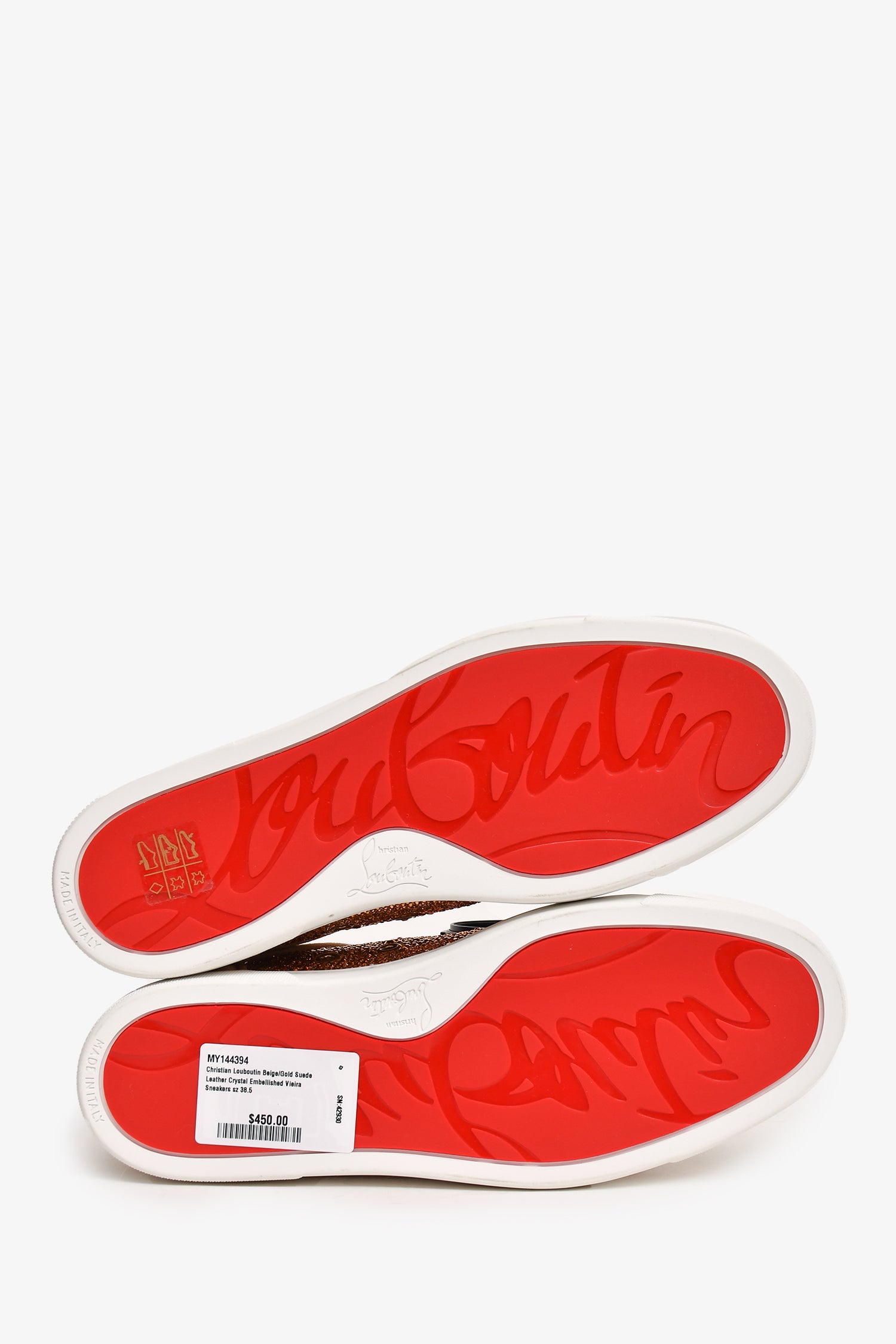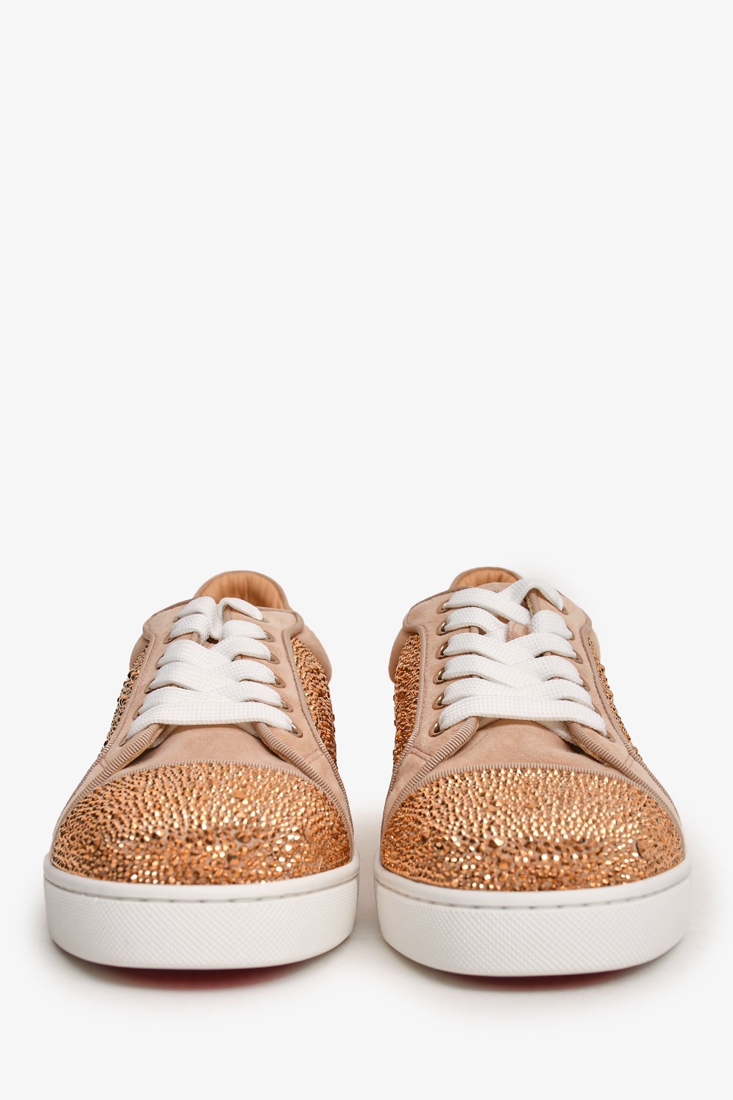 Refresh availabilityChristian Louboutin Beige/Gold Suede Leather Crystal Embellished Vieira Sneakers. Suede trimming. Crystal embellishment. Lace-front closure. Rubberized soles. Tonal stitching.