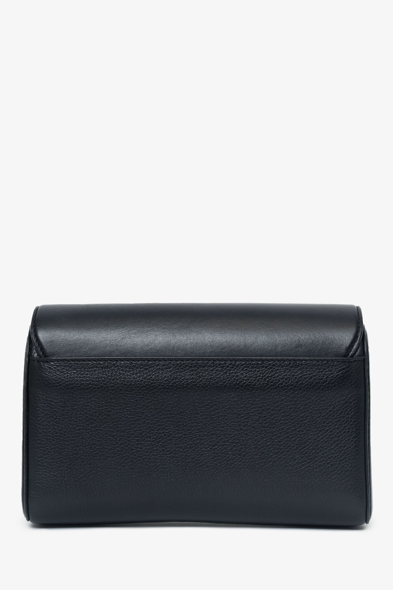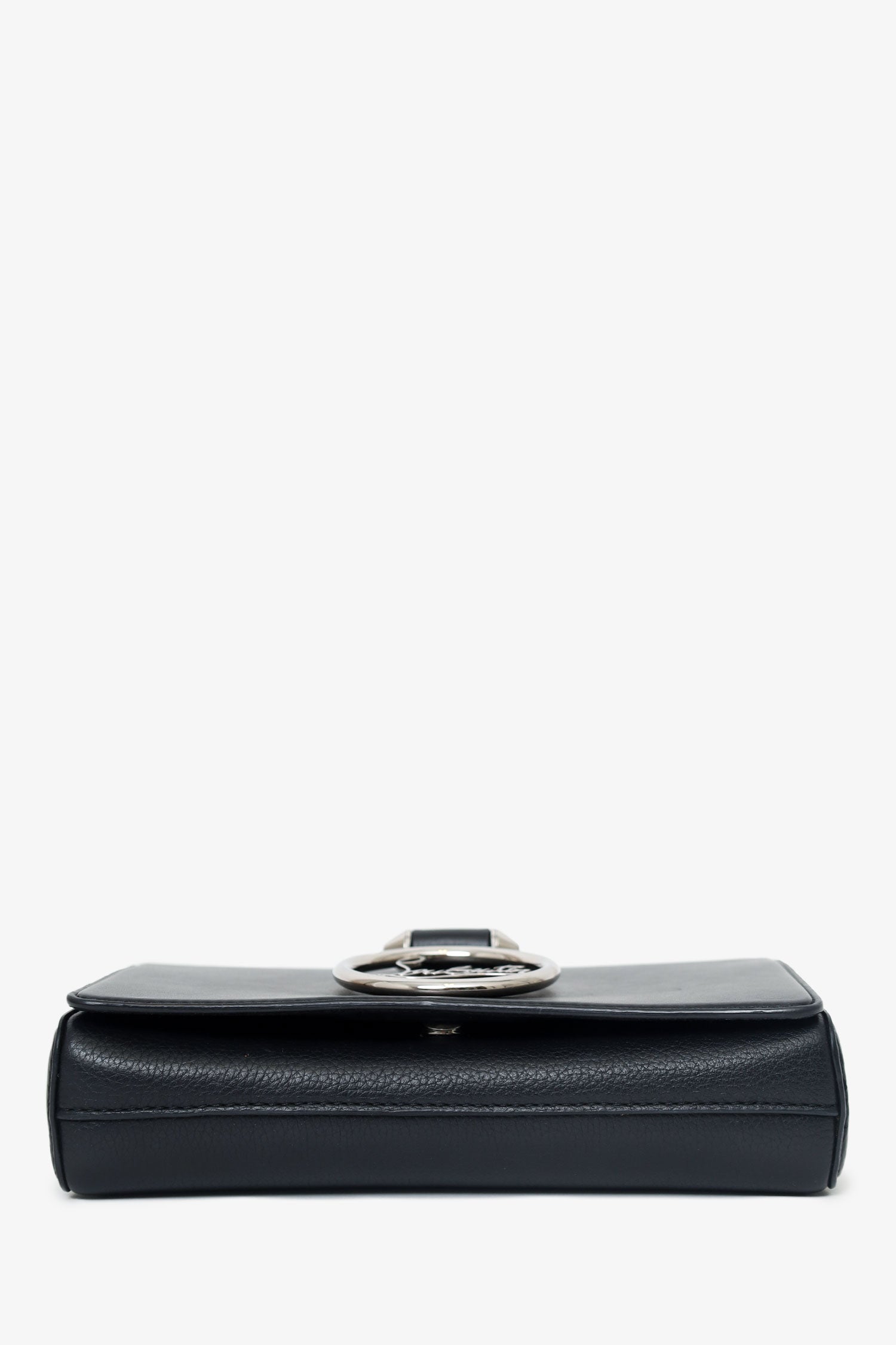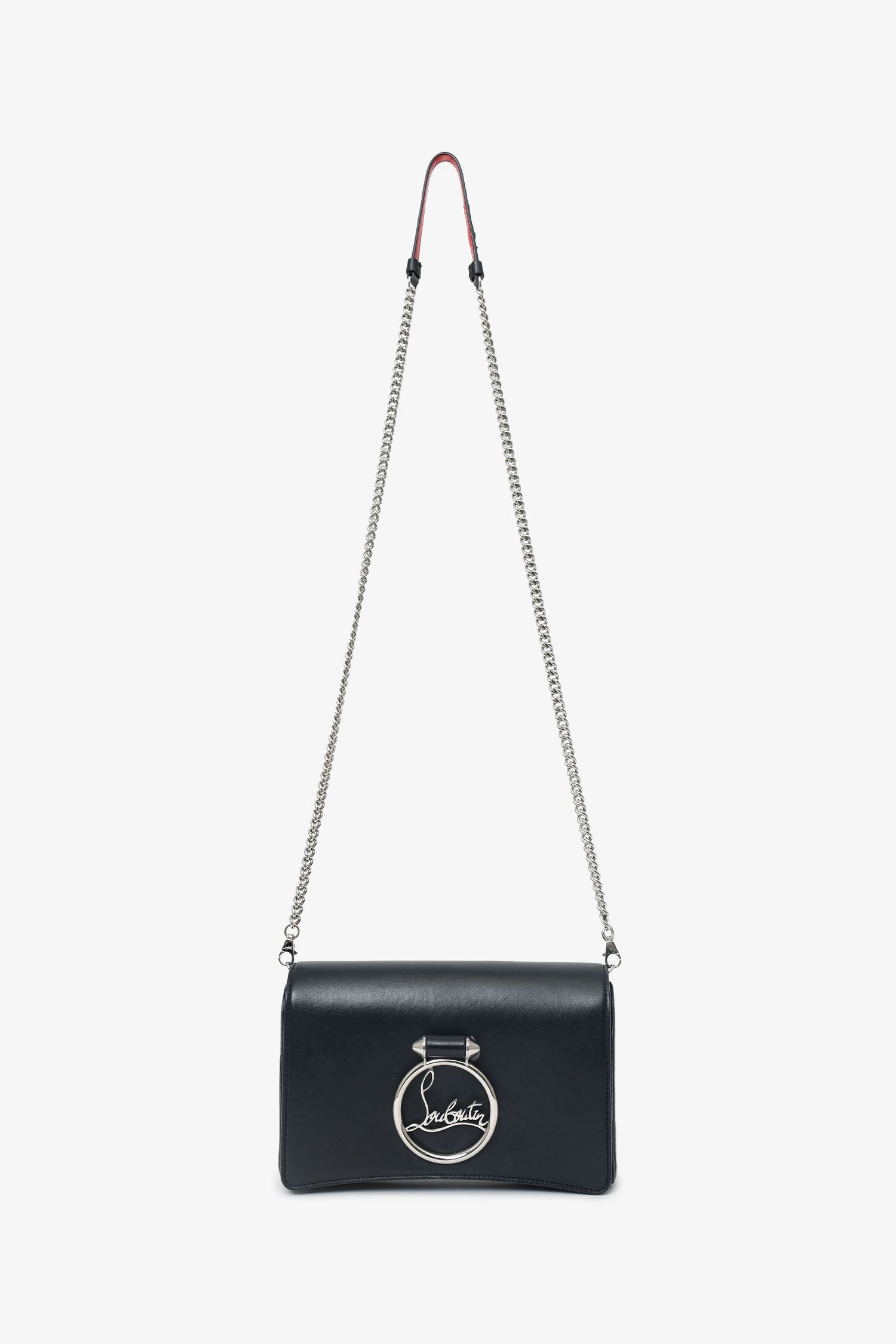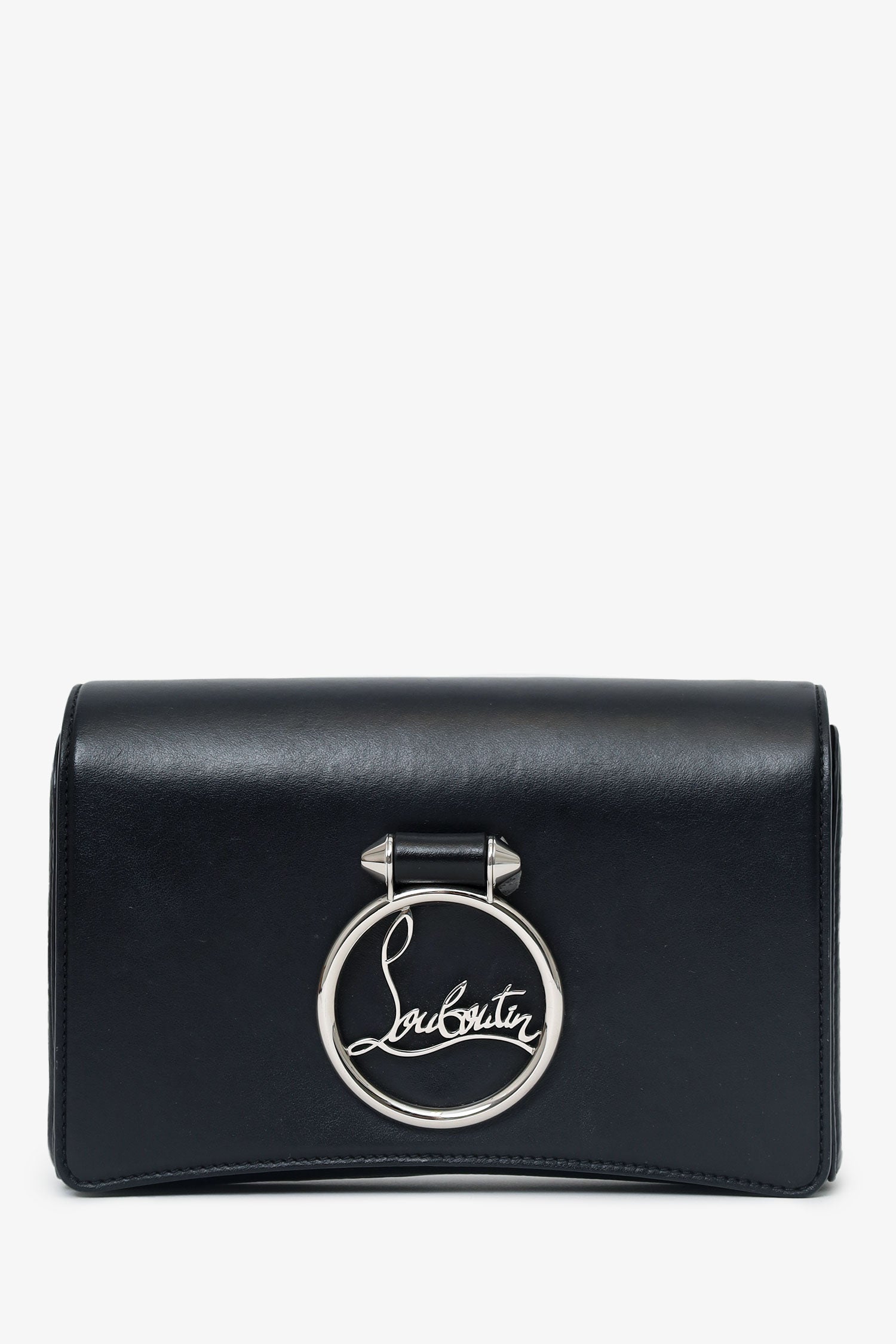 Christian Louboutin Black Leather Rubylou Clutch on Chain. Front fold-over flap with magnetic snap-button closure. Removable chainlink strap with lobster-clasp closure. Logo hardware at front exterior. Single rear exterior slip pocket. Leather-lined interior. 6 interior card slots and 1 interior bill slot. Silver-tone hardware. Tonal stitching.