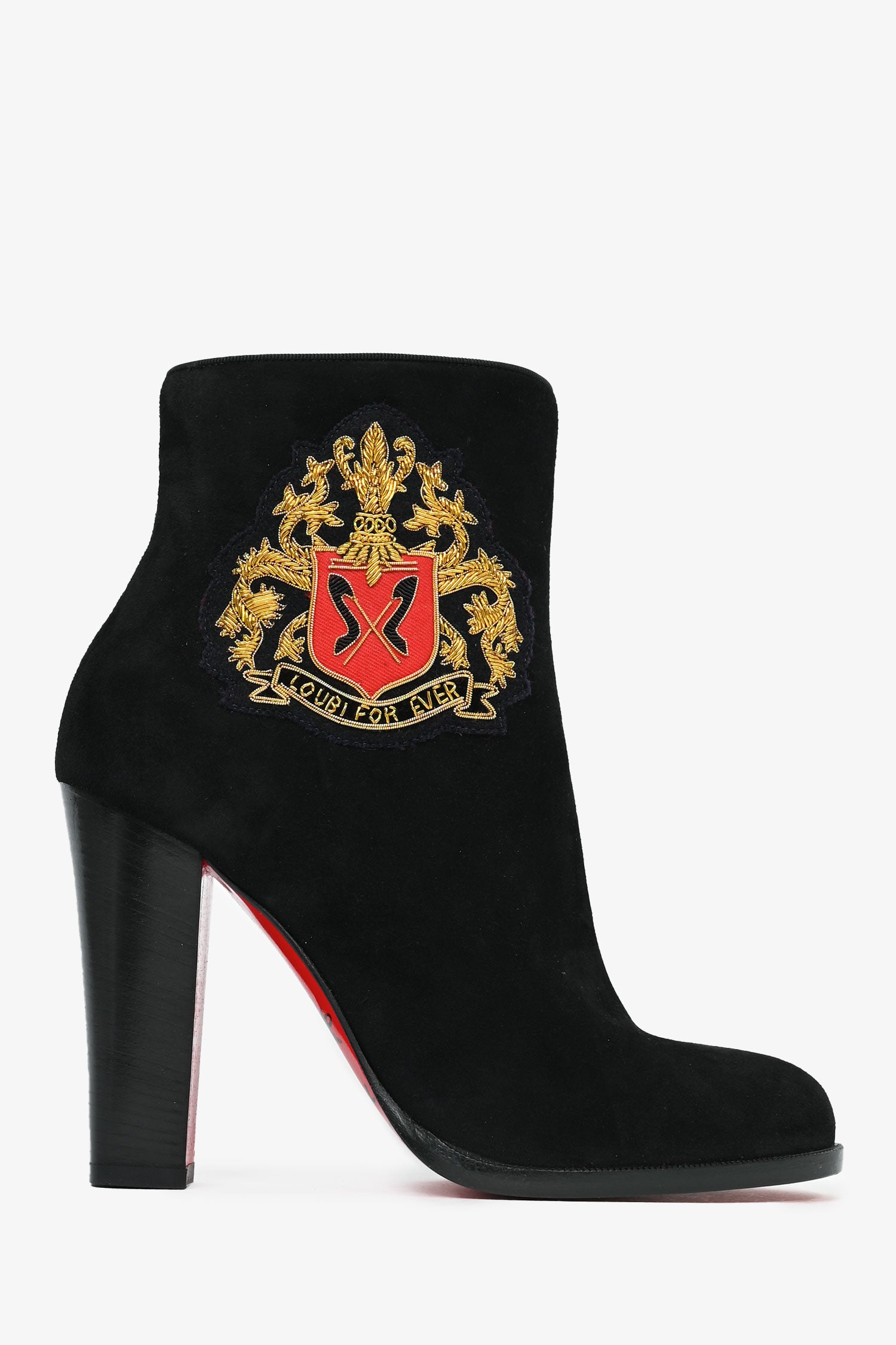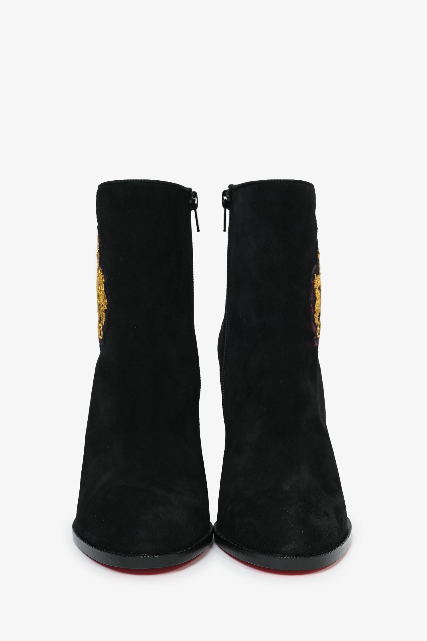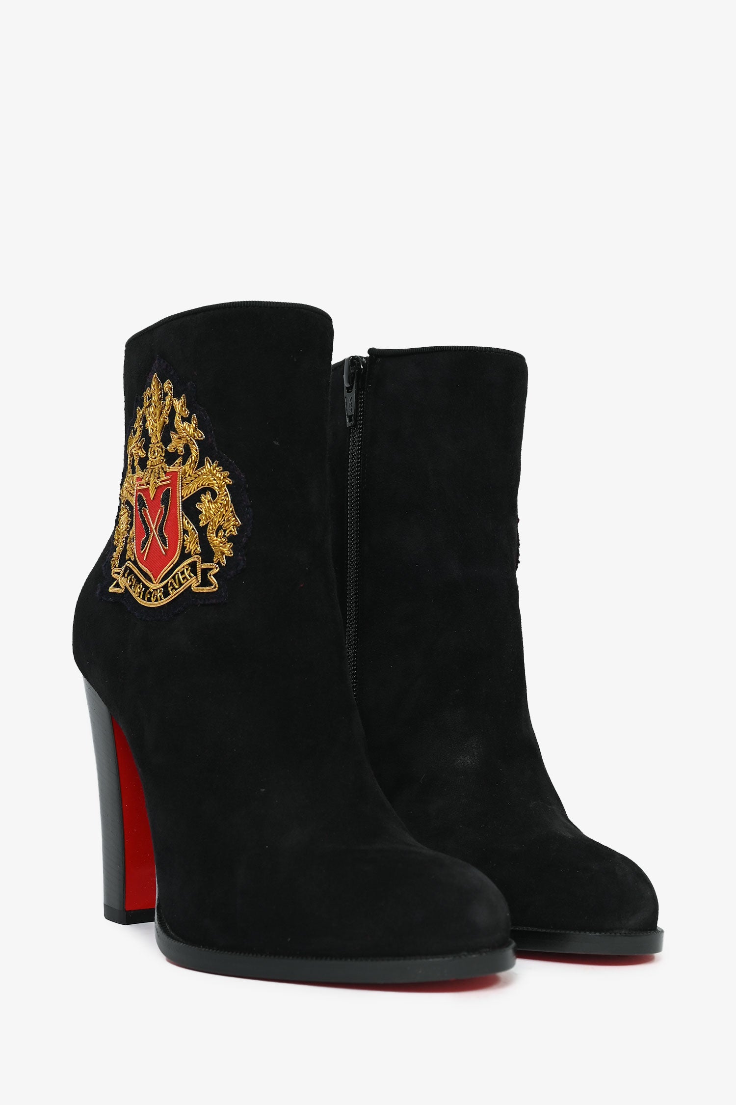 Refresh availabilityChristian Louboutin Black Suede Crest Ankle Boots. Signature red bottoms. Side zip closure.