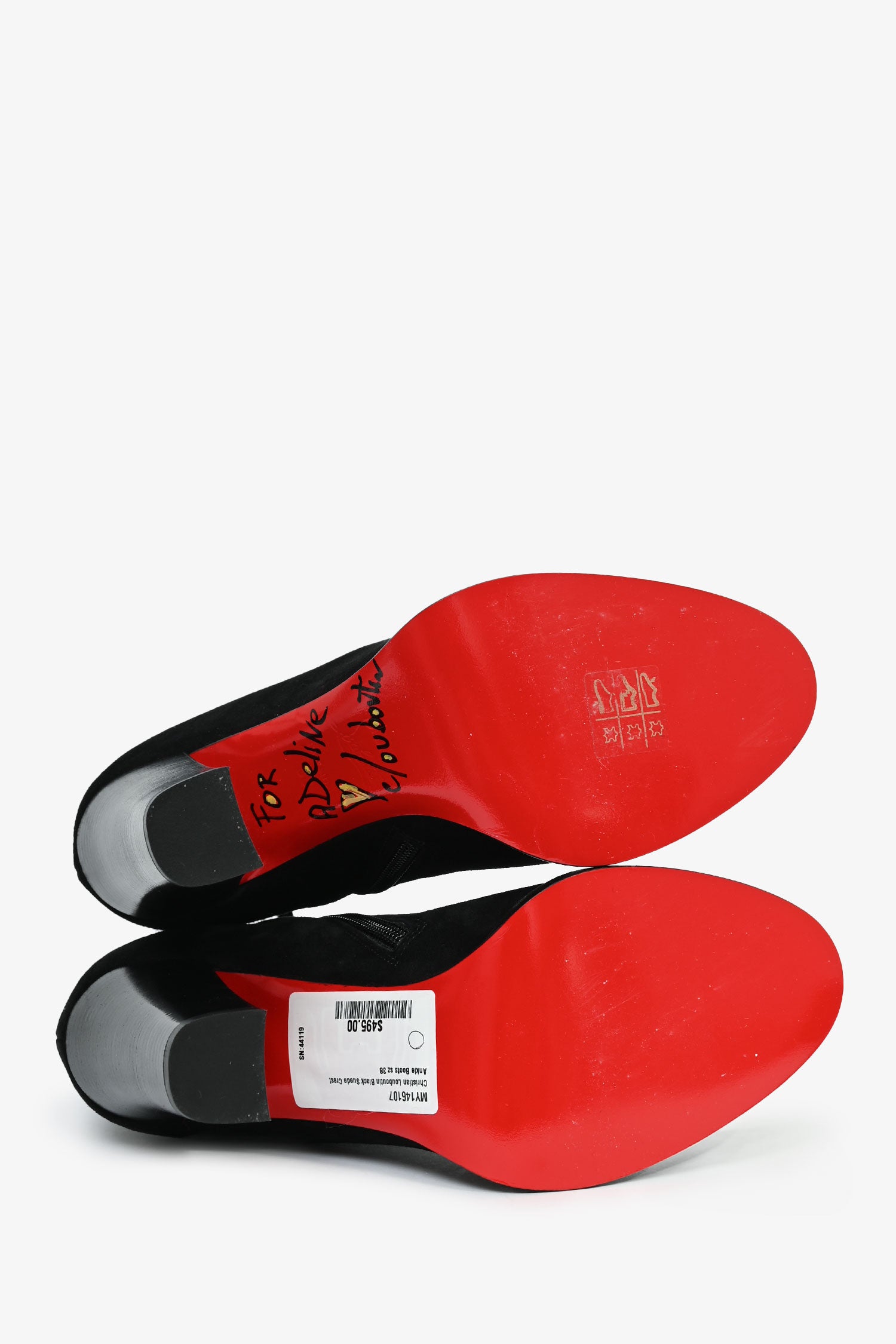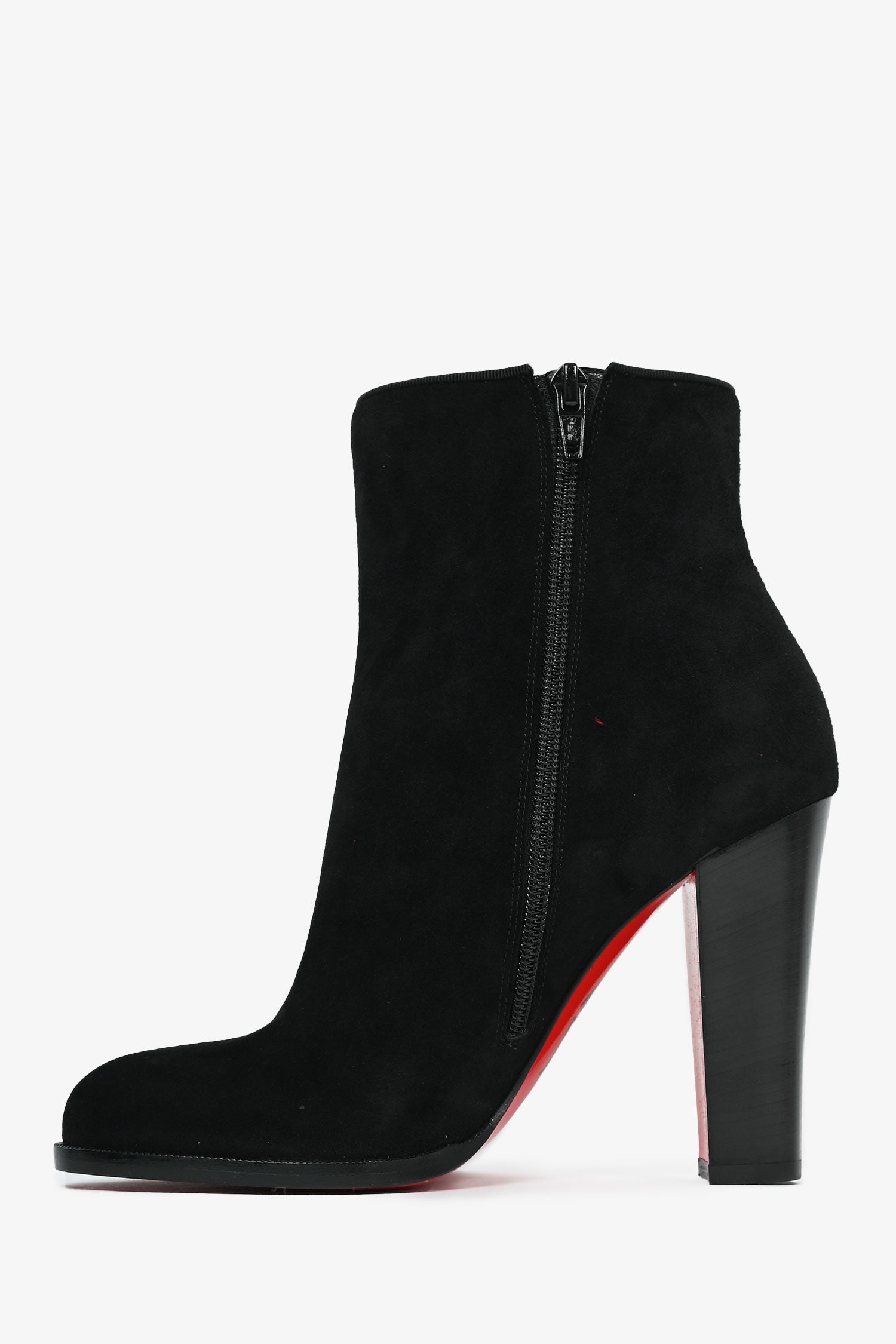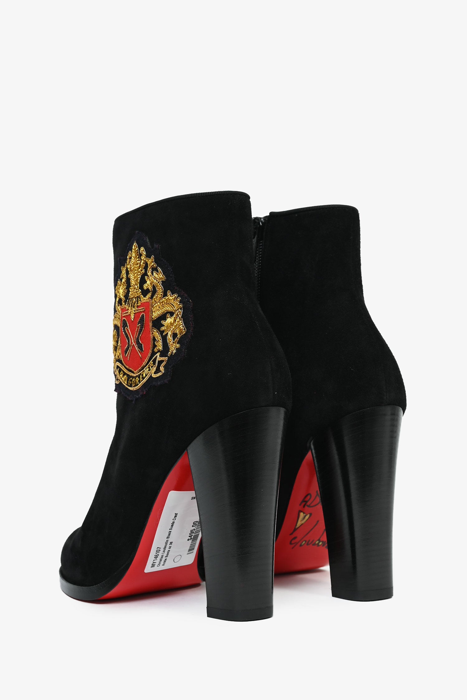 Refresh availabilityChristian Louboutin Black Suede Crest Ankle Boots. Signature red bottoms. Side zip closure.