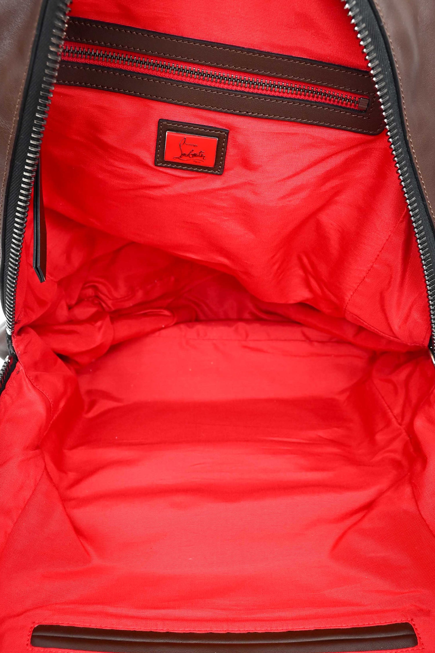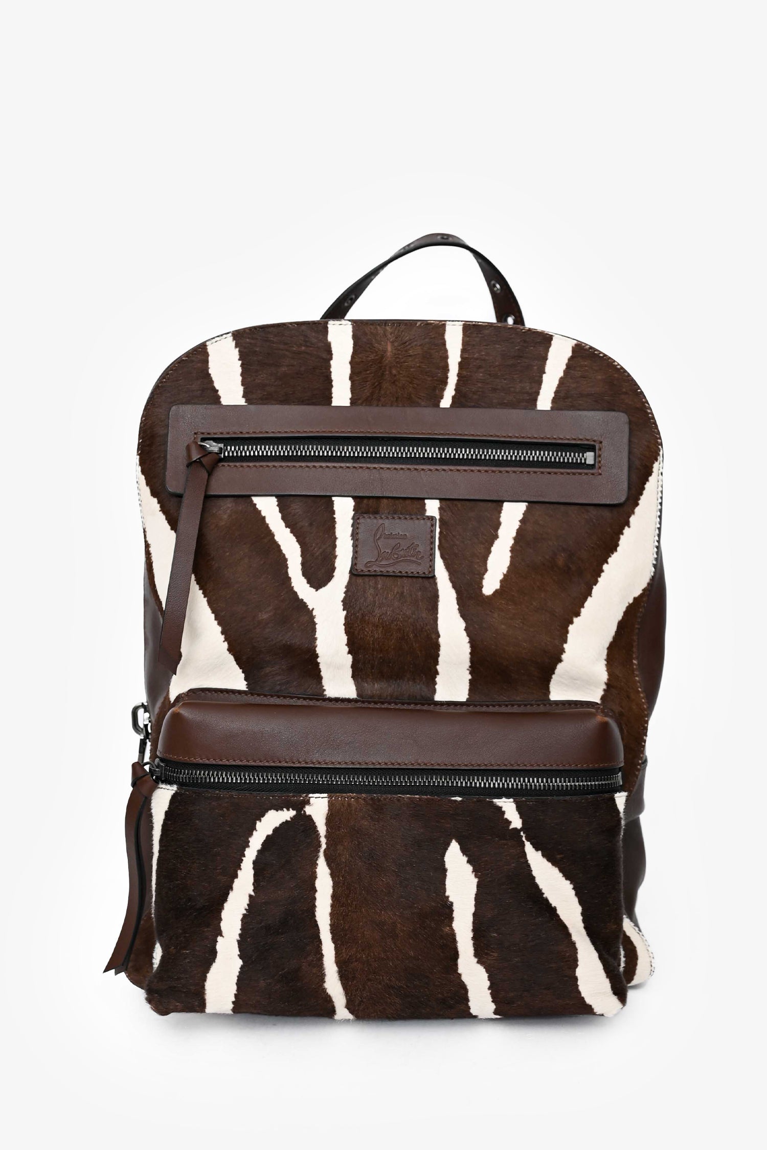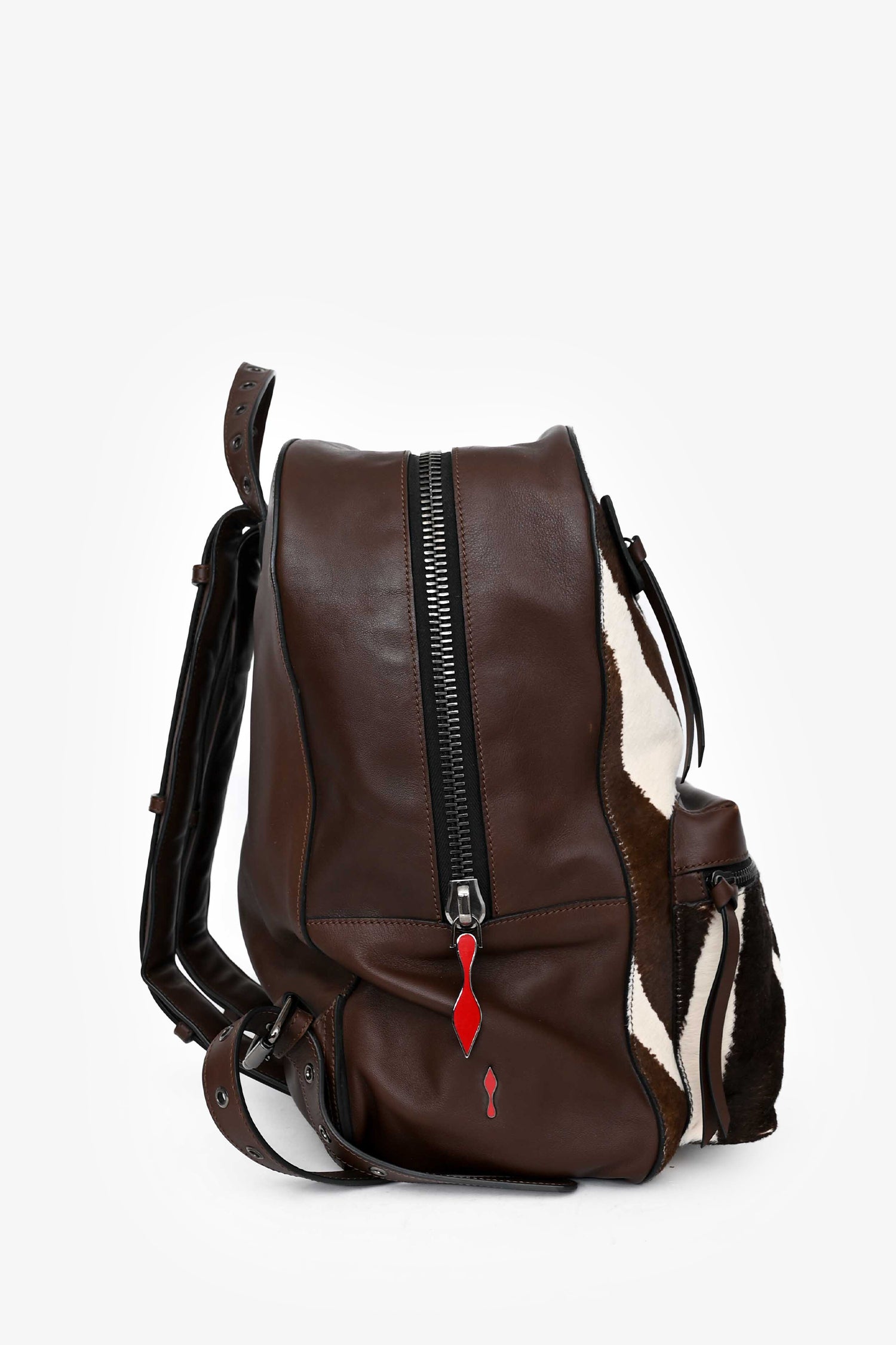 Refresh availabilityChristian Louboutin Brown Ponyhair Calfskin Backpack. Two front zip pocket. One-way zip-around main compartment. Adjustable leather shoulder straps. Signature red interior lining. Interior zipped and slip pocket. Tonal stitching.