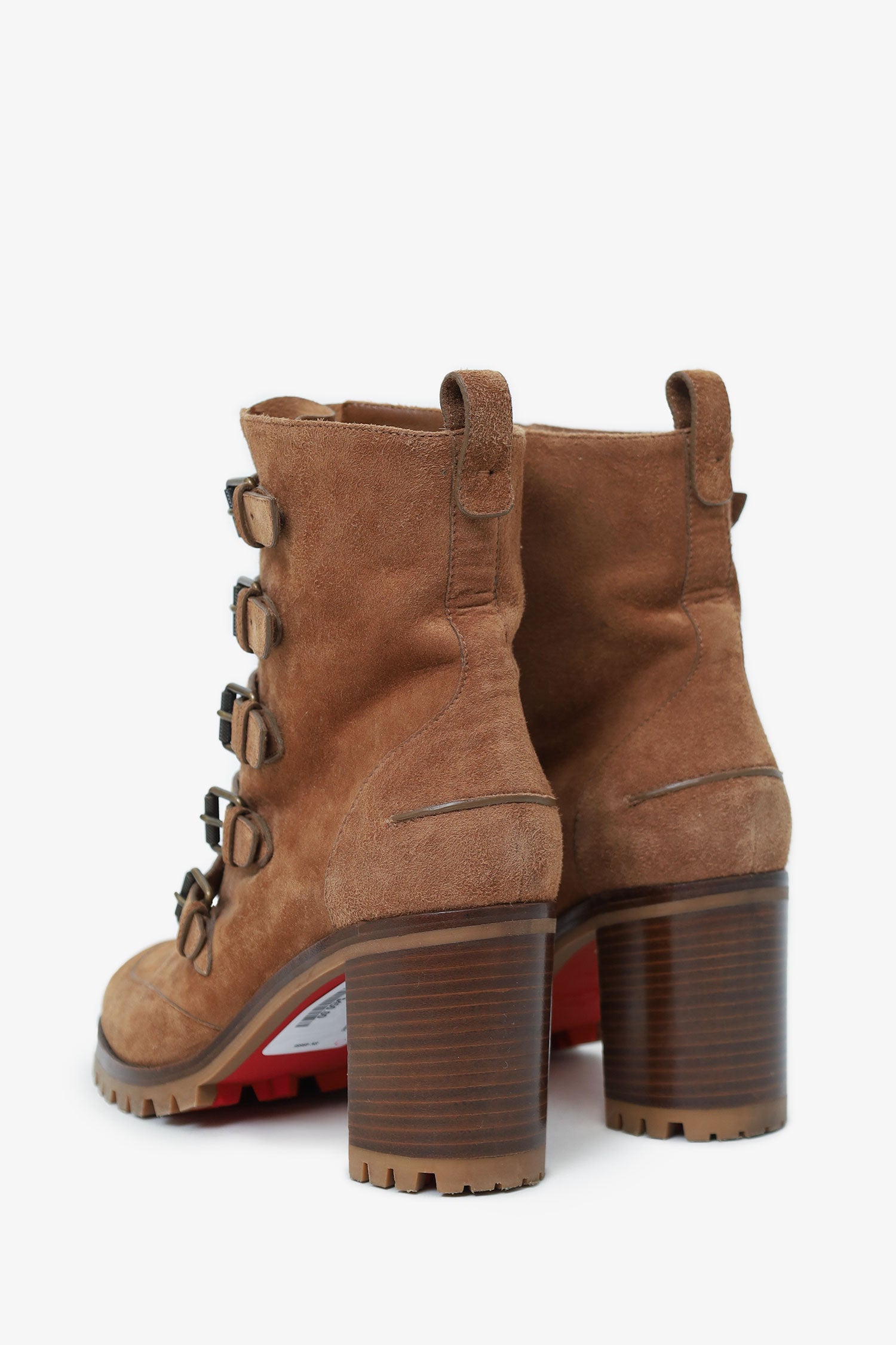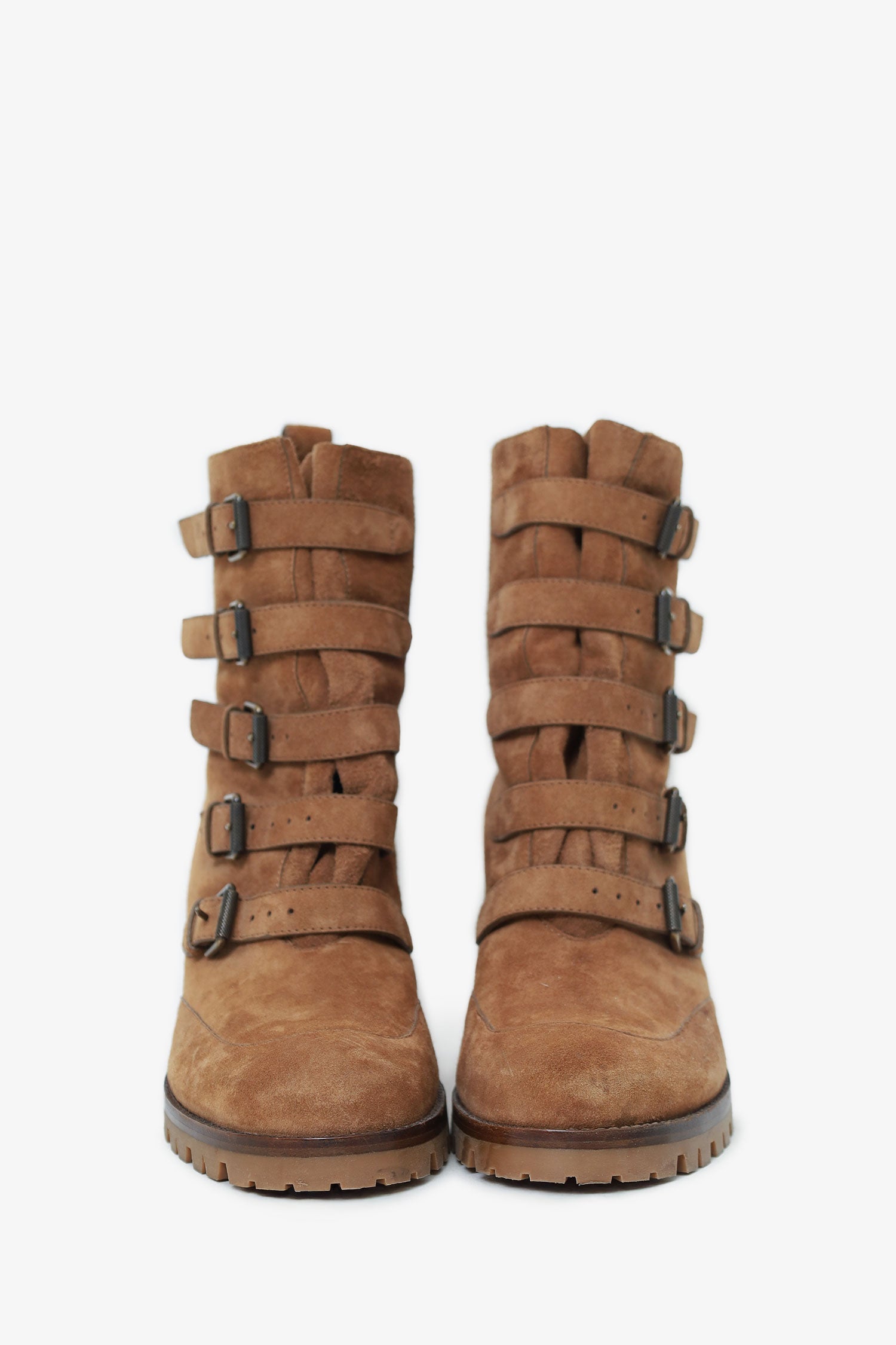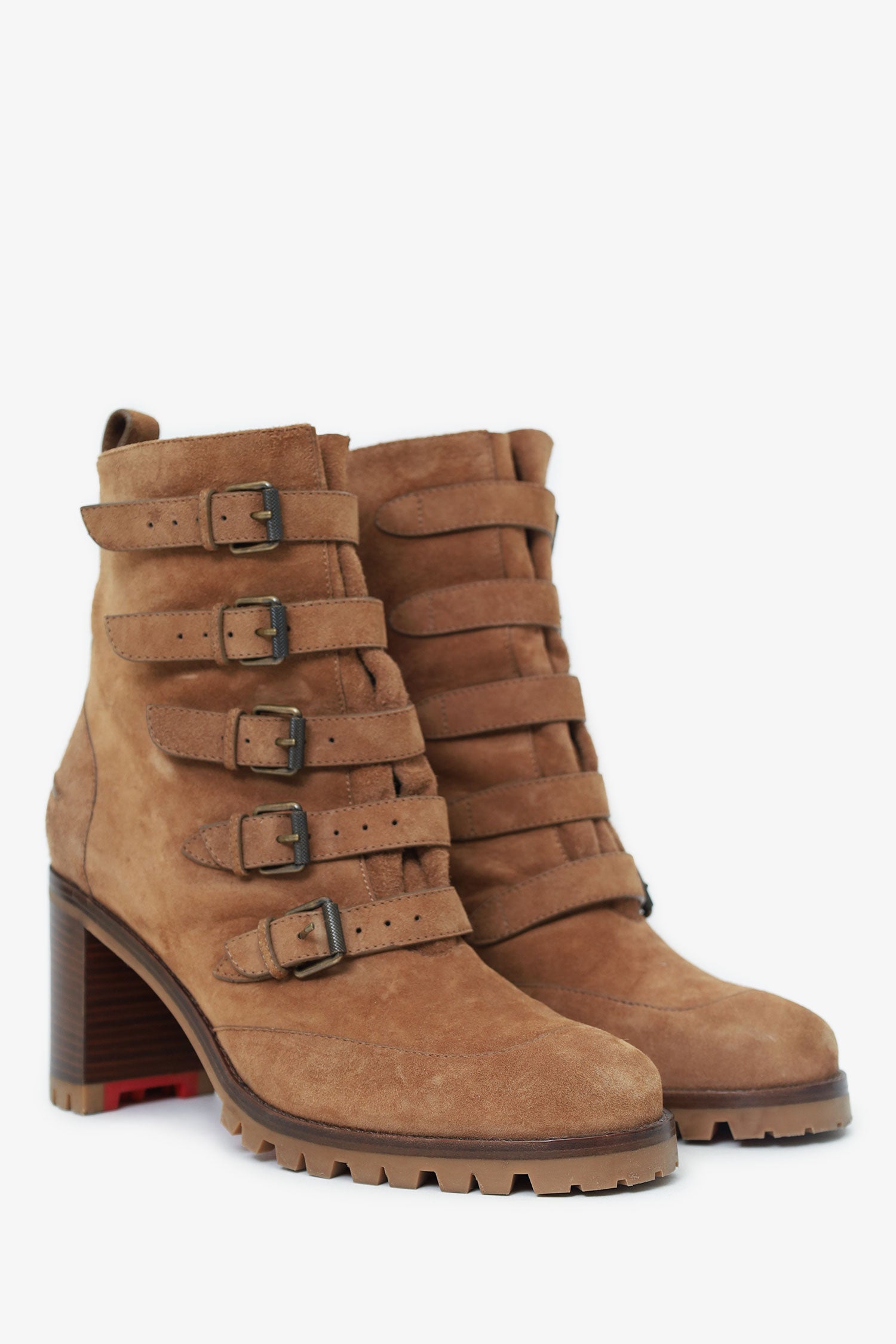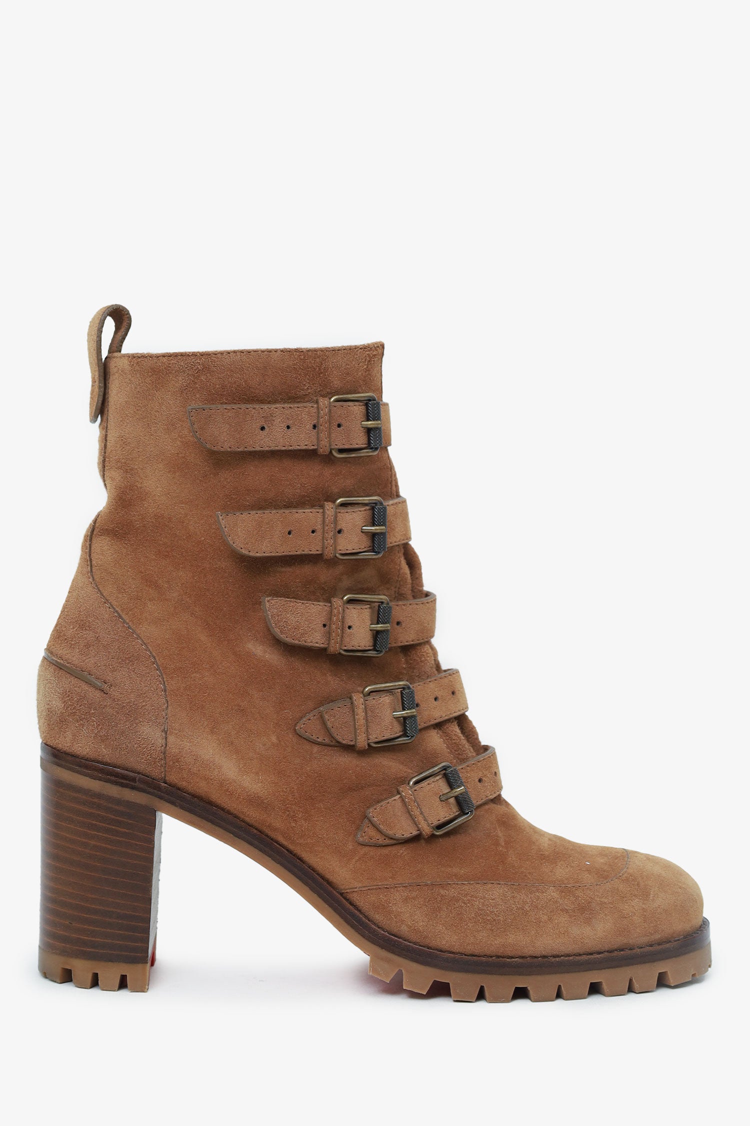 Refresh availabilityChristian Louboutin Brown Suede Buckled Who Walks Ankle Boots. Pull-on. Pointed-round toe. 5 front straps with buckle closure. Leather-lined interior. Rear pull-tabs. Bronze-tone hardware. Tonal stitching.