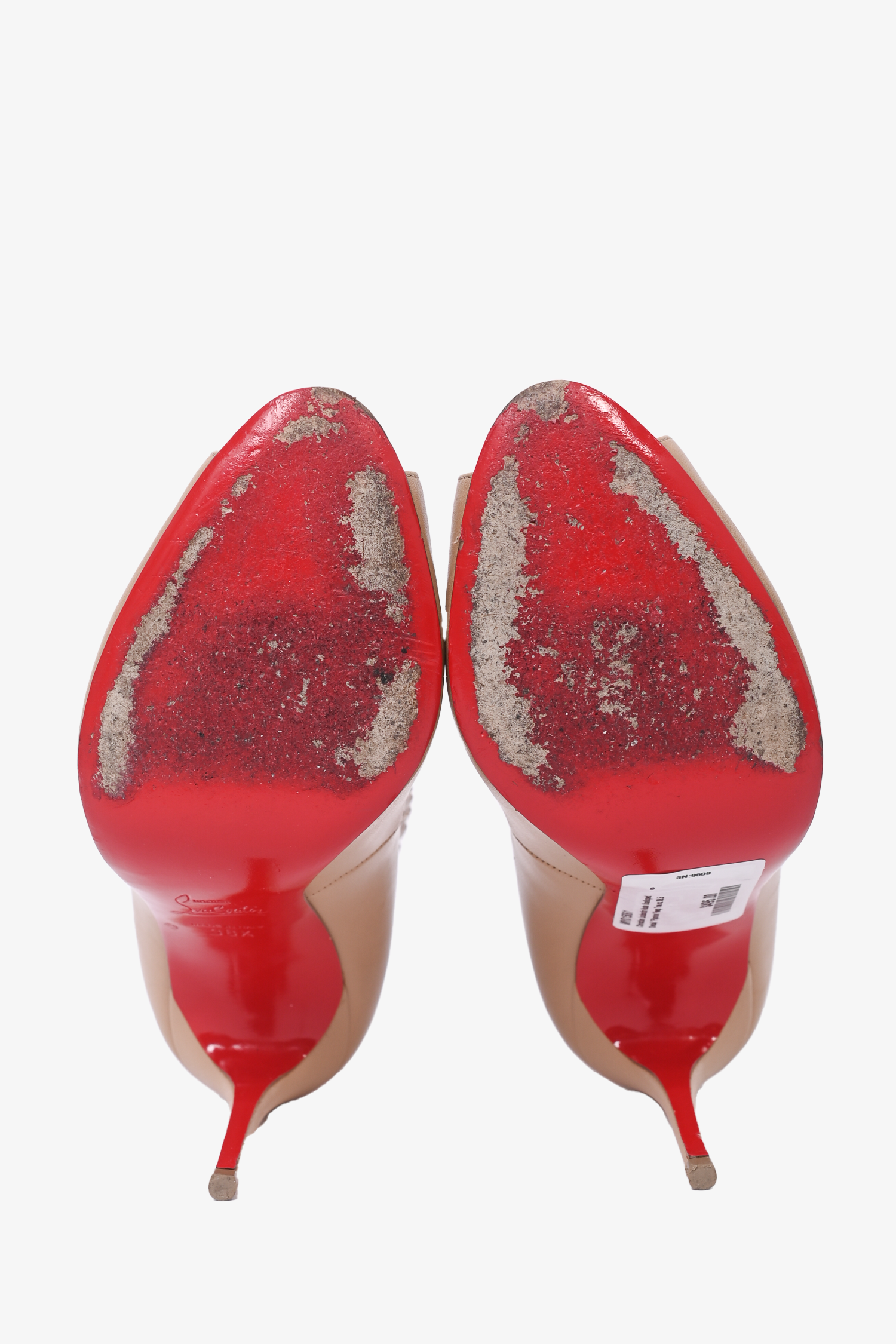 Refresh availabilityChristian Louboutin Nude Scalloped Detail 'Pijonina' Peep Toe. Signature red bottoms. Slip-on. Tonal stitching.