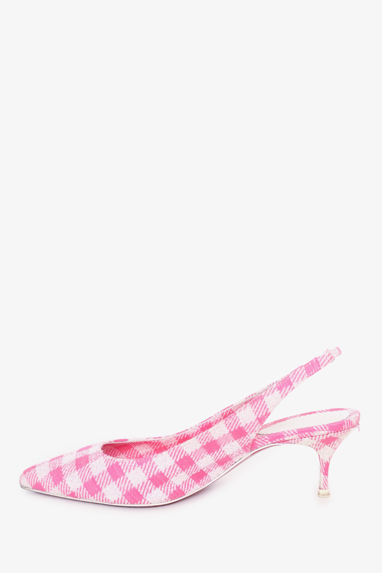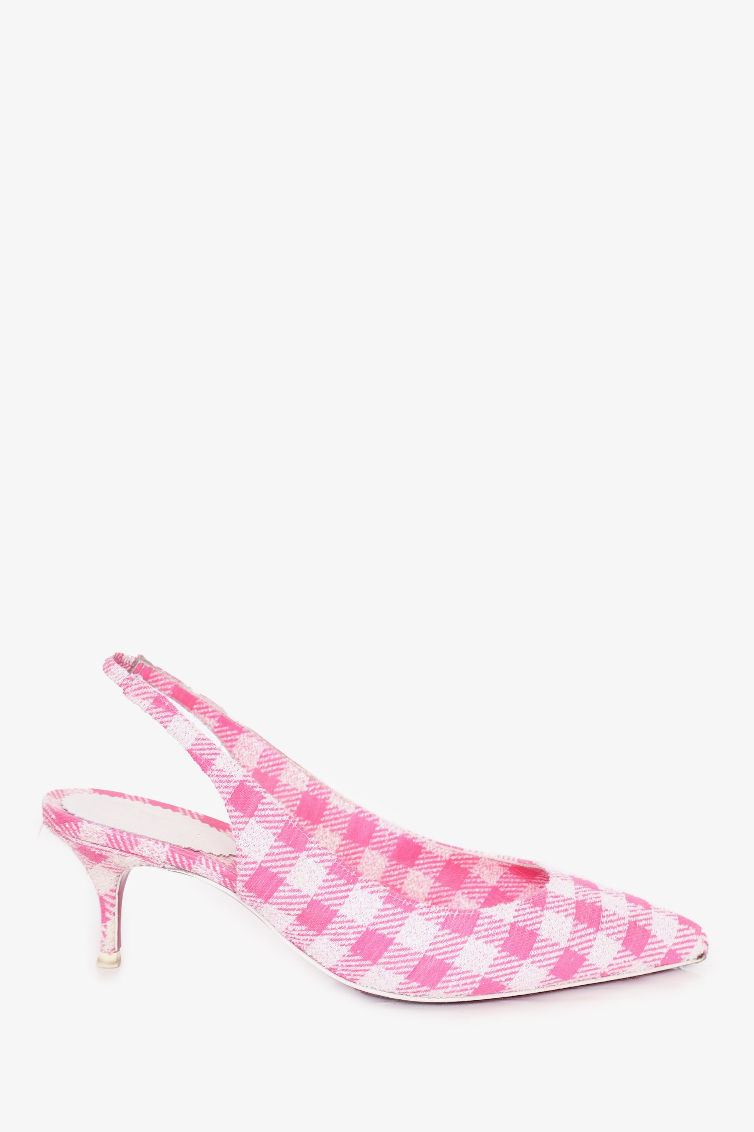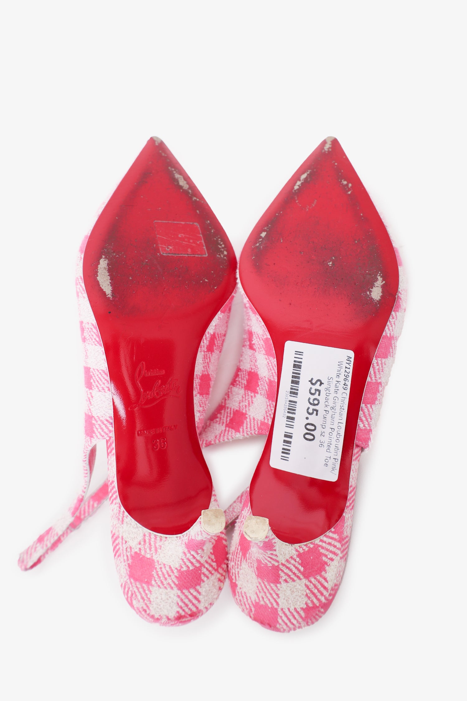 Refresh availabilityChristian Louboutin Pink/White Kate Gingham Pointed Toe Slingback Pump. Signature red bottoms. Slip-on. Pointed toe. Tonal stitching. Topy soles.
