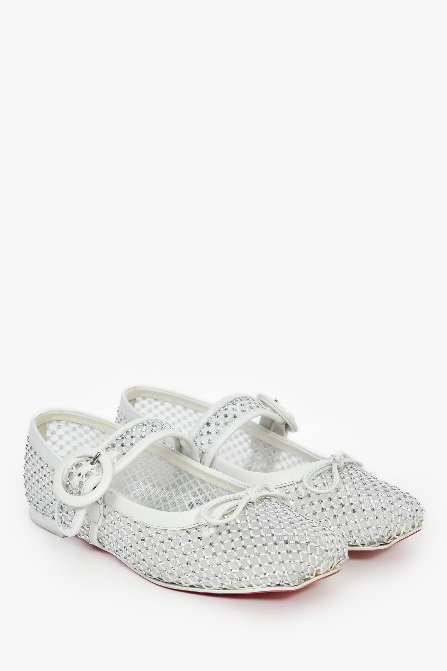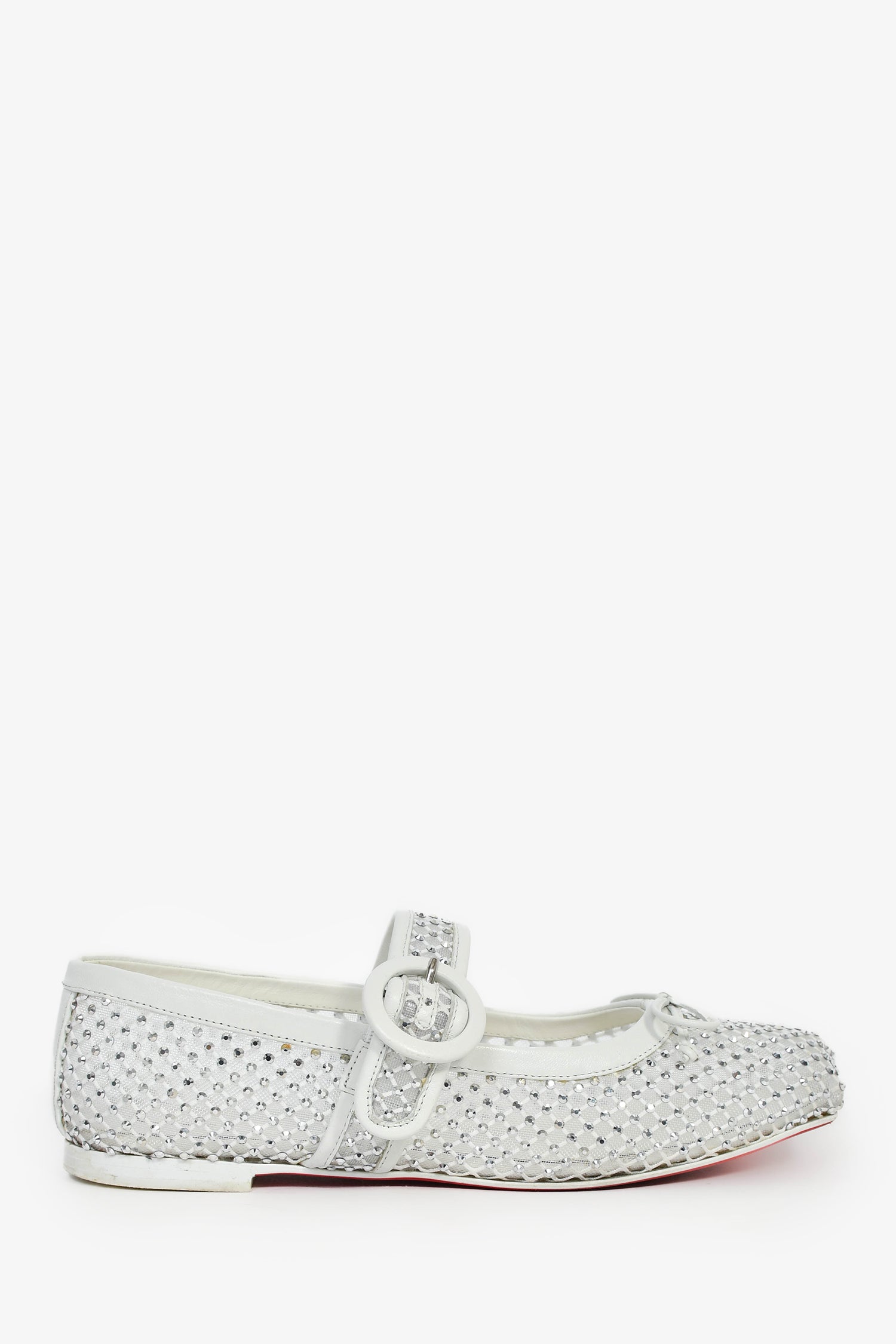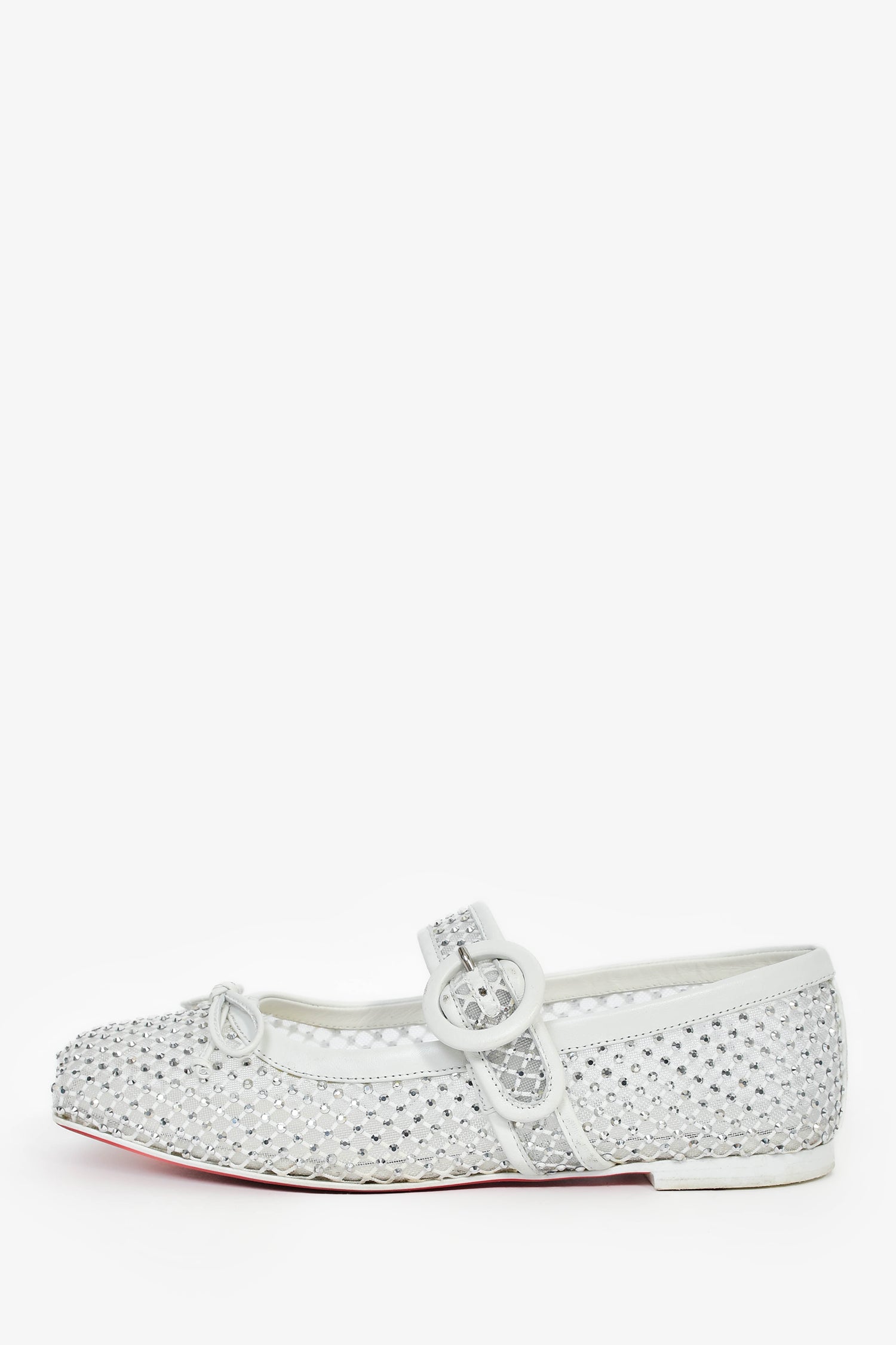 Refresh availabilityChristian Louboutin White Crystal Mesh Mary Jane Ballet Flats. Square toe. Adjustable buckle strap. Leather insole.