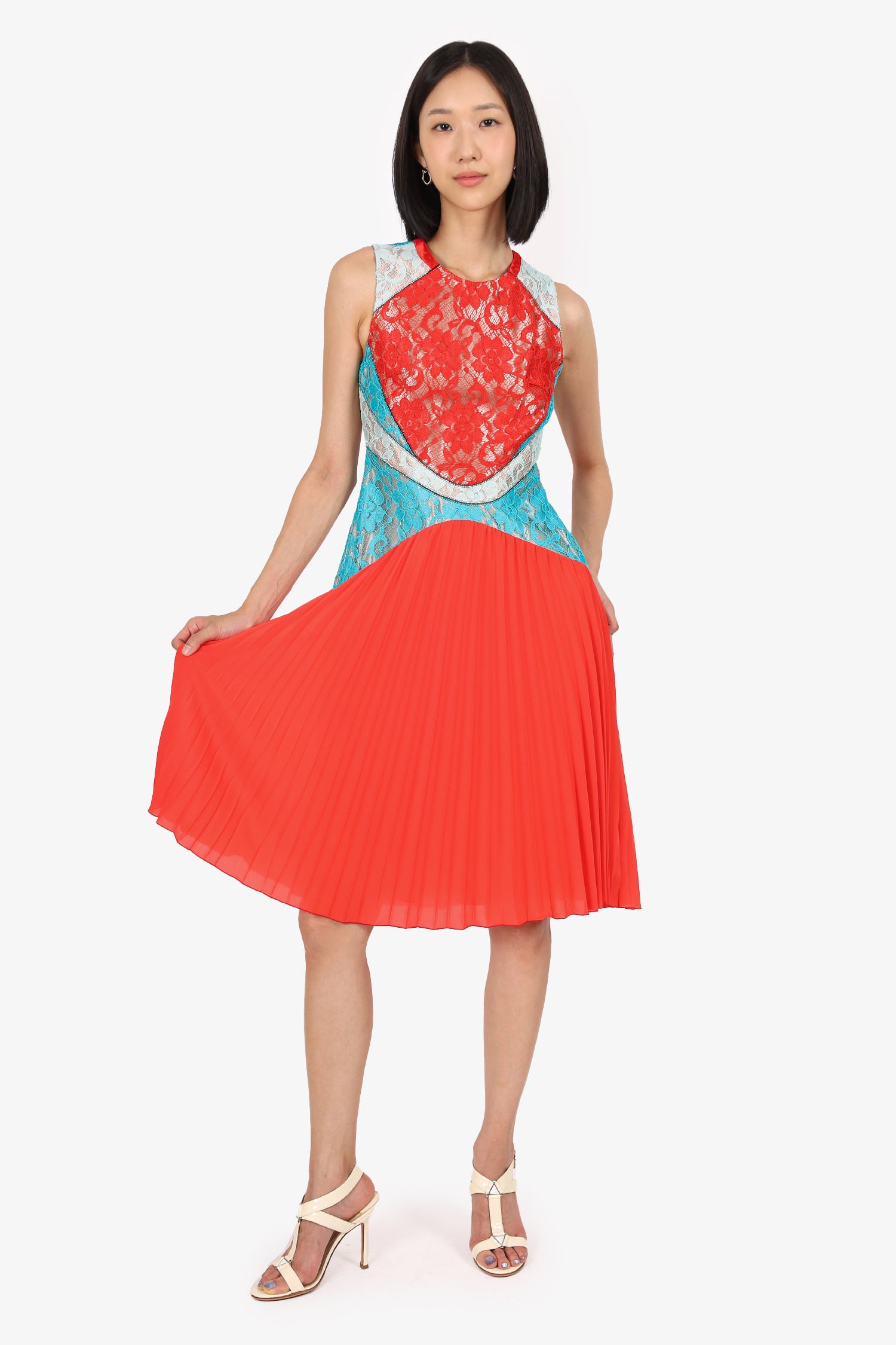 Refresh availabilityChristopher Kane Orange/Blue Lace Pleated Sleeveless Midi Dress. Slip-on. Round neckline. Rear zip and hook closure. Lined interior. Tonal stitching.