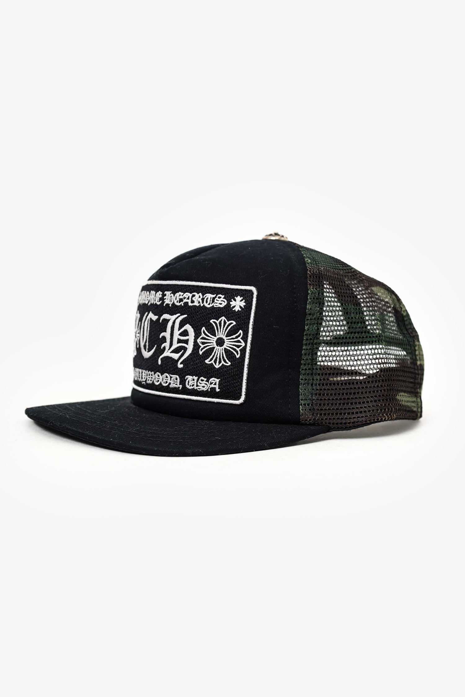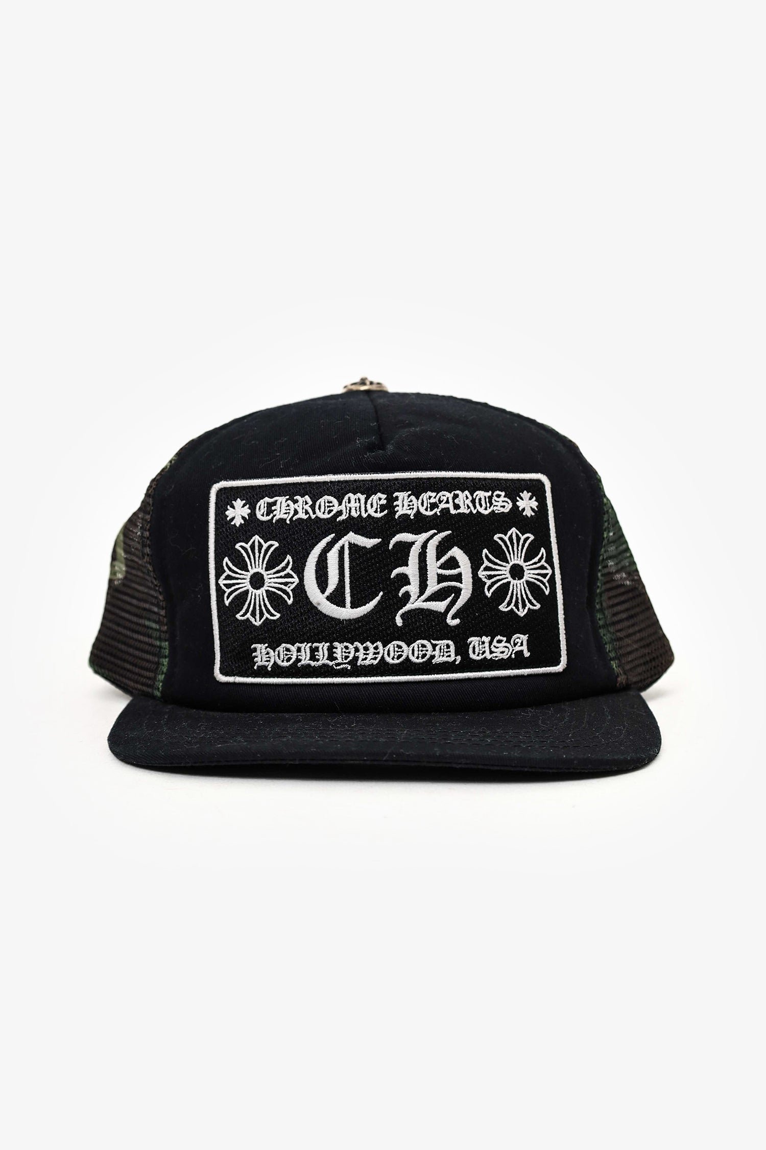 Chrome Hearts Black Hollywood Logo Trucker Hat. Rear adjustable strap with snap closure. Rear camo pattern. Silver-tone hardware. Tonal stitching.