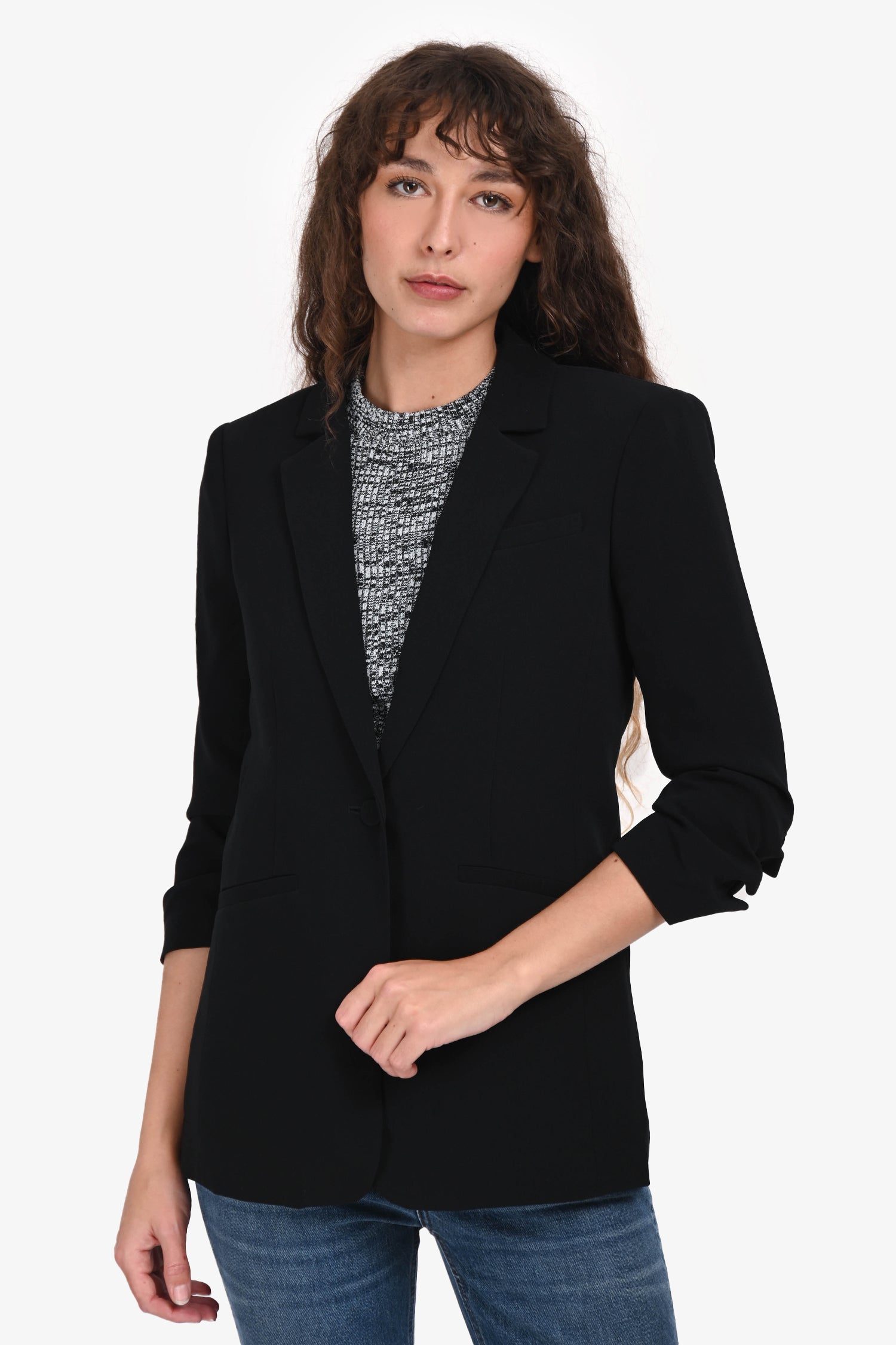 Refresh availabilityCinq a Sept Black Ruched Sleeve 'Khloe' Blazer. Slip-on. Notched lapels. Single front button closure. Padded shoulders. 3 exterior slip pockets. Sleeve cuffs with button closures. Lined interior. Tonal stitching.