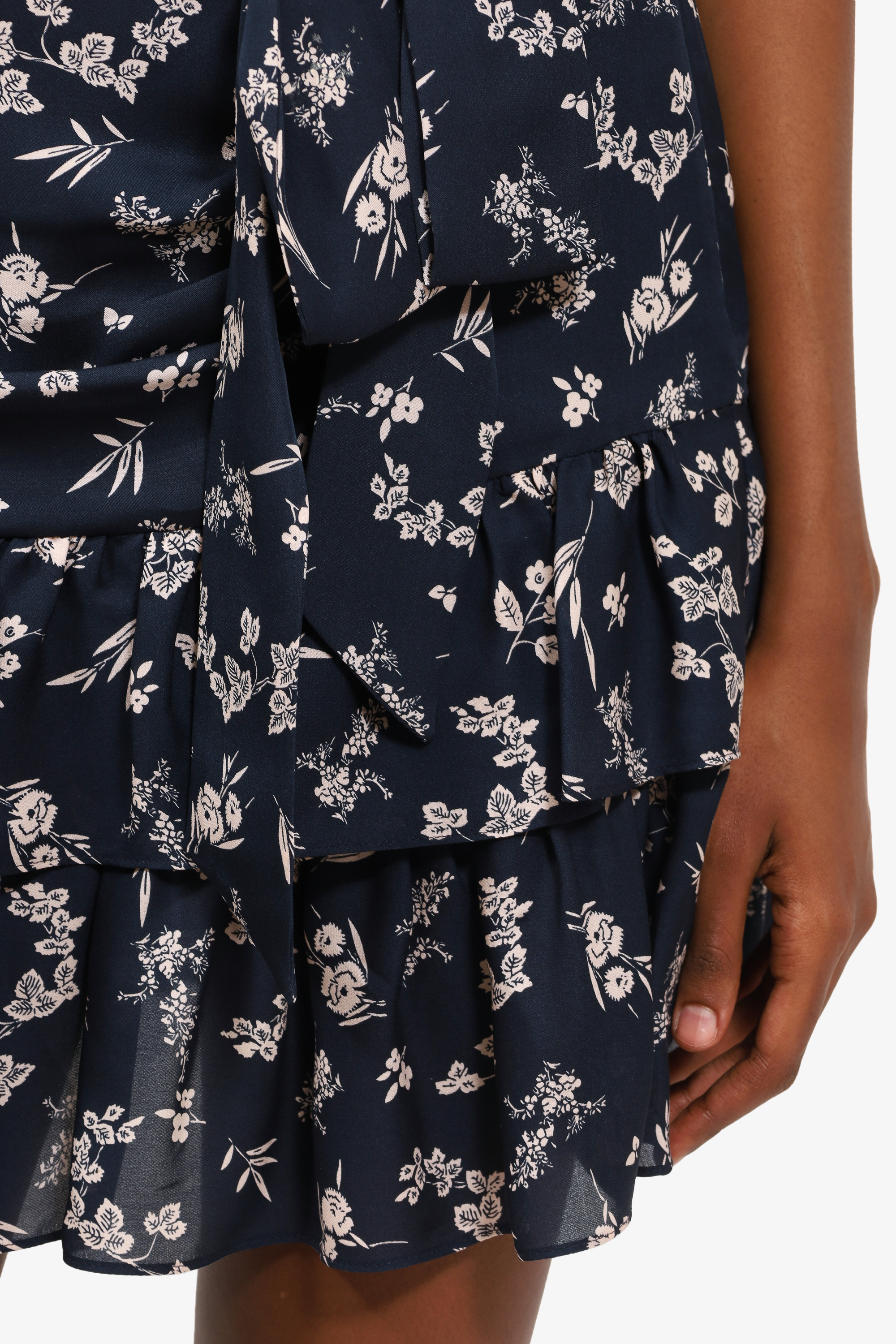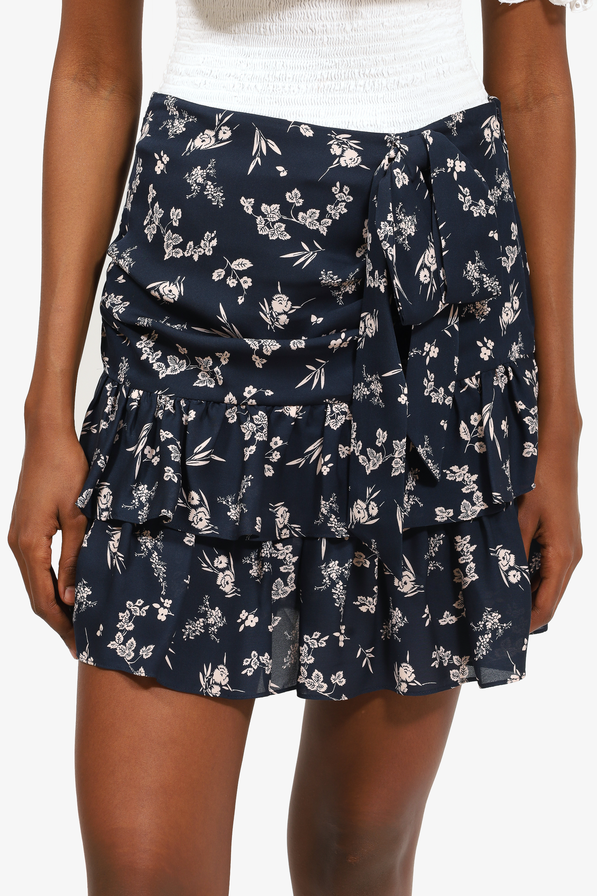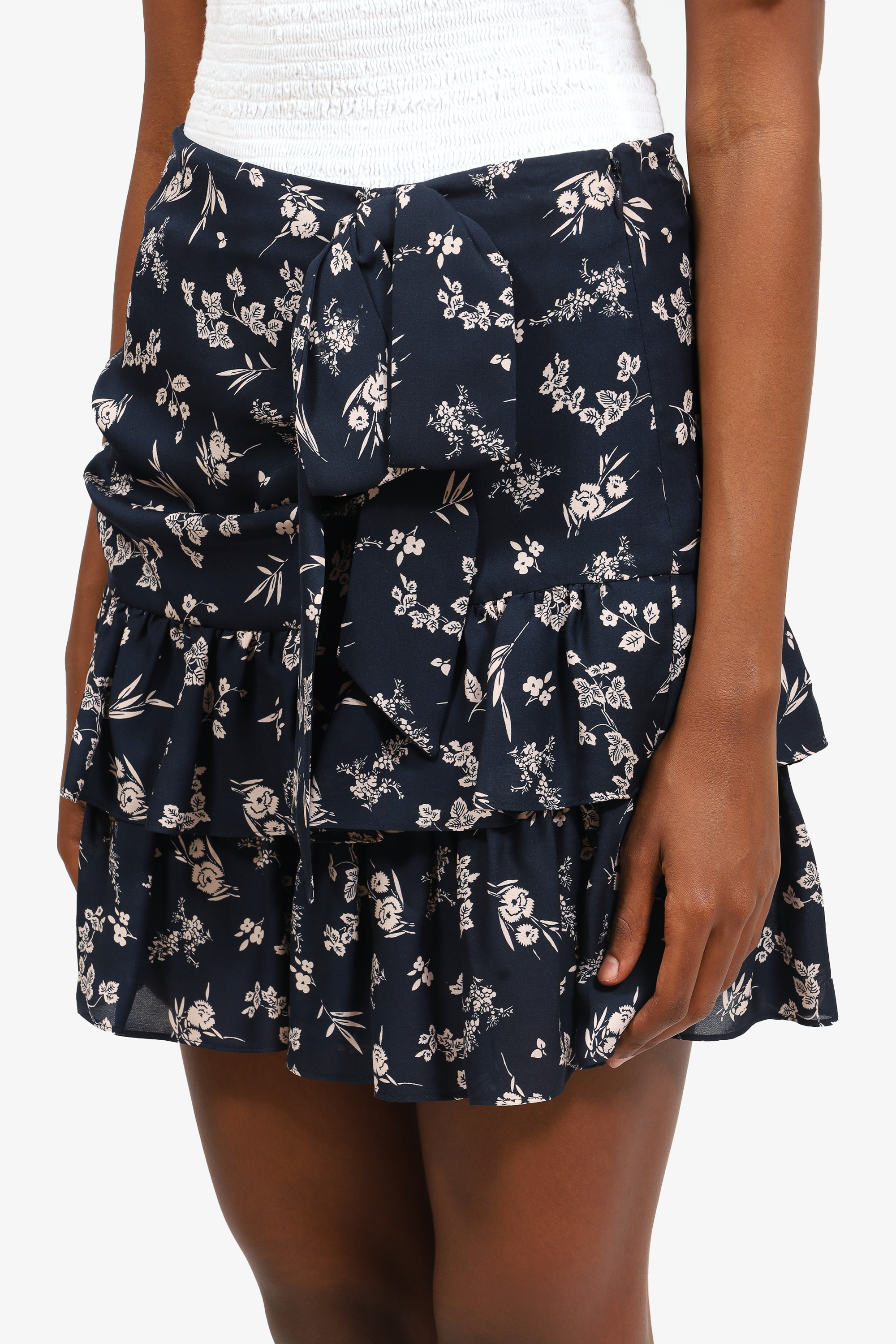 Refresh availabilityCinq a Sept Navy Floral Print Ruffled Mini Skirt. Side zip and hook closure. Partially lined. Tonal stitching.