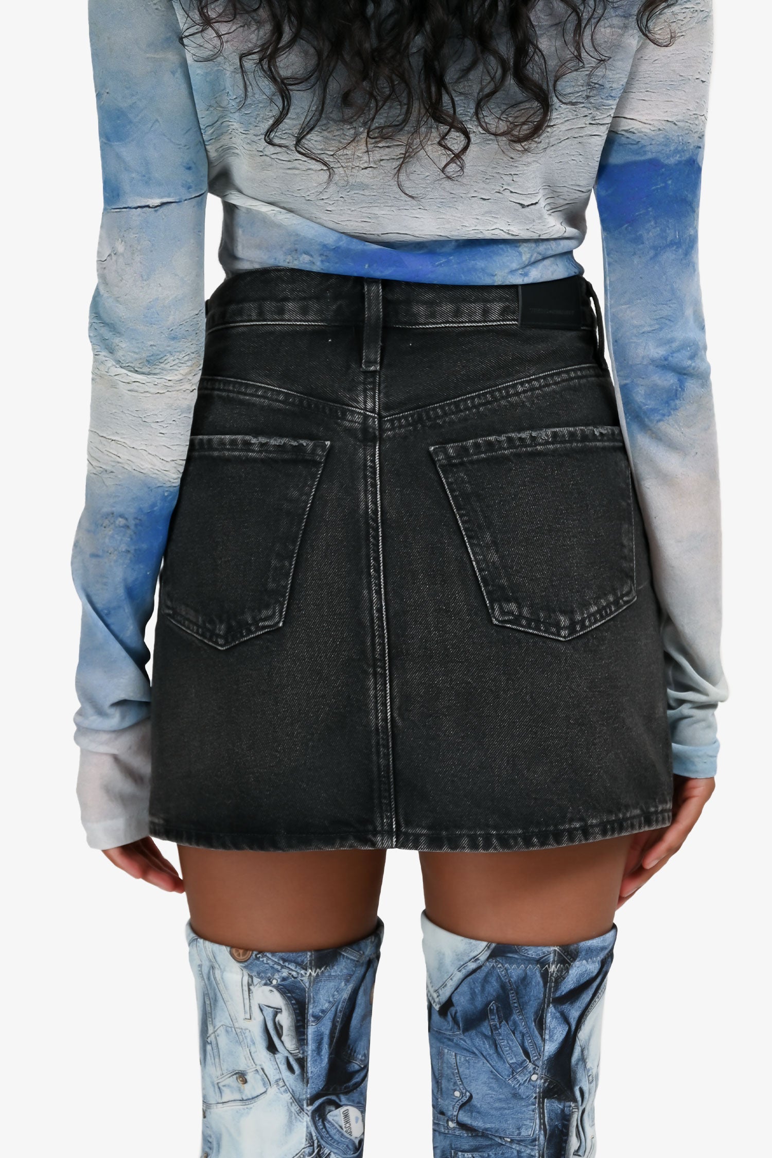 Refresh availabilityCitizens of Humanity Black Denim Mini Skirt. Citizens of Humanity Black Denim Mini Skirt. Classic five-pocket style. Front button and zip closure. Waist belt loops. Tonal stitching.