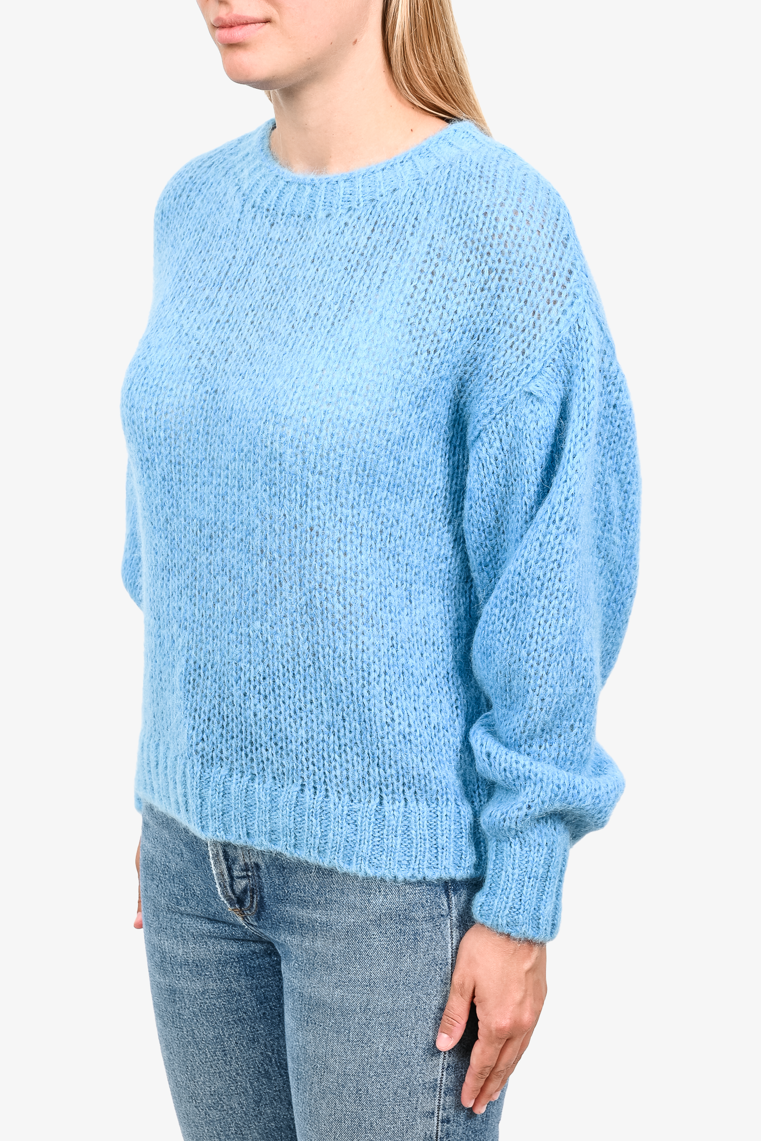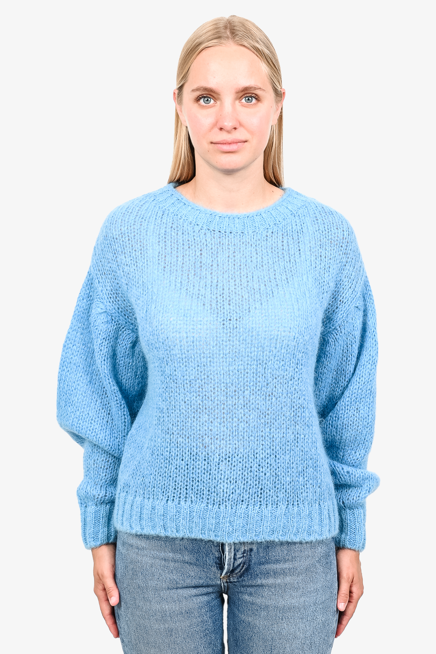 Refresh availabilityClosed Blue Mohair/Alpaca Knit Sweater. Round neck. Pull-on. Ribbed neck, cuffs and hem. Tonal stitching.