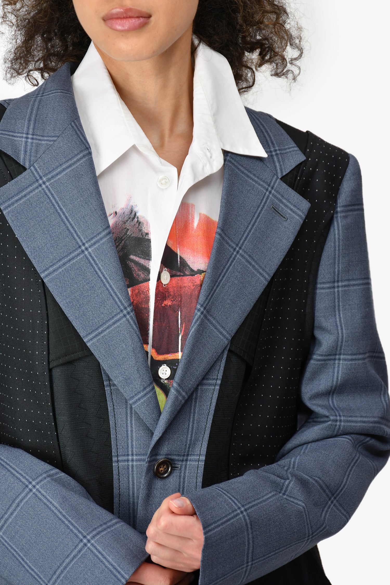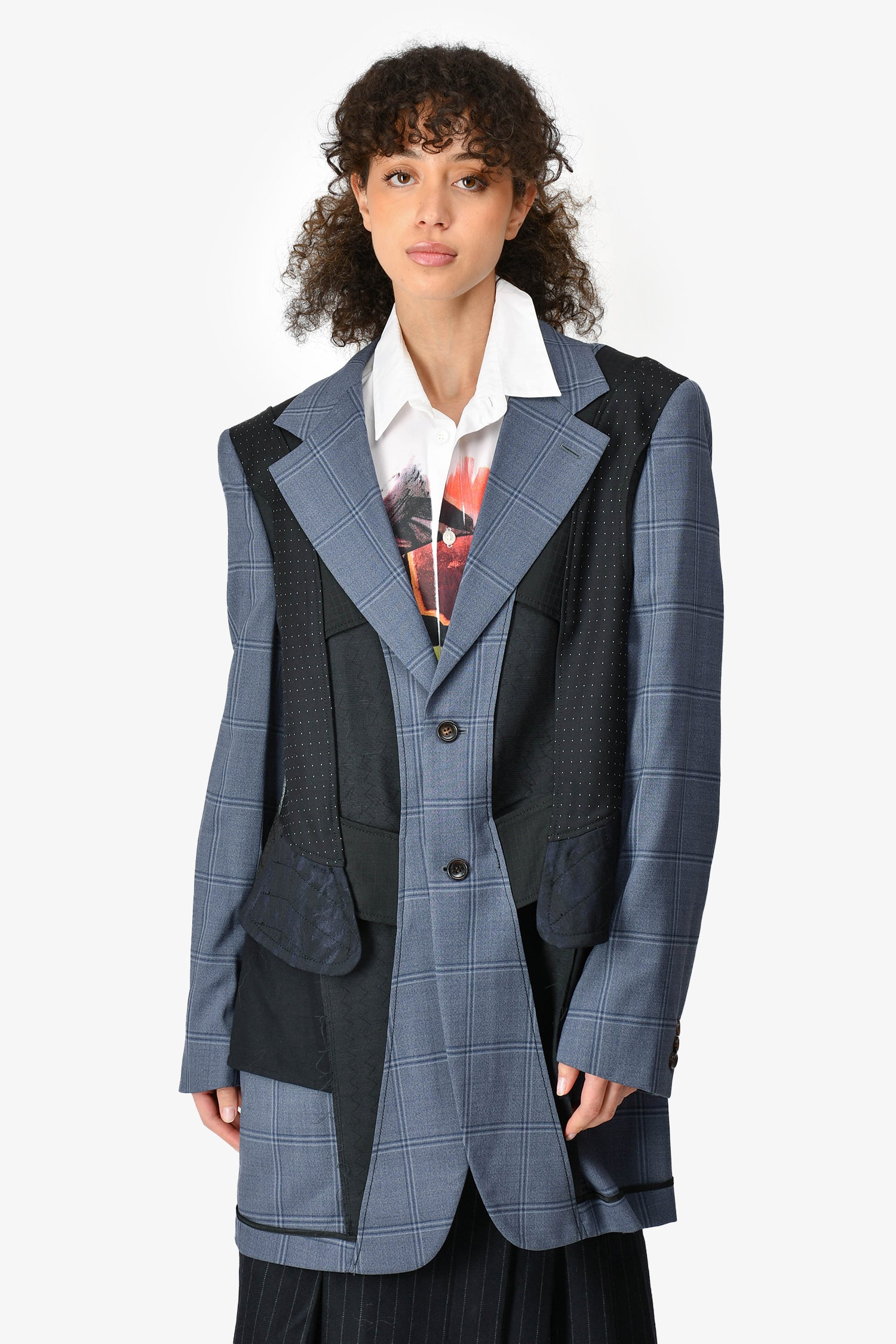 Refresh availabilityComme de Garcon Homme Plus 2019 Blue/Black Wool Deconstructed Evening Coat. Front button-down closure. Two interior flap over pockets. Tonal and contrast stitching.