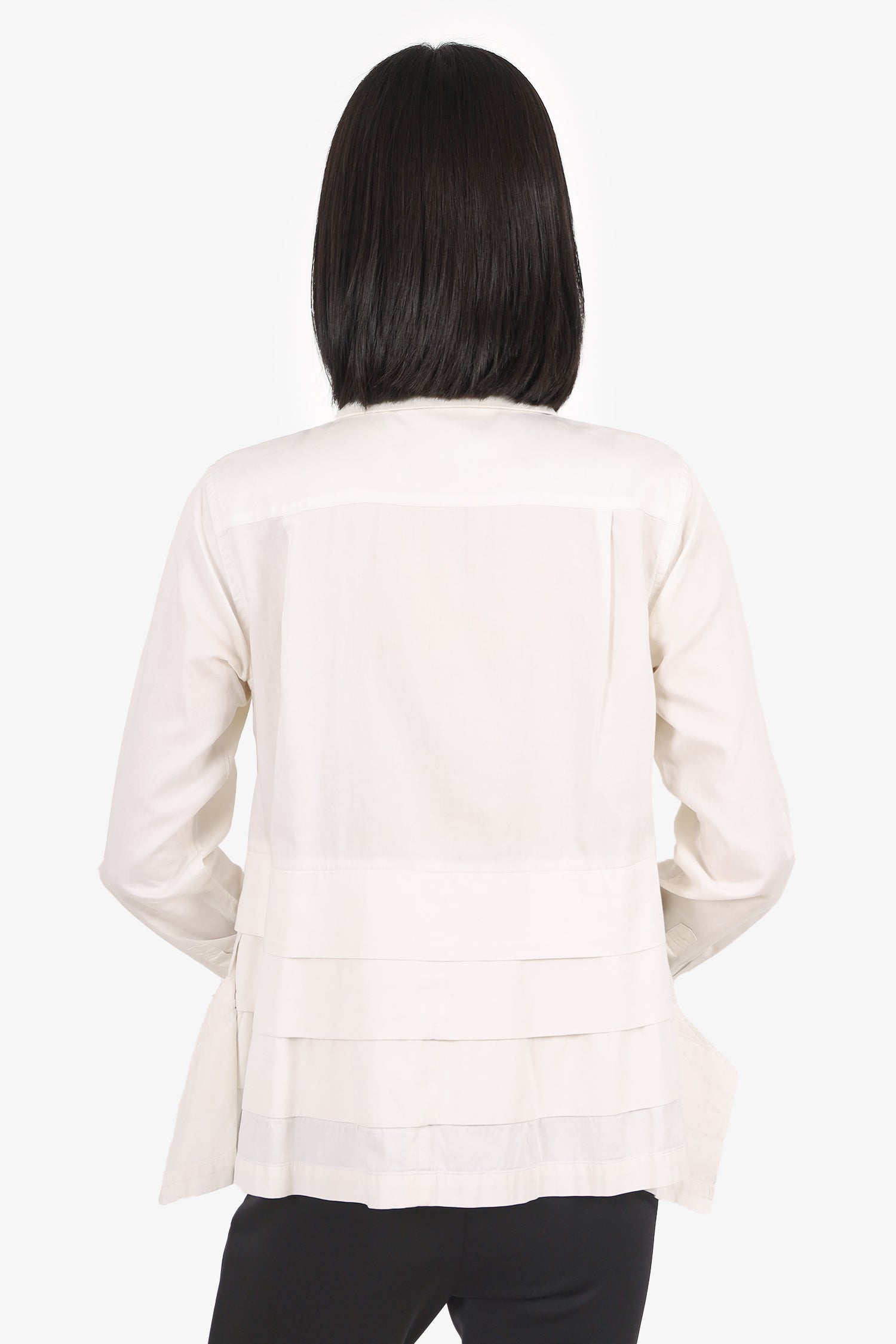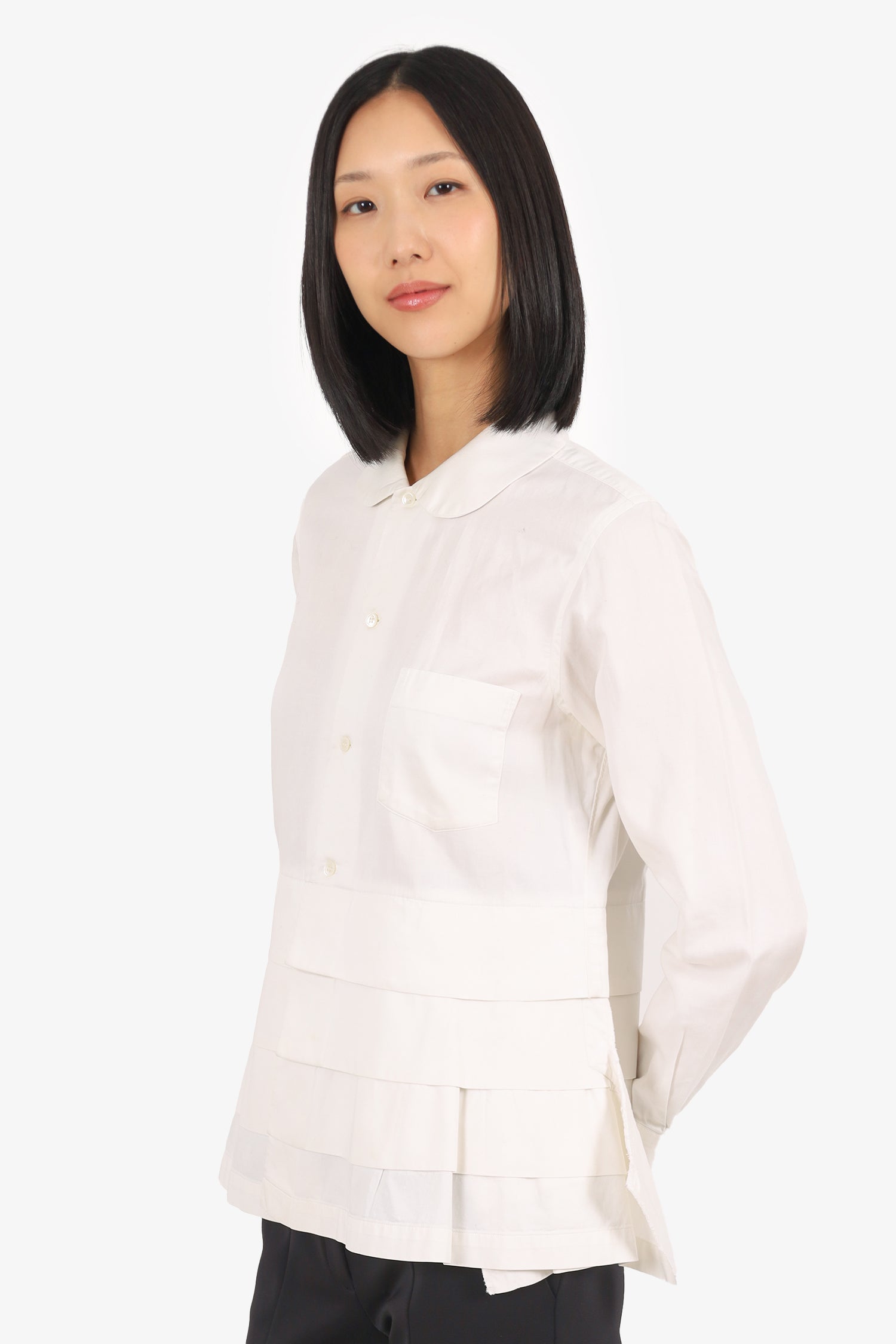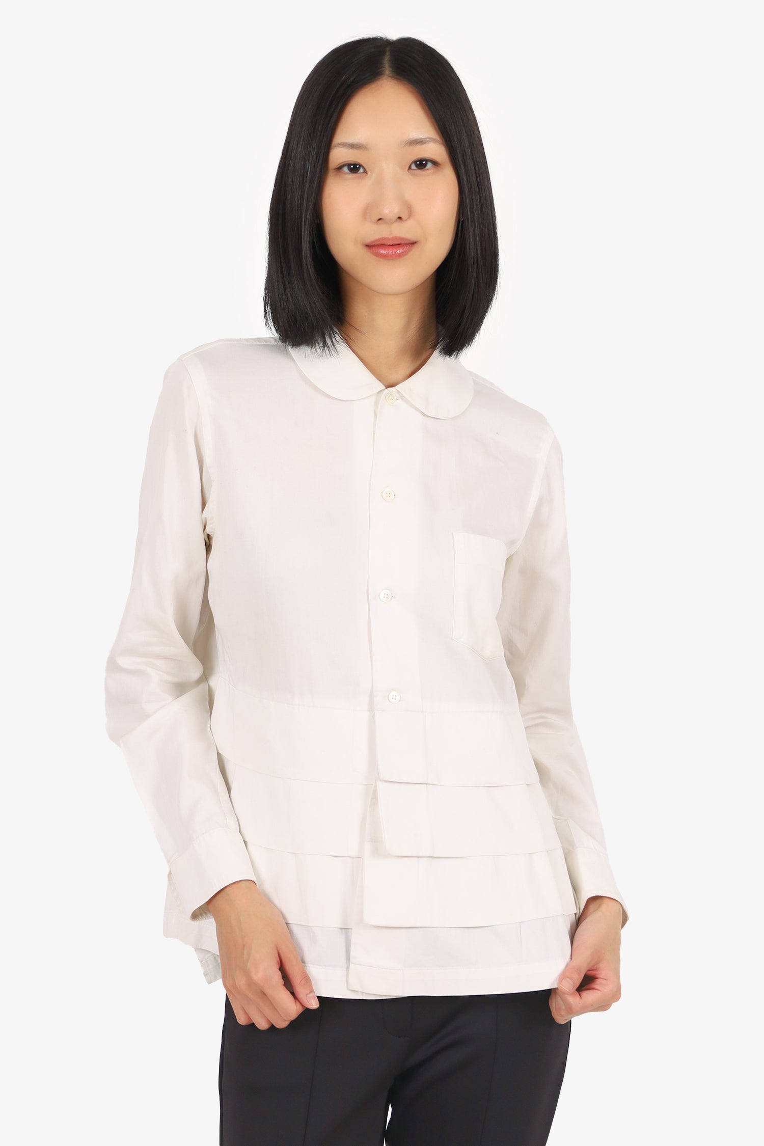 Refresh availabilityComme De Garcon White Tiered Button Up Shirt. Pull-on. Peter pan collared-neckline. Front button-up closure. Sleeve cuffs with button-up closure. Single front exterior slip pocket. Bottom side slits. Tonal stitching.