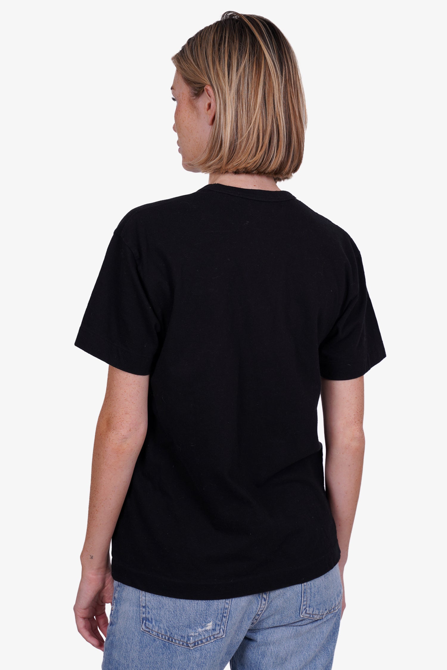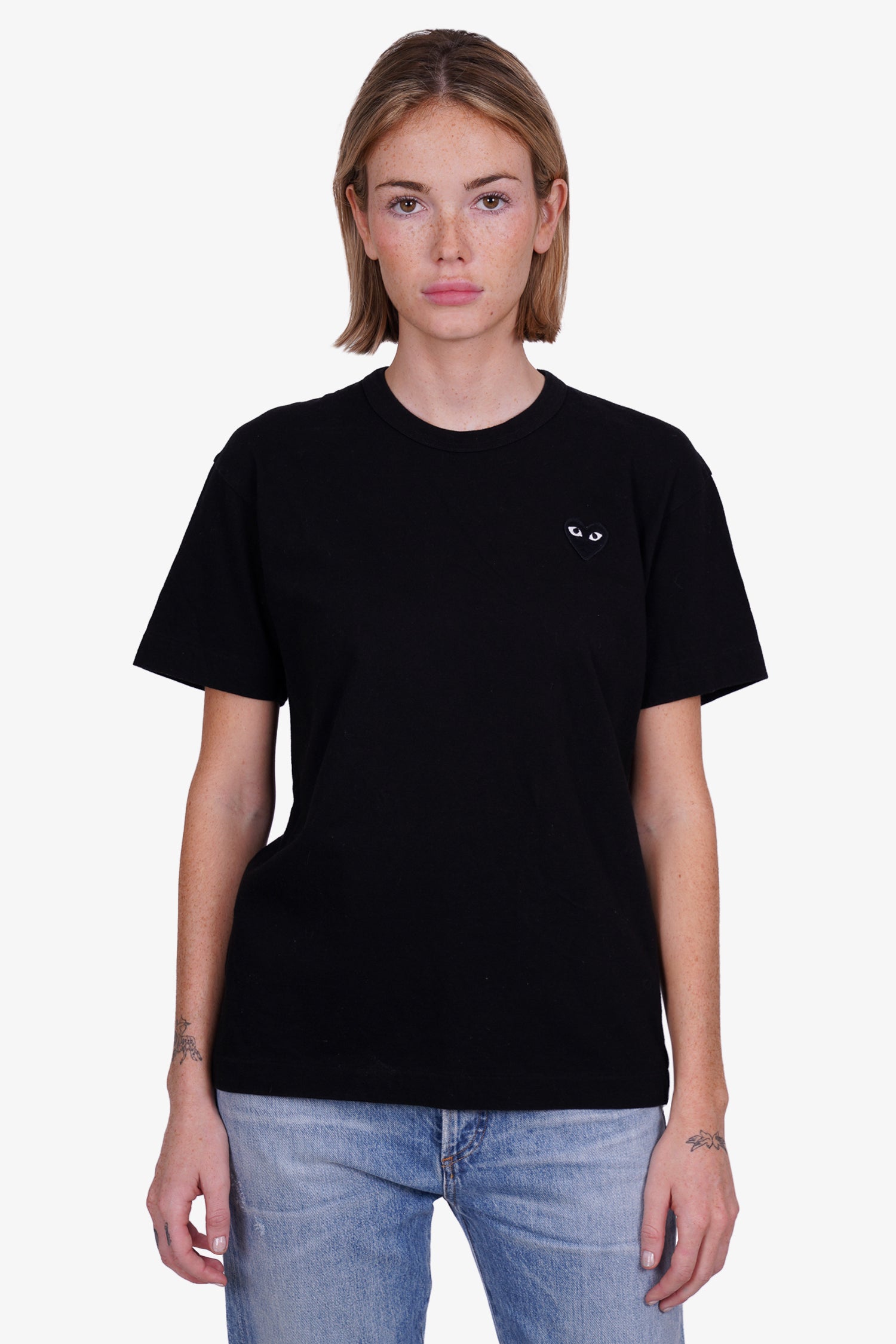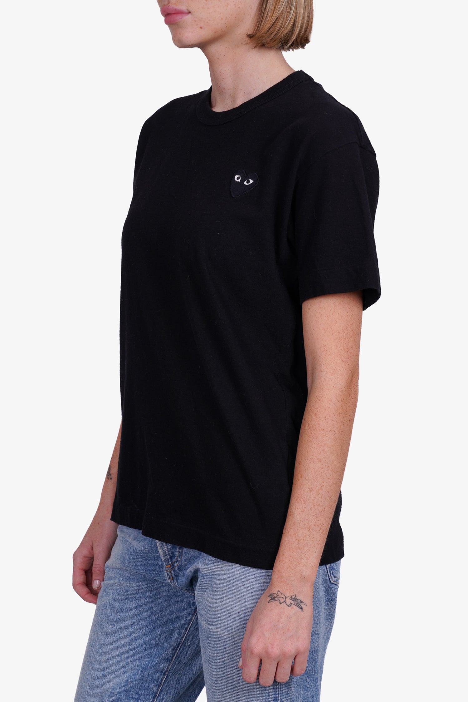 Refresh availabilityComme de Garcons Play Black Cotton Heart T-shirt. Round neckline. Iconic heart patch logo on front. Tonal stitching.