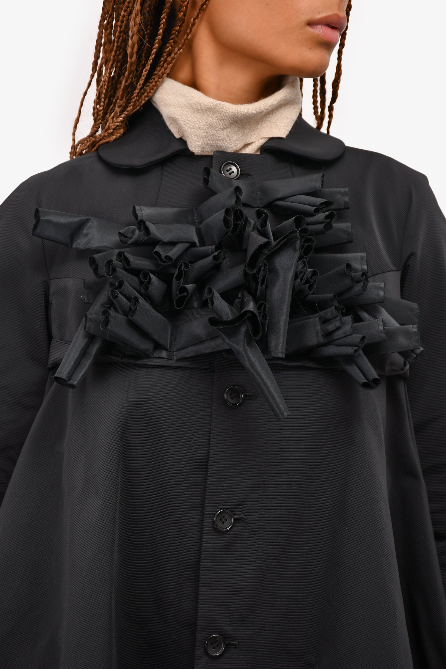 Refresh availabilityComme des Garcons Black Nylon Long Trench Coat with Bows. Black acrylic hardware. Full front button closure. 3/4 Sleeve. 2 hand pockets. Unlined. Tonal stitching.