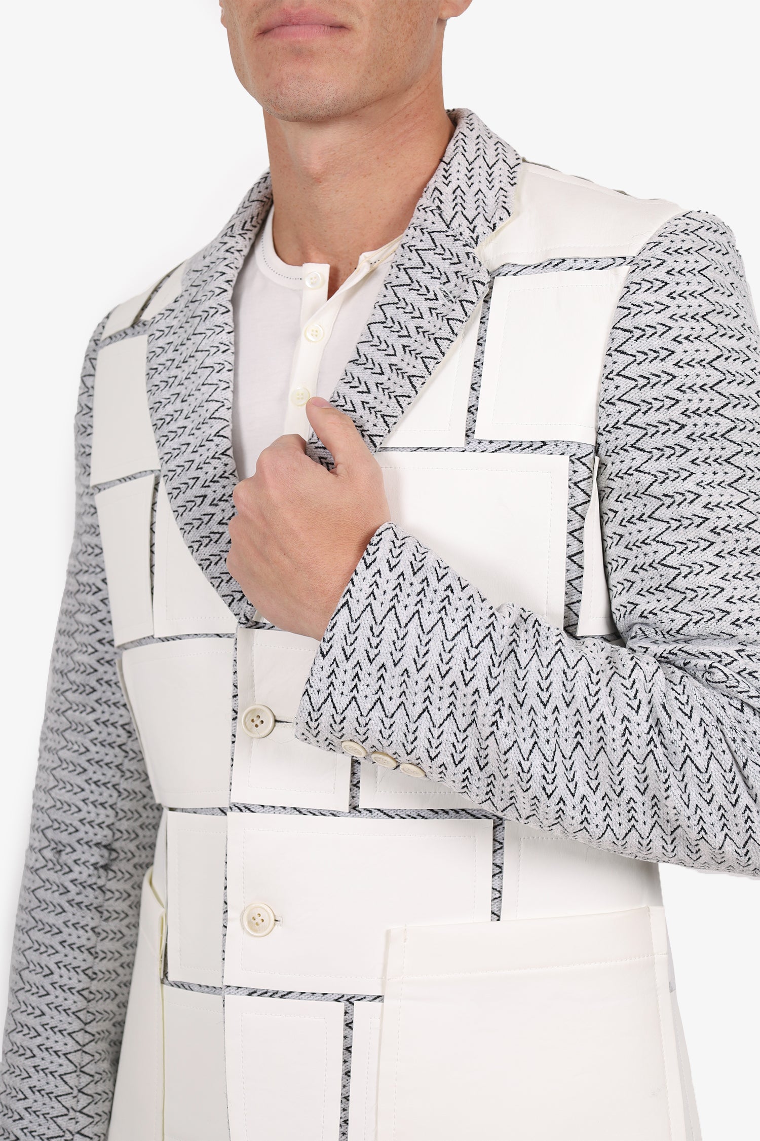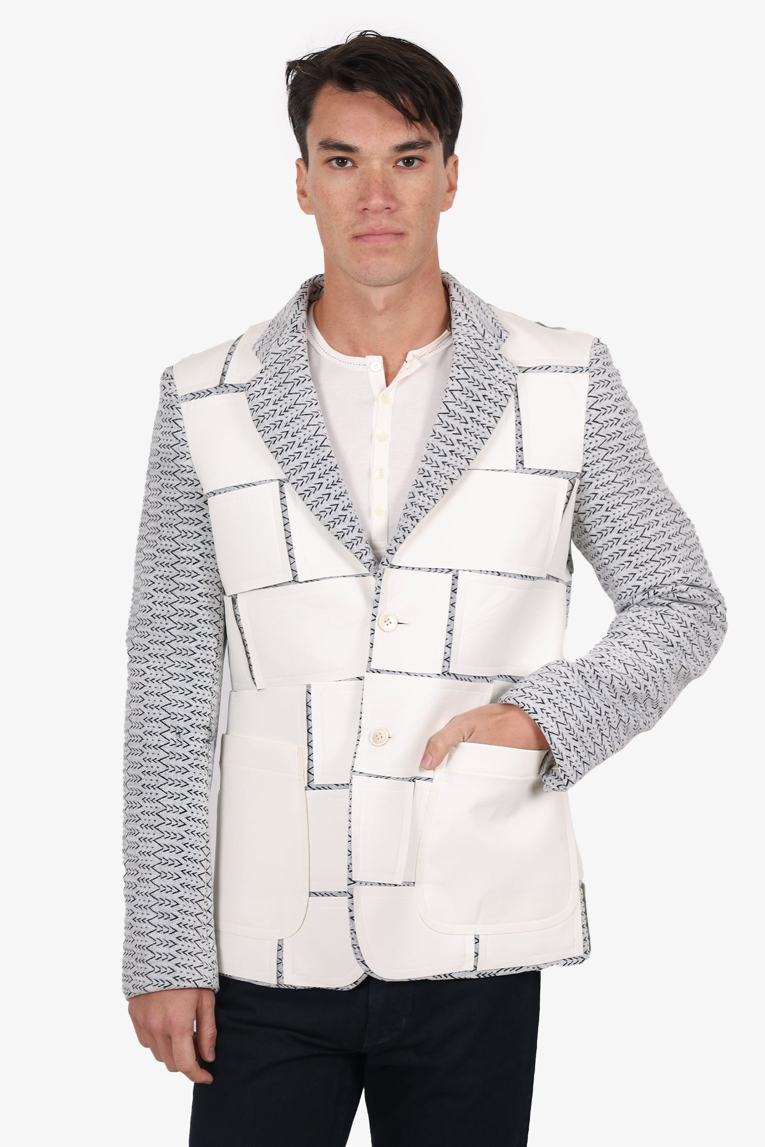 Refresh availabilityComme Des Garcons Grey/White Panelled Blazer. Leather panelling. Button closure. Long sleeves. Tonal stitching.