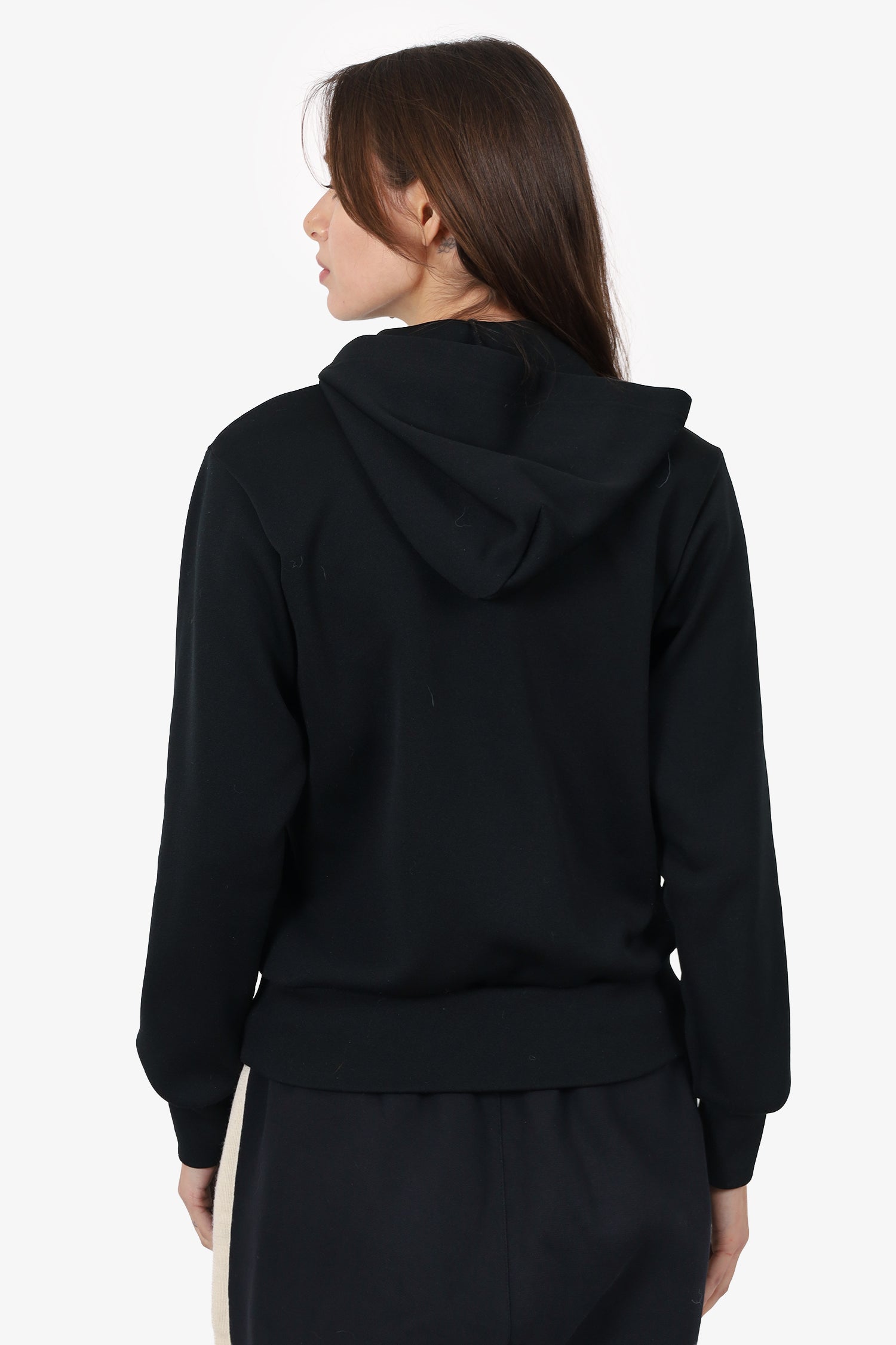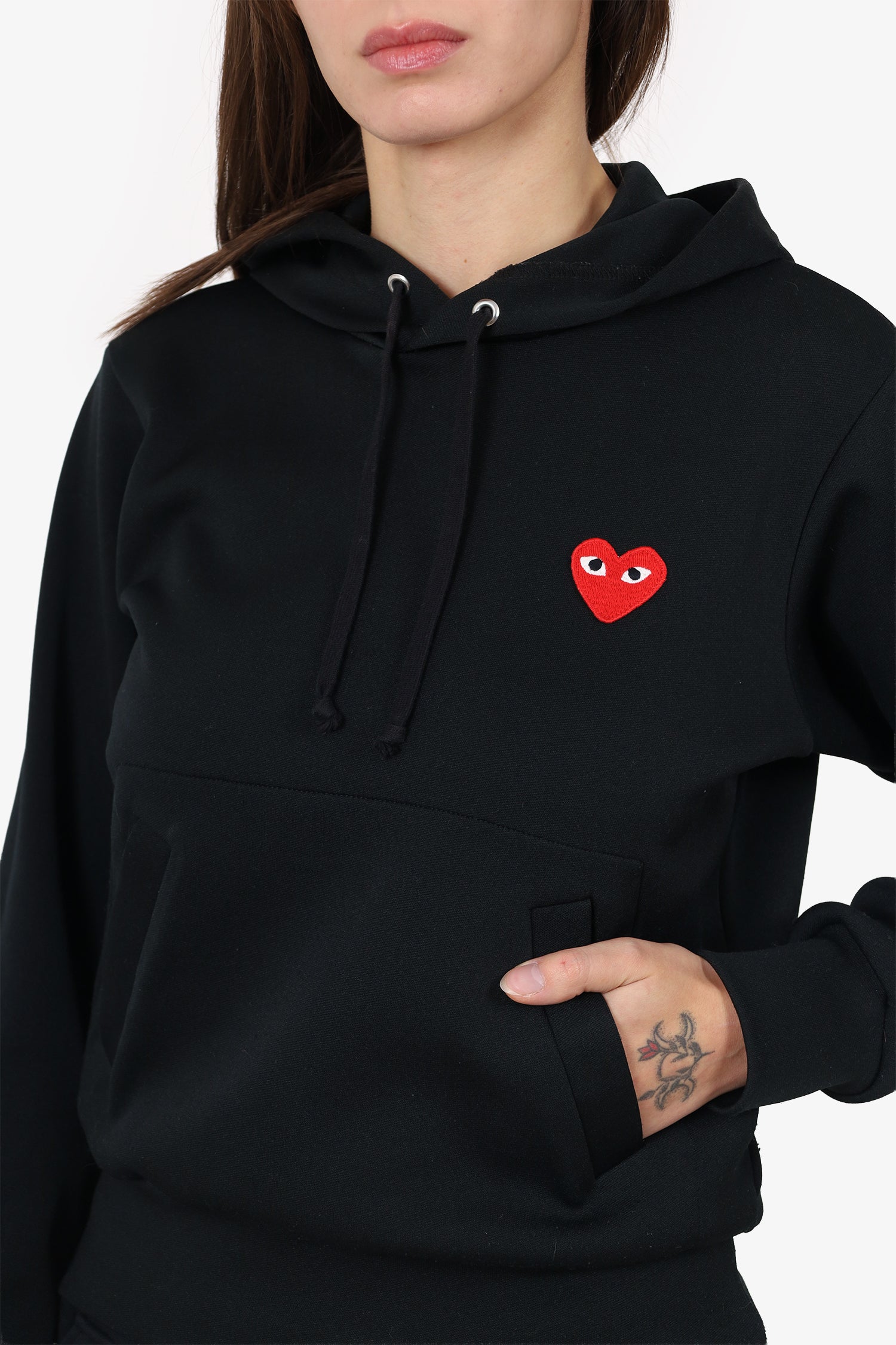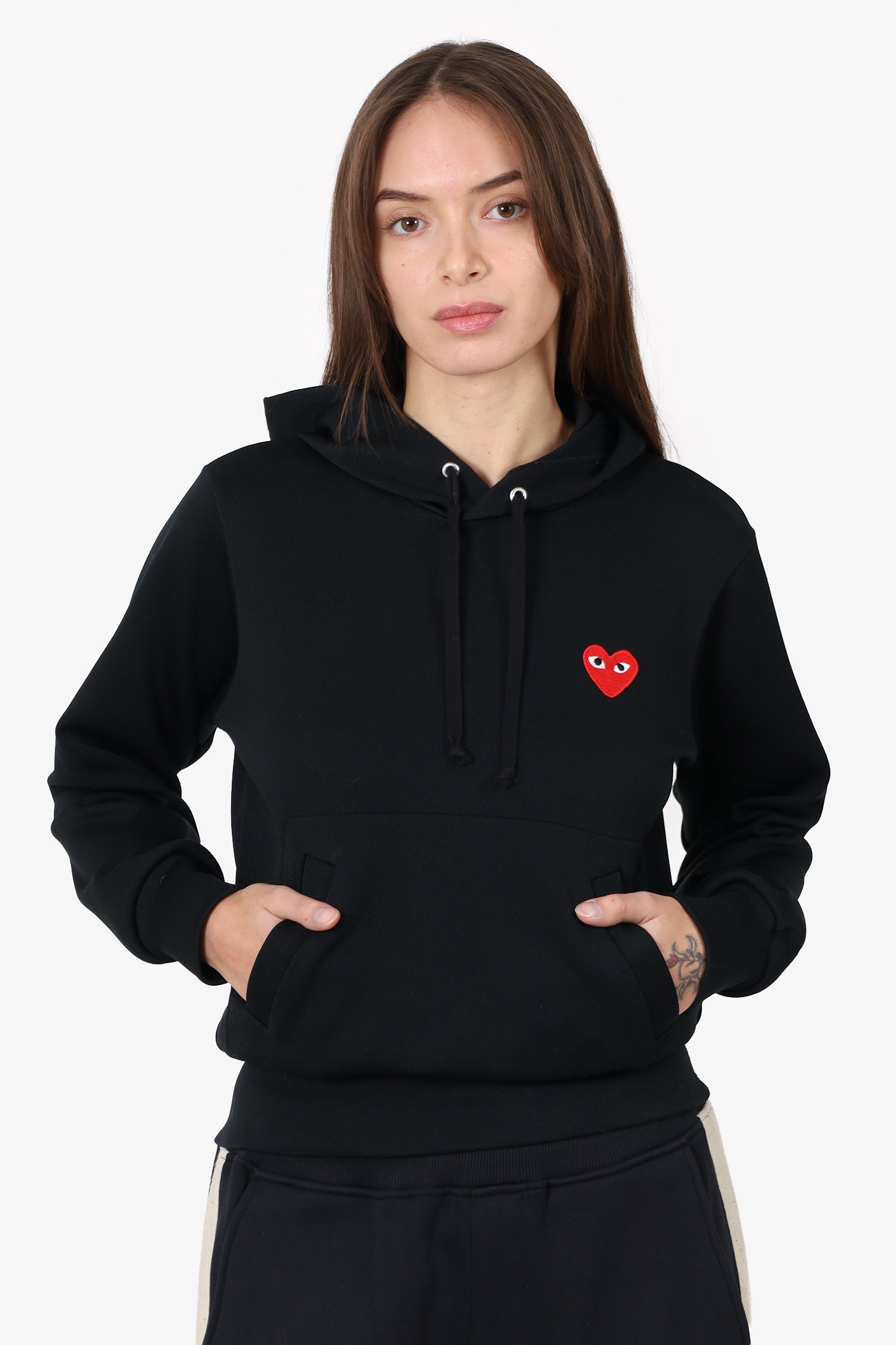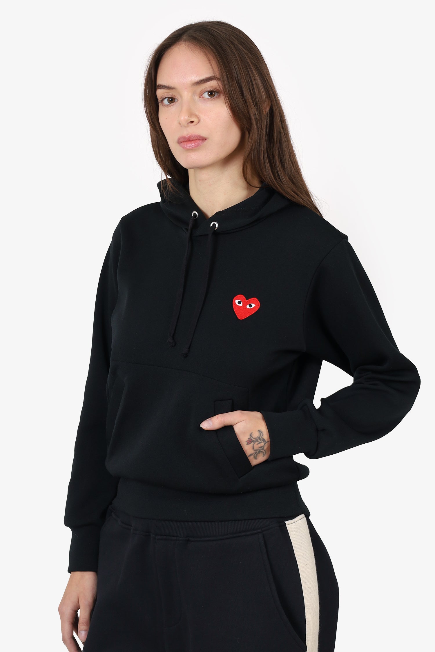 Refresh availabilityComme des Garcons Play Black Hoodie. Pull-on. Hooded neckline with drawstring closure. Single exterior front slip pocket. Silver-tone hardware. Tonal stitching.