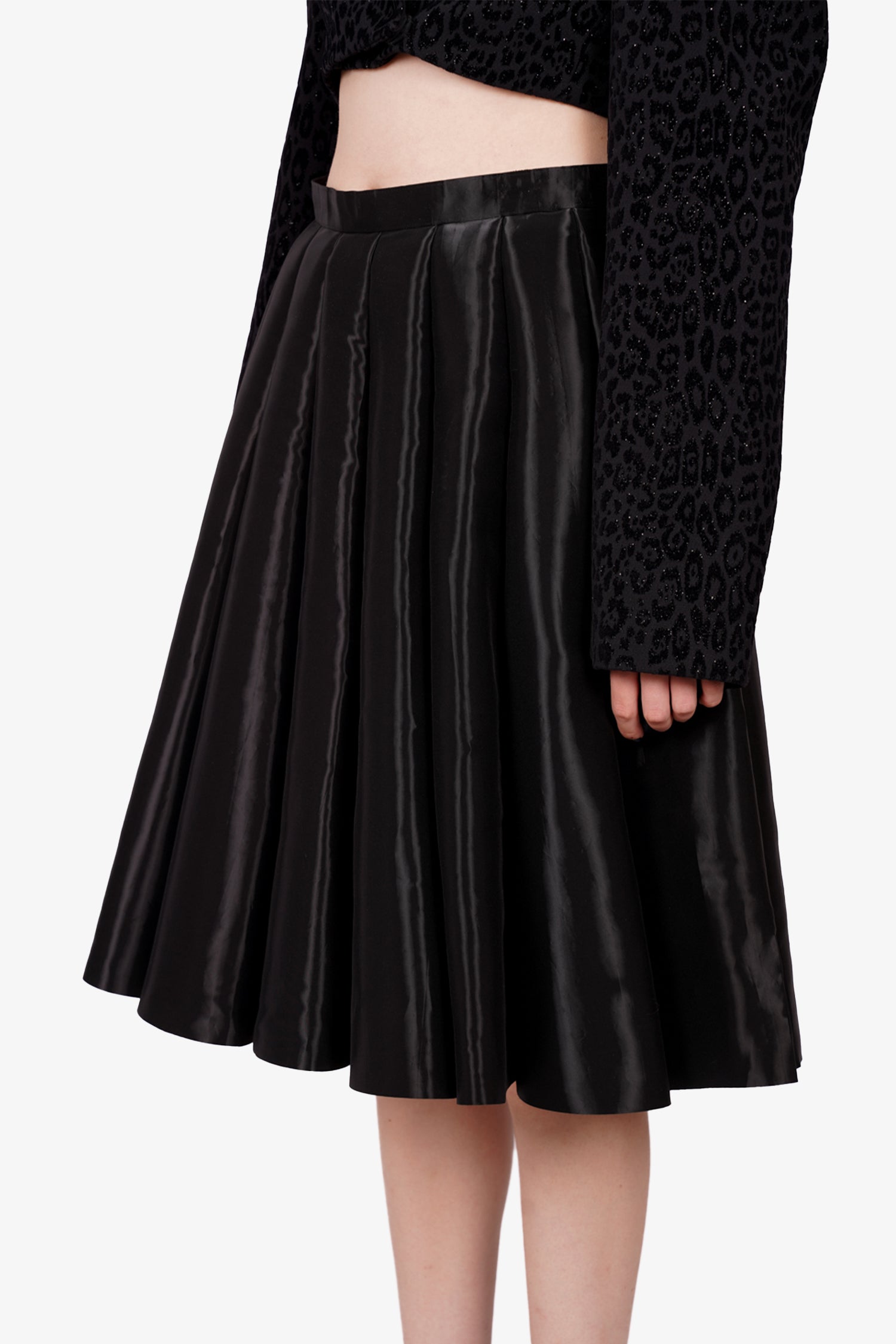 Comme des Garcons Shiny Black Pleated Skirt. Side zip and hook closure. Tonal stitching.