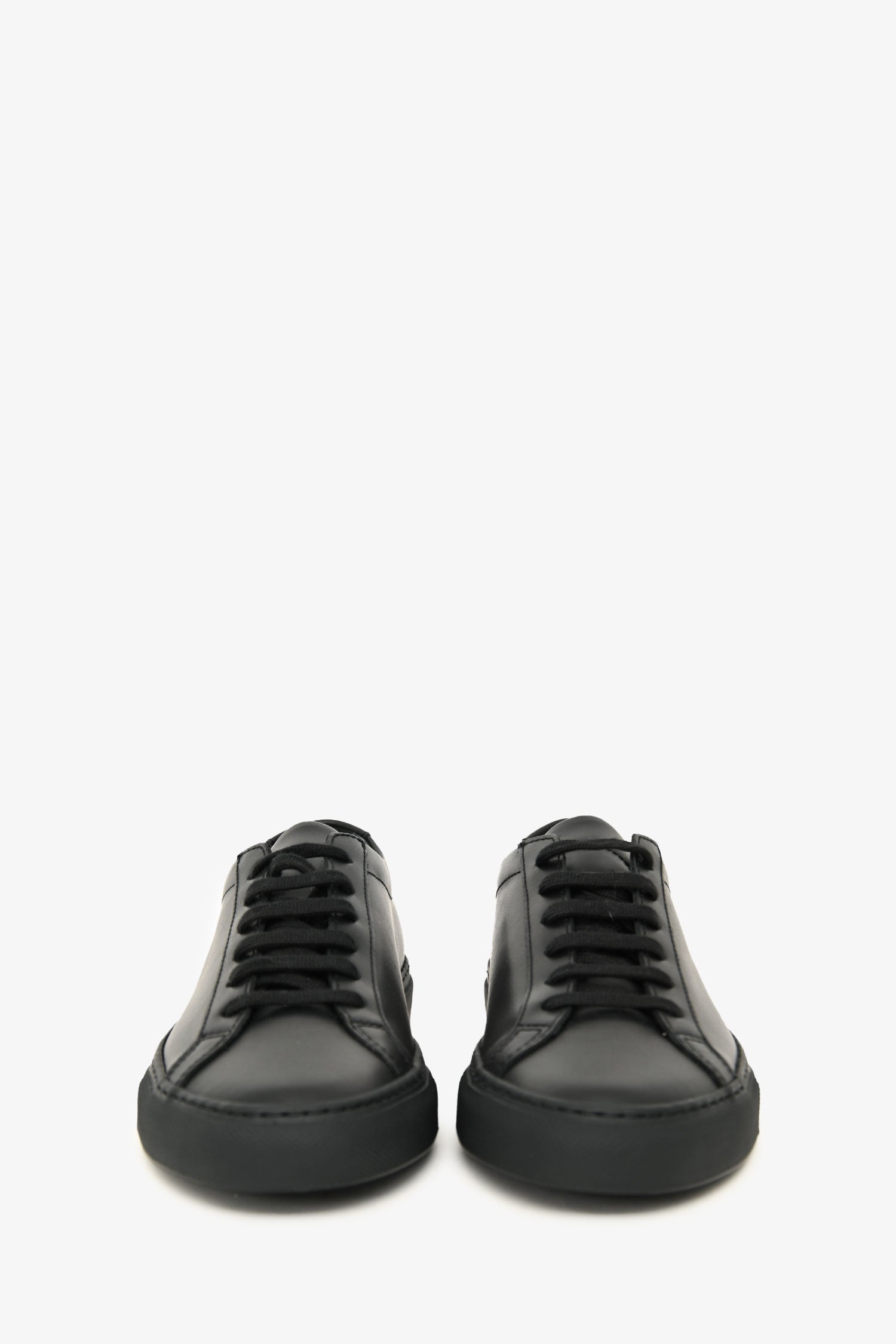 Refresh availabilityCommon Project Black Leather 'Original Achilles' Low Top Sneakers. Slip-on. Round toe. Lace front closure. Rubber soles. Tonal stitching.