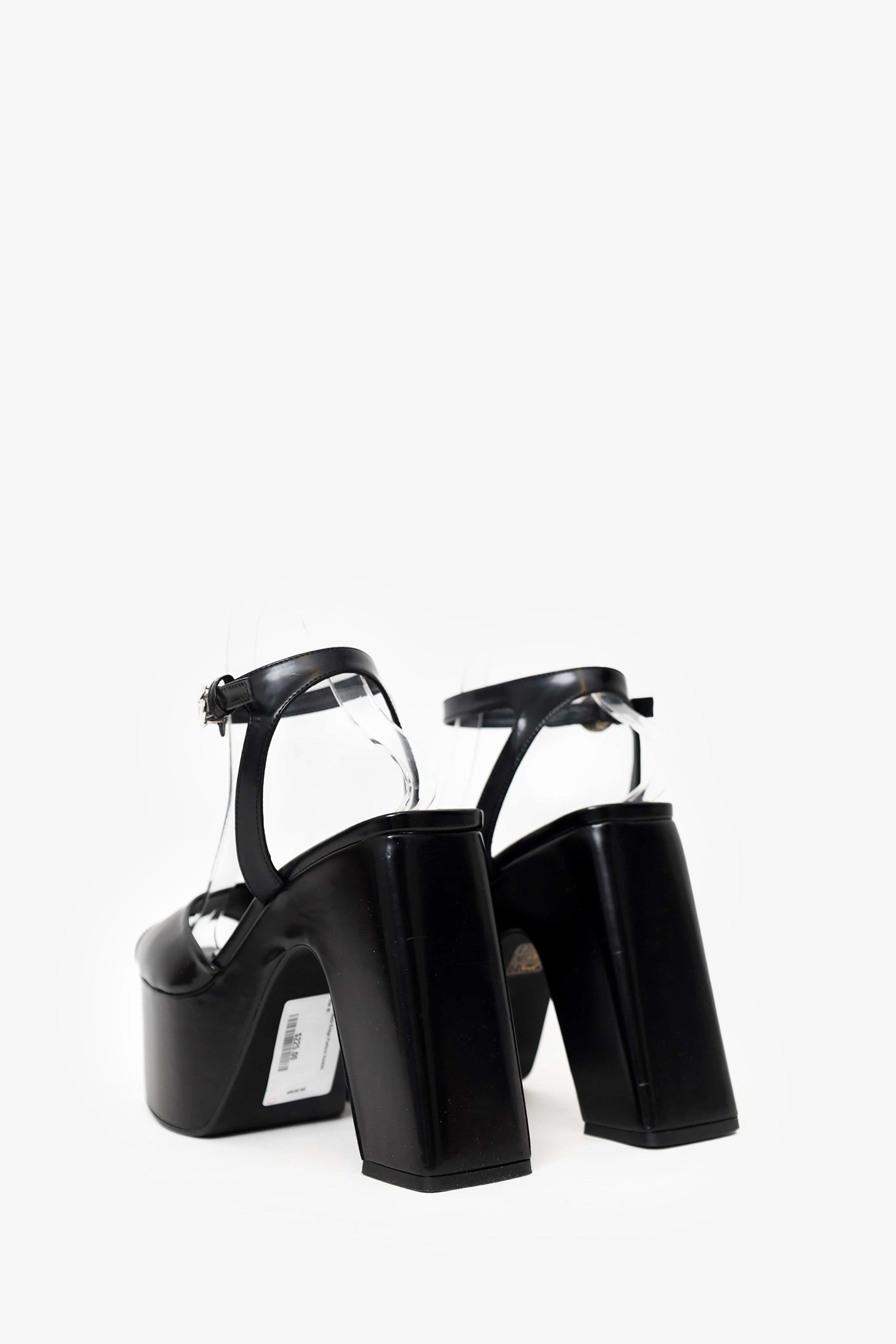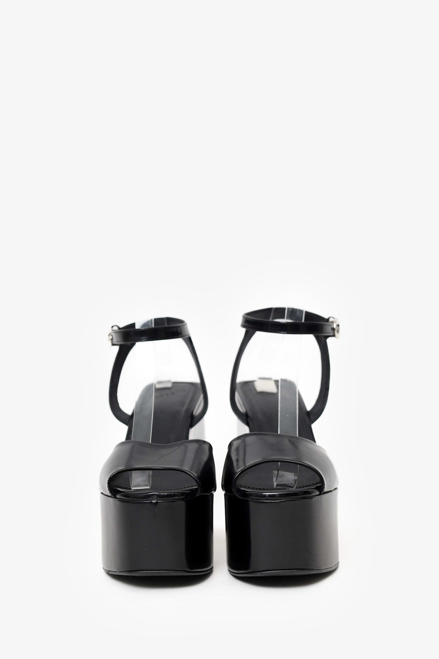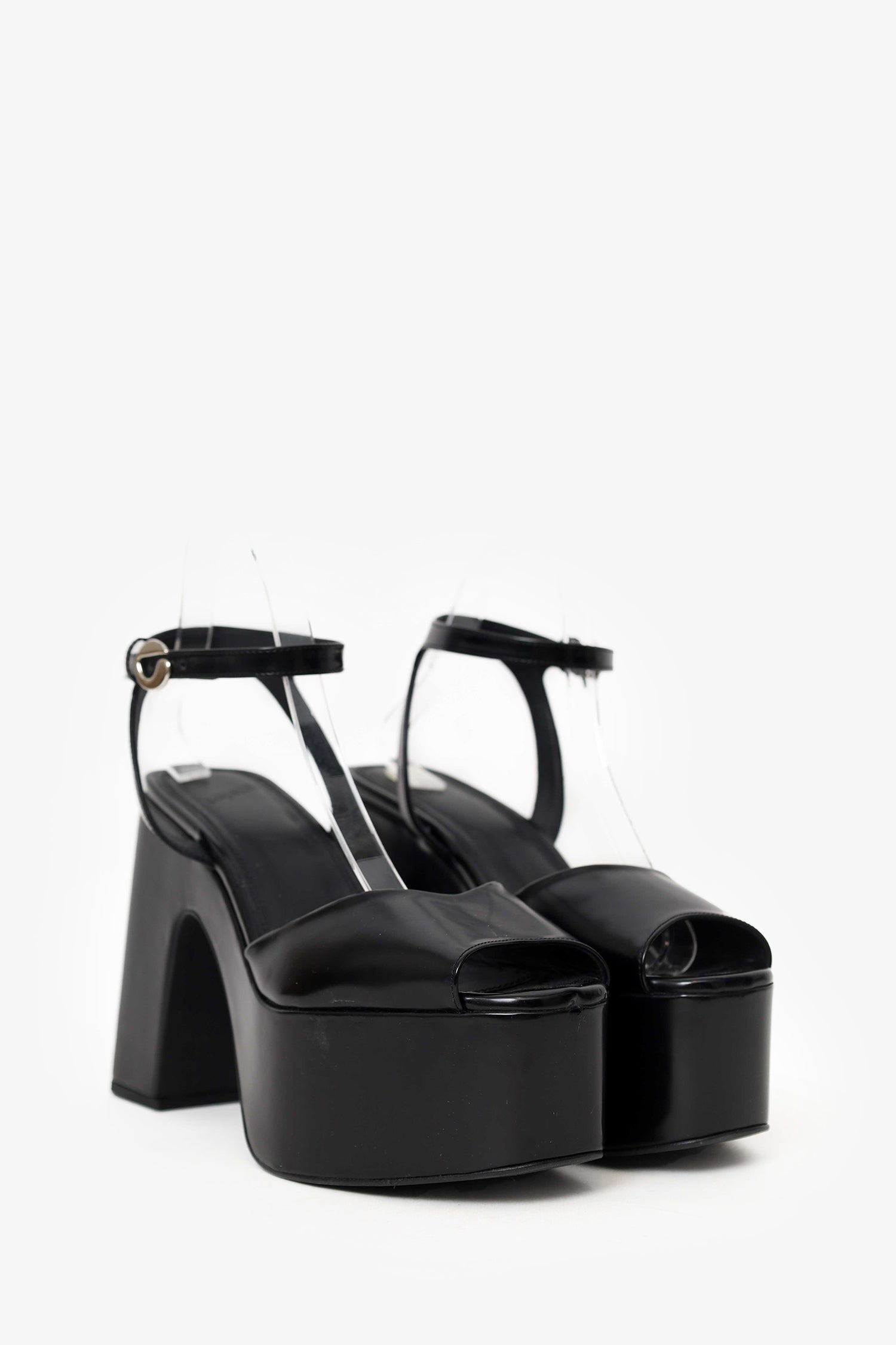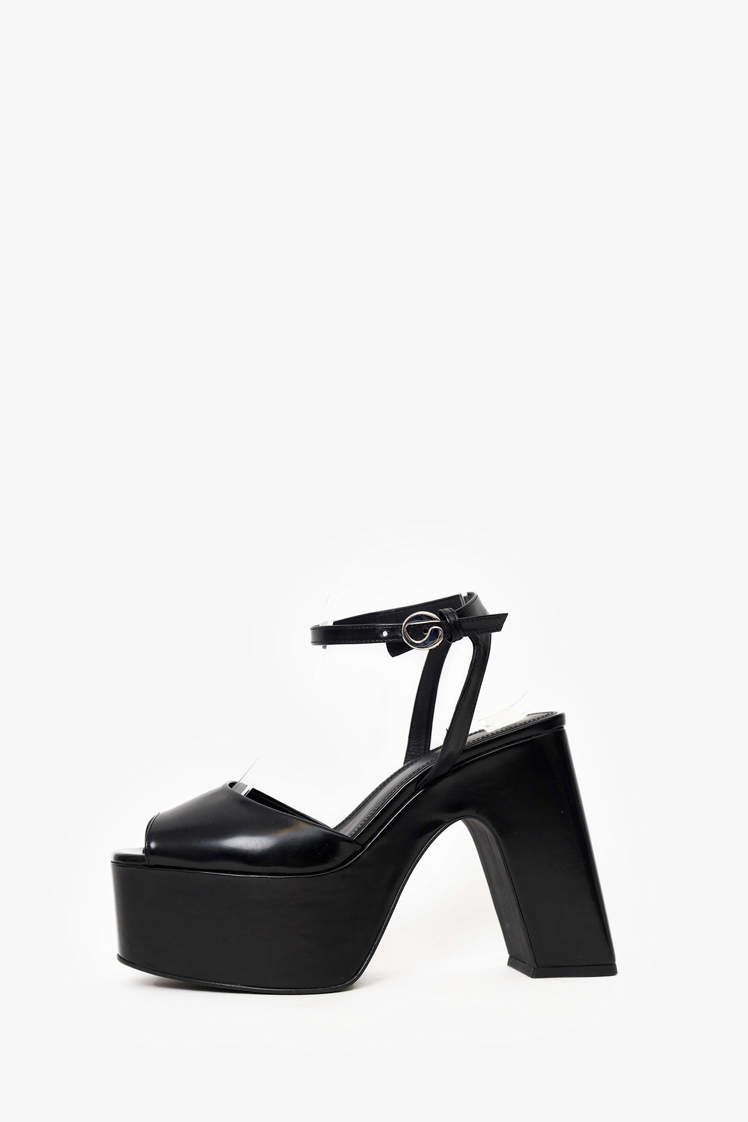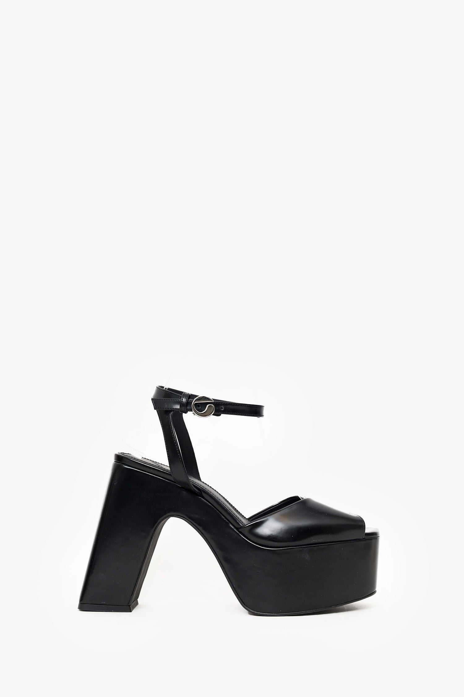 Refresh availabilityCoperni Black Bridge Platform Sandals. Slip-on. Round peep-toe. Ankle strap with adjustable buckle closure. Silver-tone hardware. Tonal stitching.