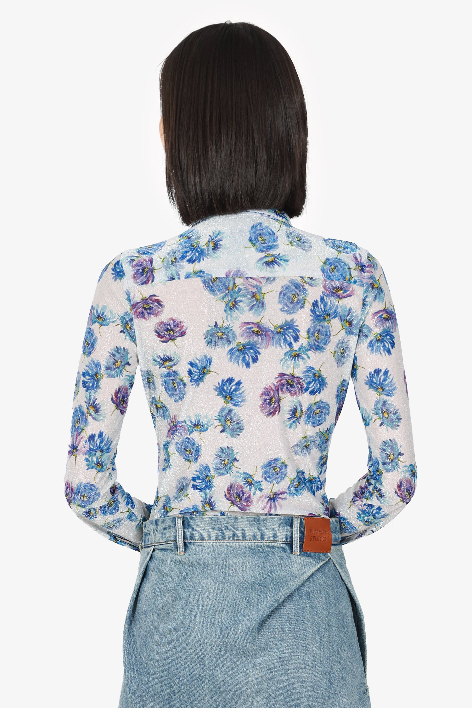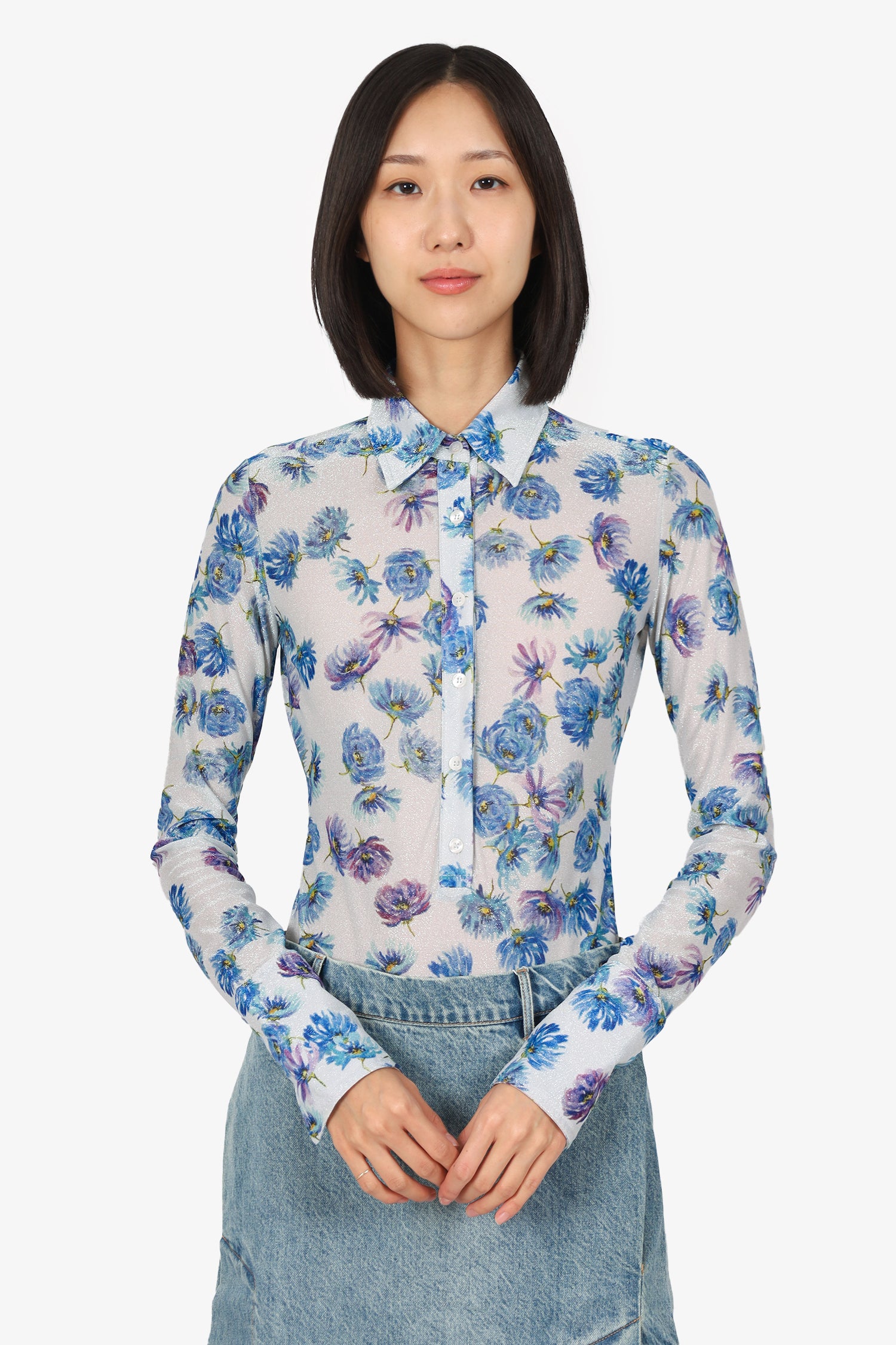 Coperni Blue/Purple Floral Print Long Sleeve Button Up Bodysuit Size S