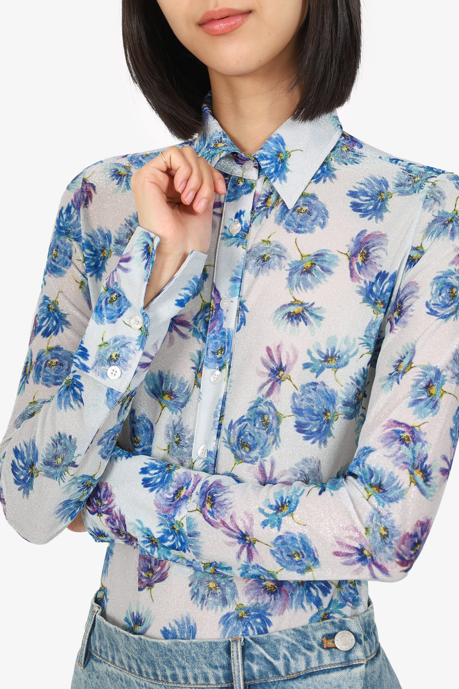 Refresh availabilityCoperni Blue/Purple Floral Print Long Sleeve Button Up Bodysuit. Slip-on. Collared-neckline. Front button-up closure. Snap-button closure at inseam. Sleeve cuffs with button-up closure.