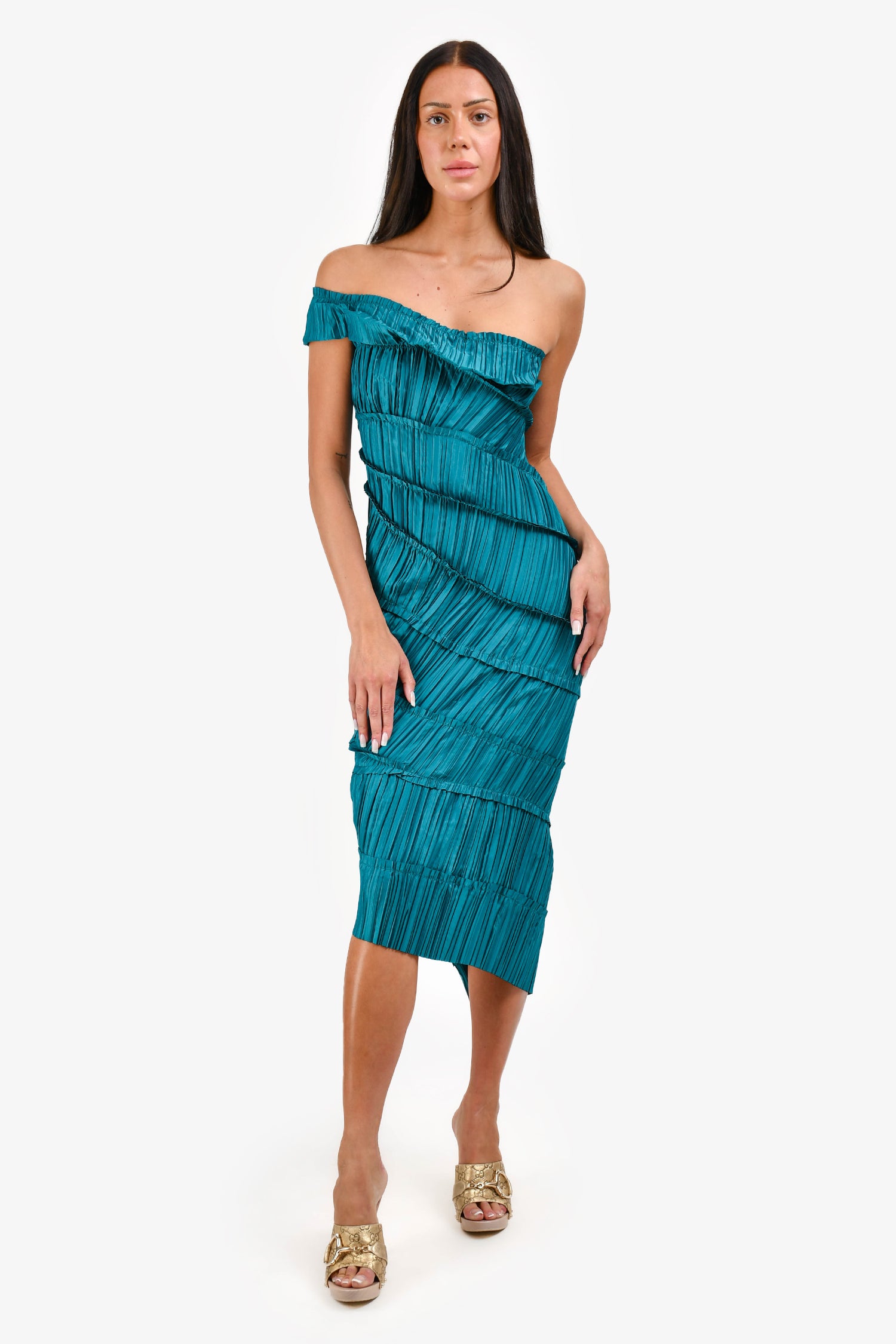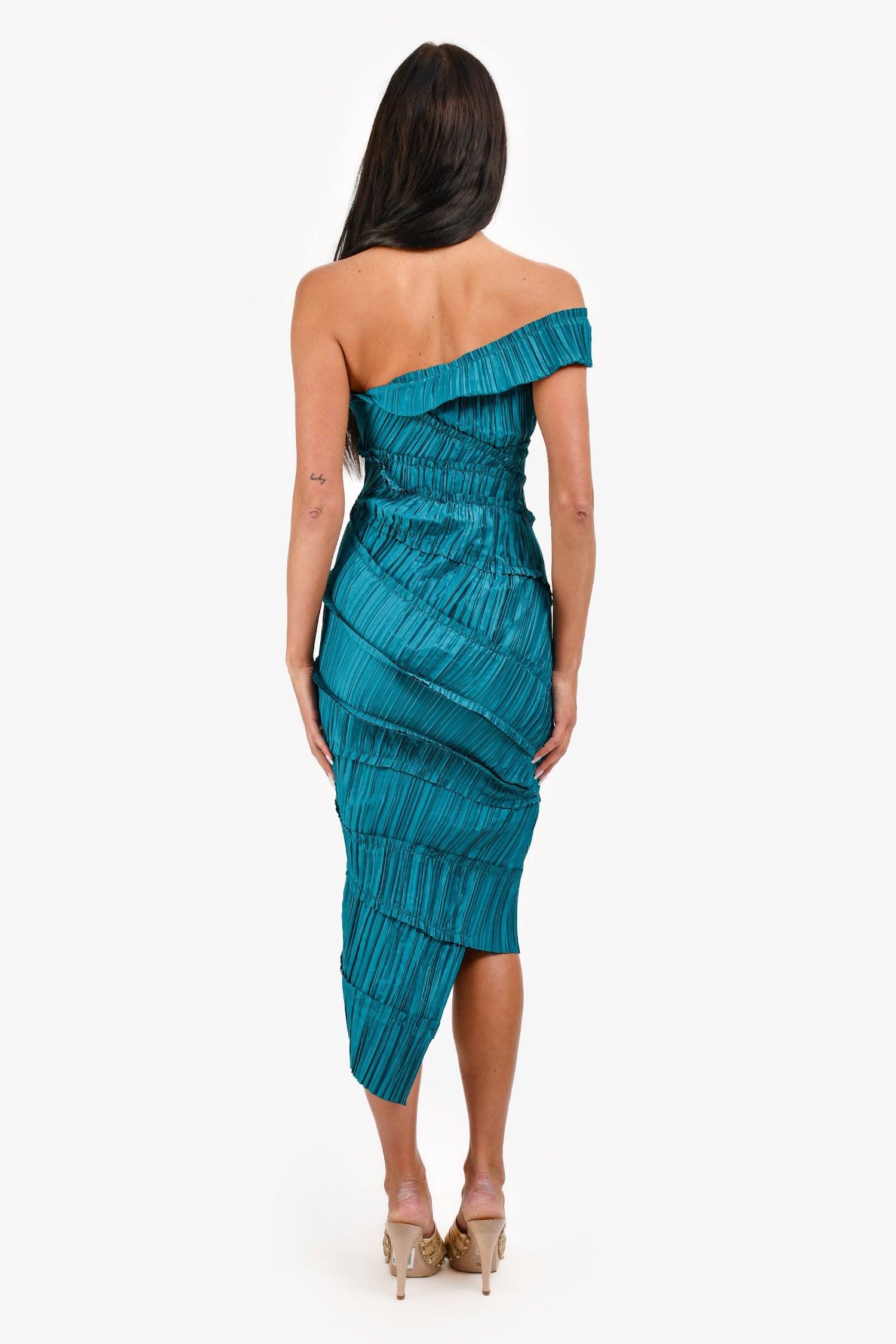 Refresh availabilityCult Gaia Teal Pleated Ruched One Shoulder Asymmetrical Dress. Features a one-shoulder neckline. Asymmetrical hemline. Side zip closure. Fully lined. Tonal stitching.
