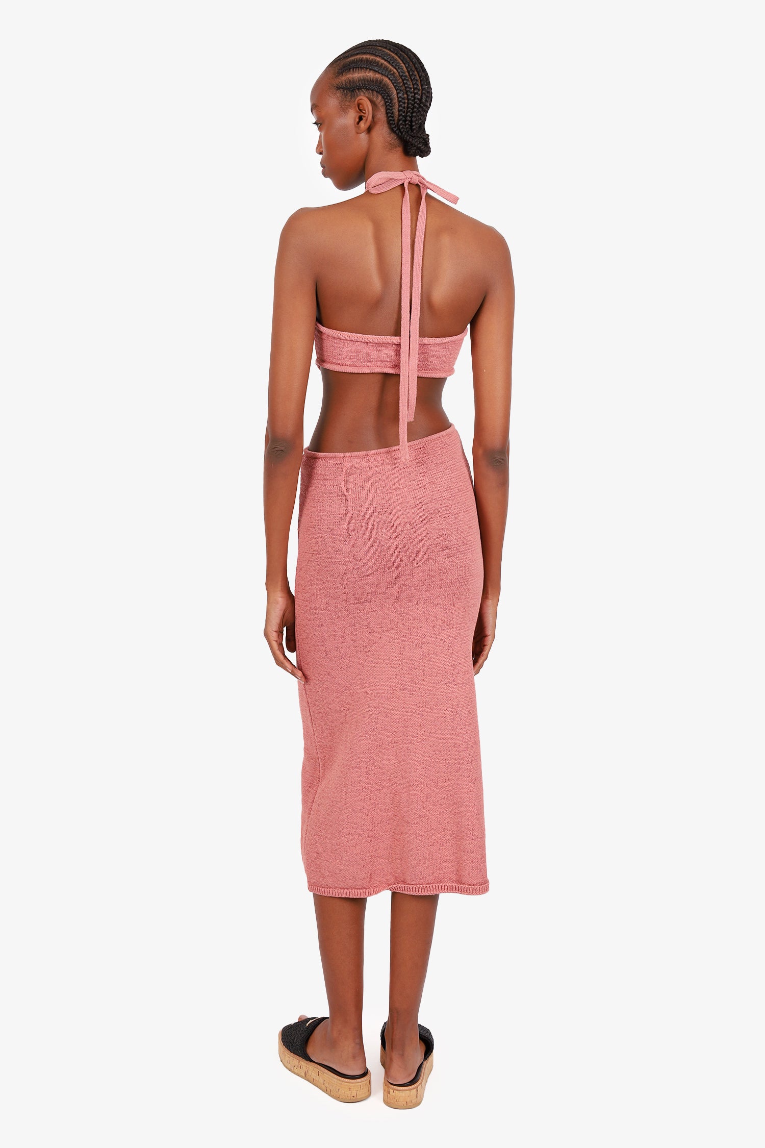 Refresh availabilityCult Gaia Pink Knit Dress. Tie neck closure. Halter. Side cut outs. Tonal stitching.