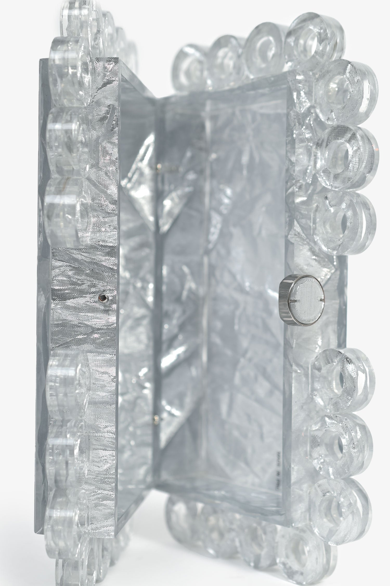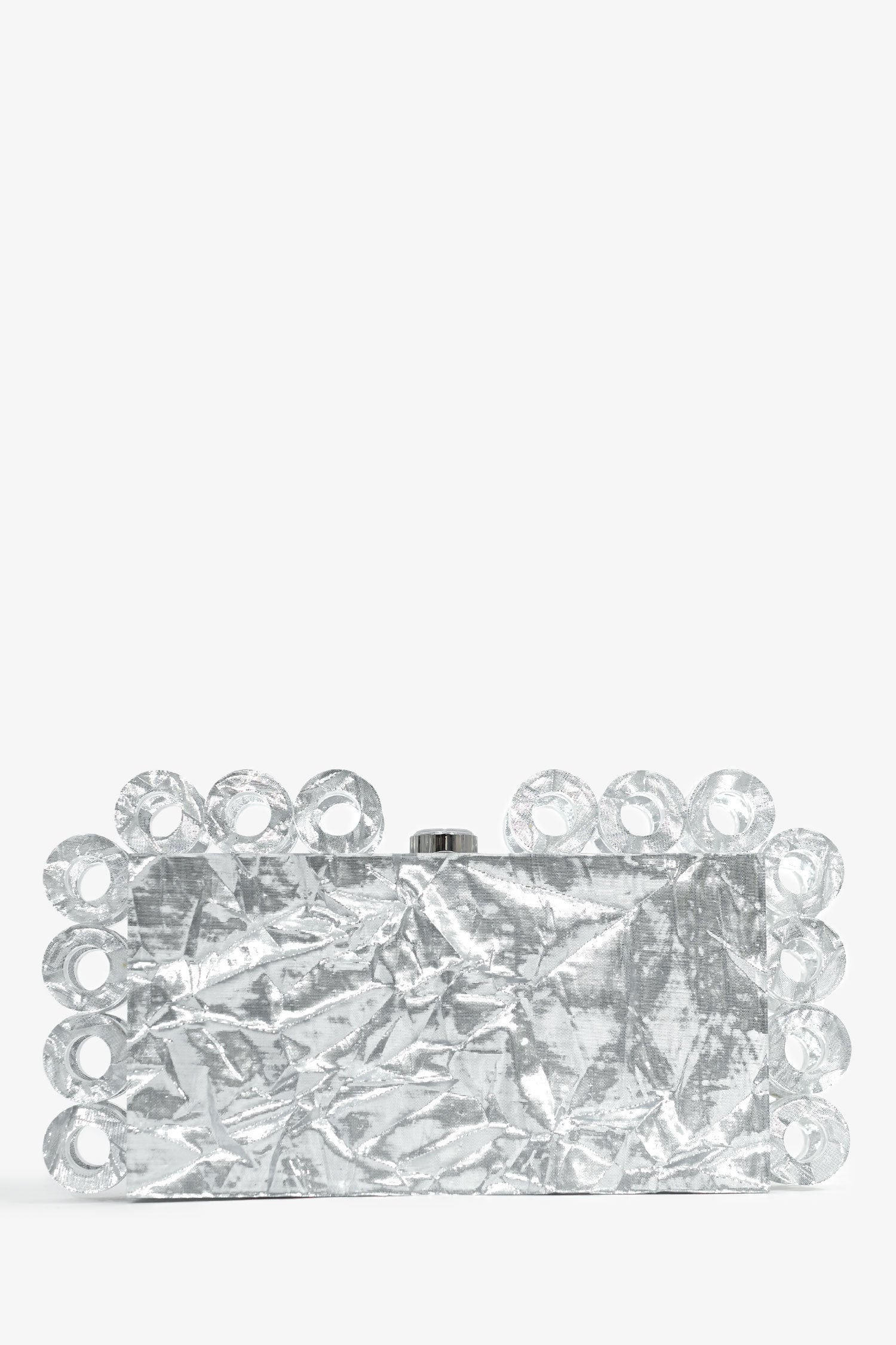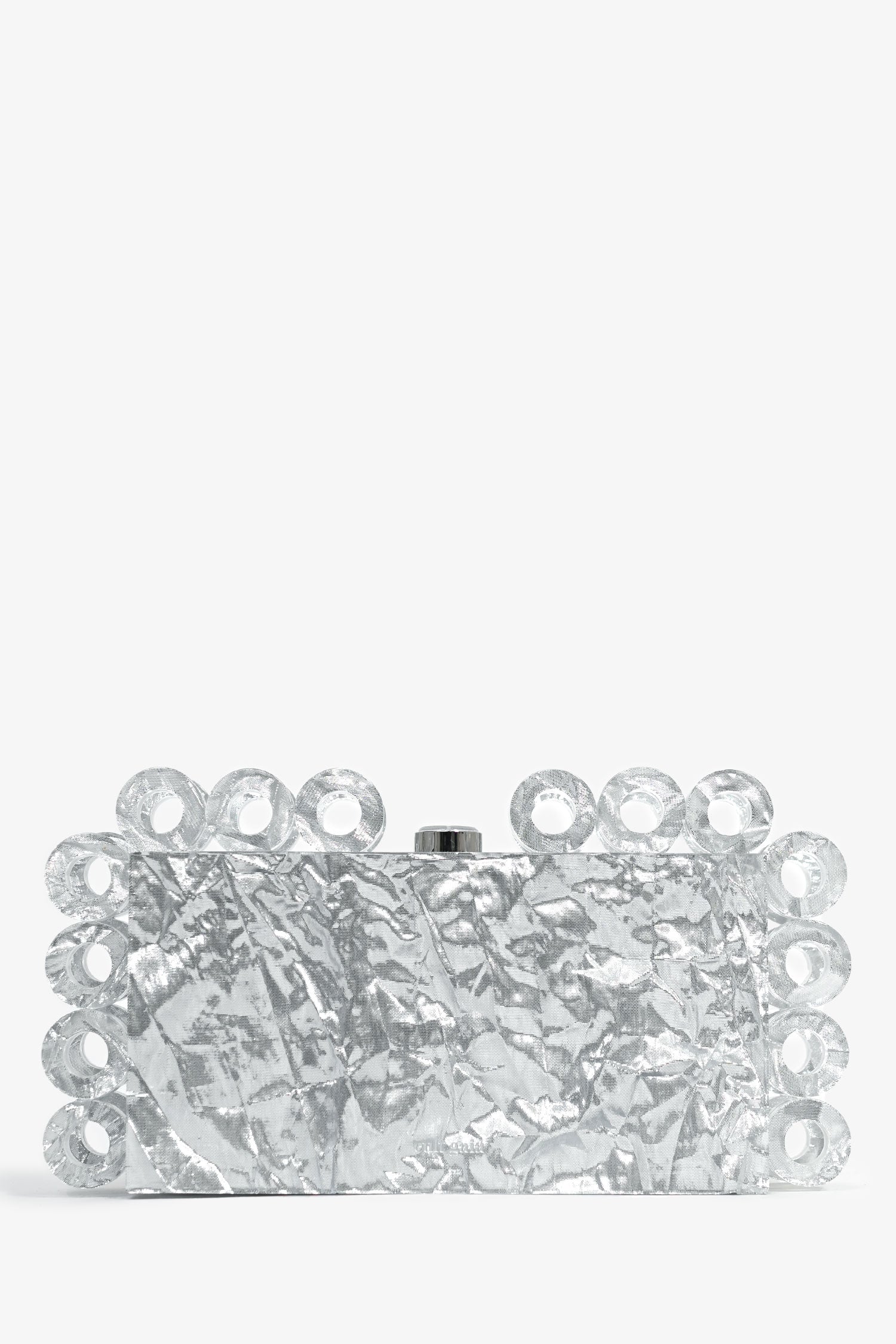 Refresh availabilityCult Gaia Silver Acrylic 'Harlow' Clutch. Silver-foil. Clasp closure. Multi-rings. Unlined.
