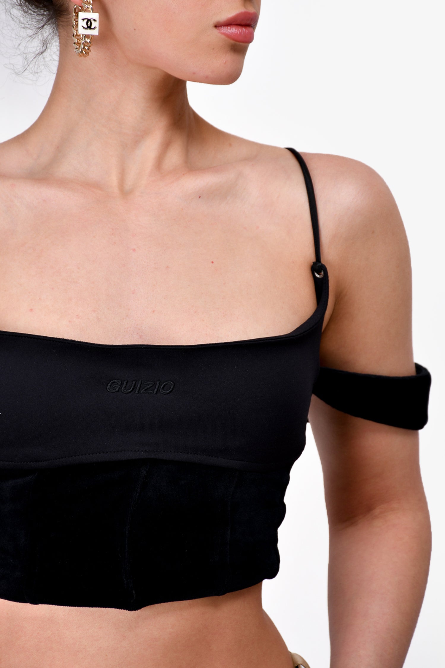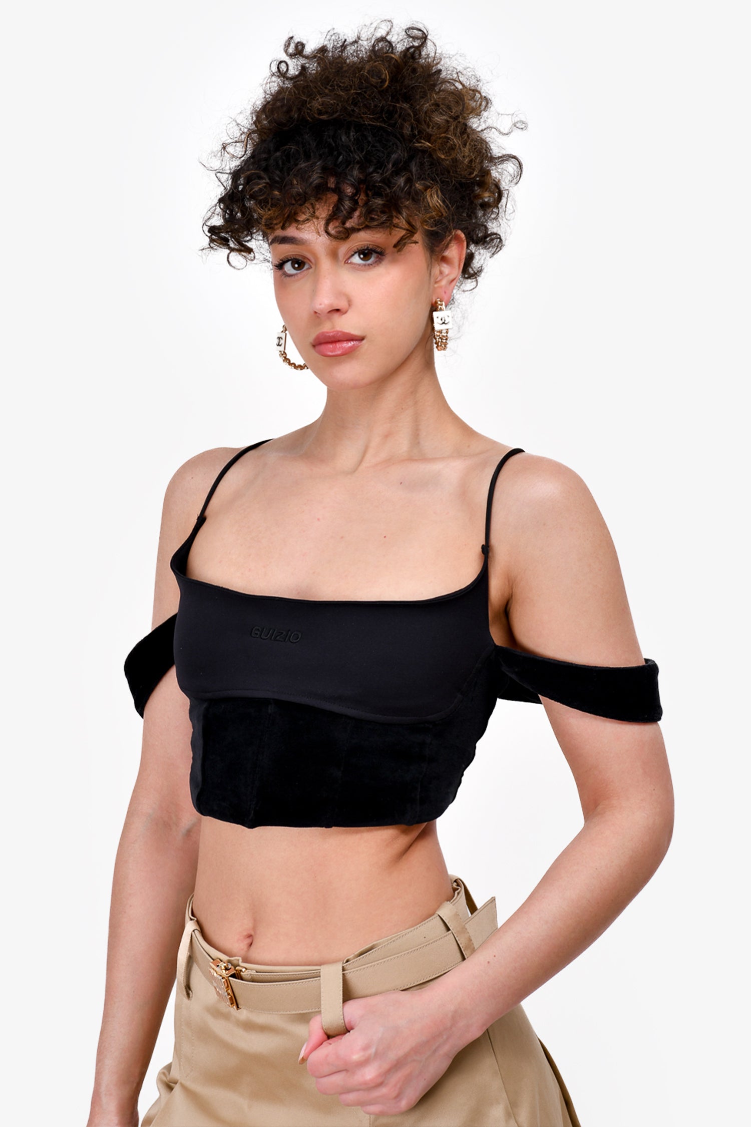 Refresh availabilityDanielle Guizio Black Velvet Corset Top. Adjustable straps. Lace-up back. Cropped. Tonal stitching.
