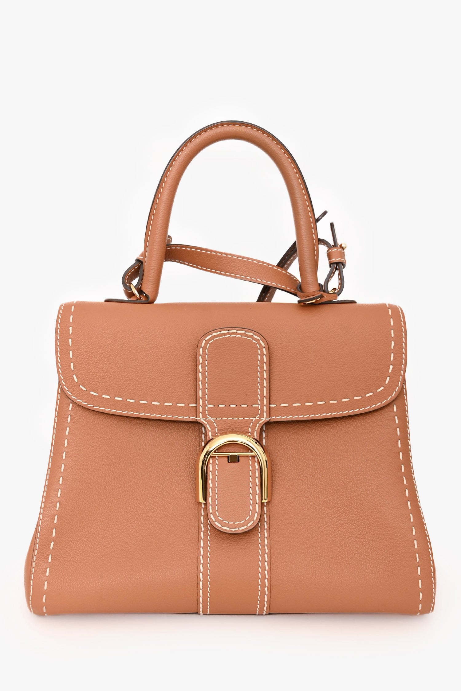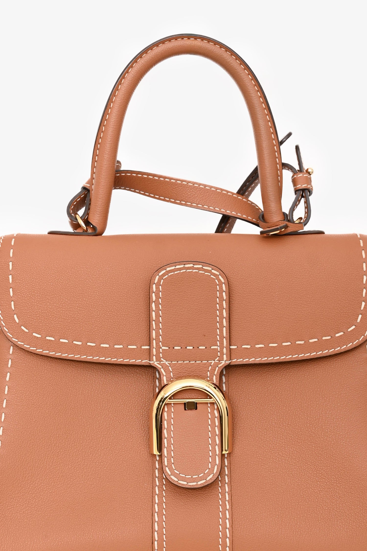 Delvaux Brown Leather Stitch Detail Le Brilliant MM Top Handle Bag with Strap. Front flap with buckle closure. Single top handle and detachable shoulder strap. 1 interior zip pocket; 1 interior slip pocket. 4 protective base studs. Gold-tone hardware. Contrast stitching.
