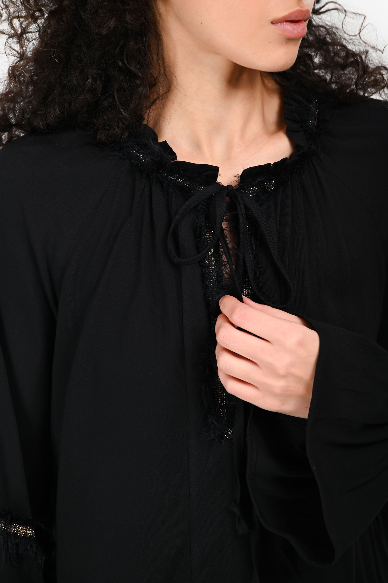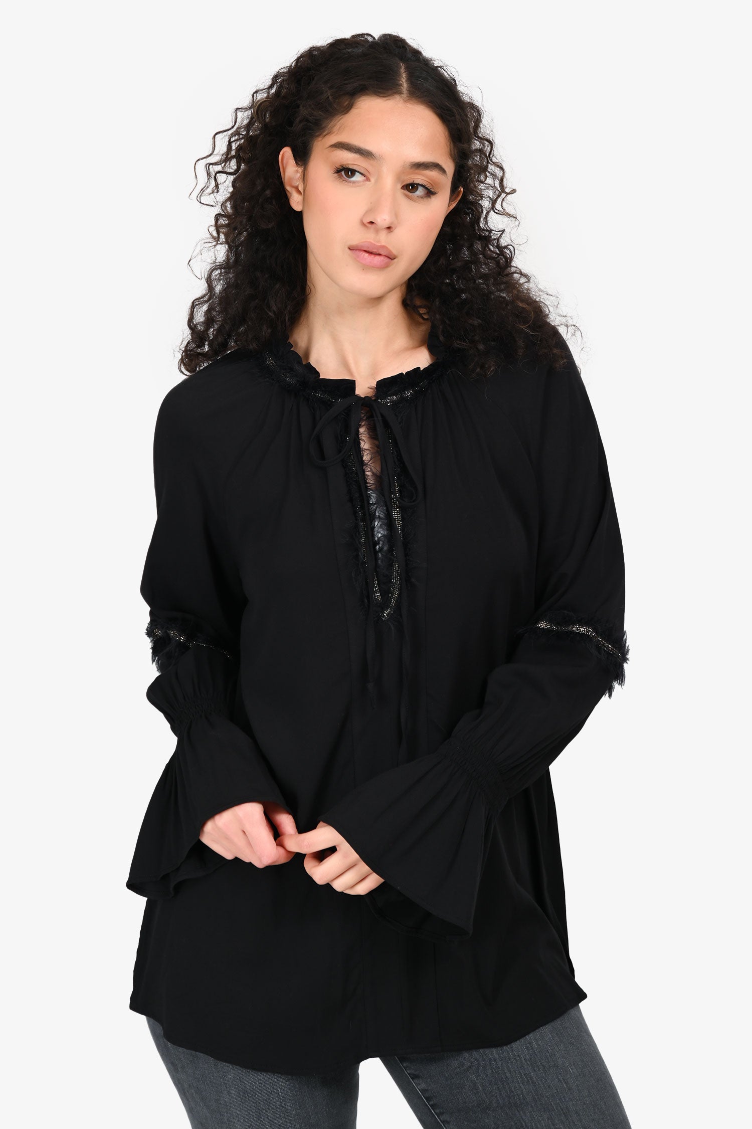 Refresh availabilityDevotion Twins Black Blouse. Slip-on. V-neckline with tie closure. Cuffs with elasticized detail. Side slits at hem. Tonal stitching.