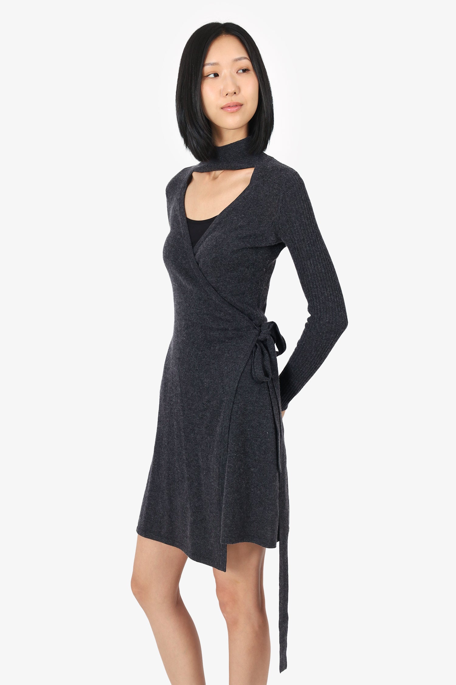 Refresh availabilityDiane von Furstenberg Grey Wool/Cashmere Knit Wrap Dress. Pull-on. Adjustable strap closure. Mock neckline with open V-cut. Tonal Stitching.
