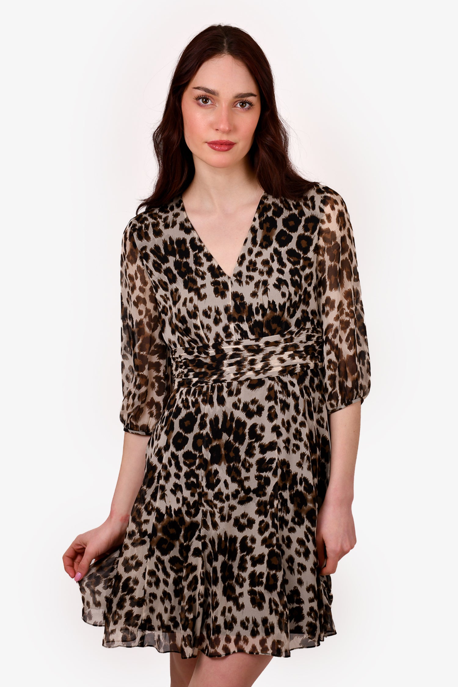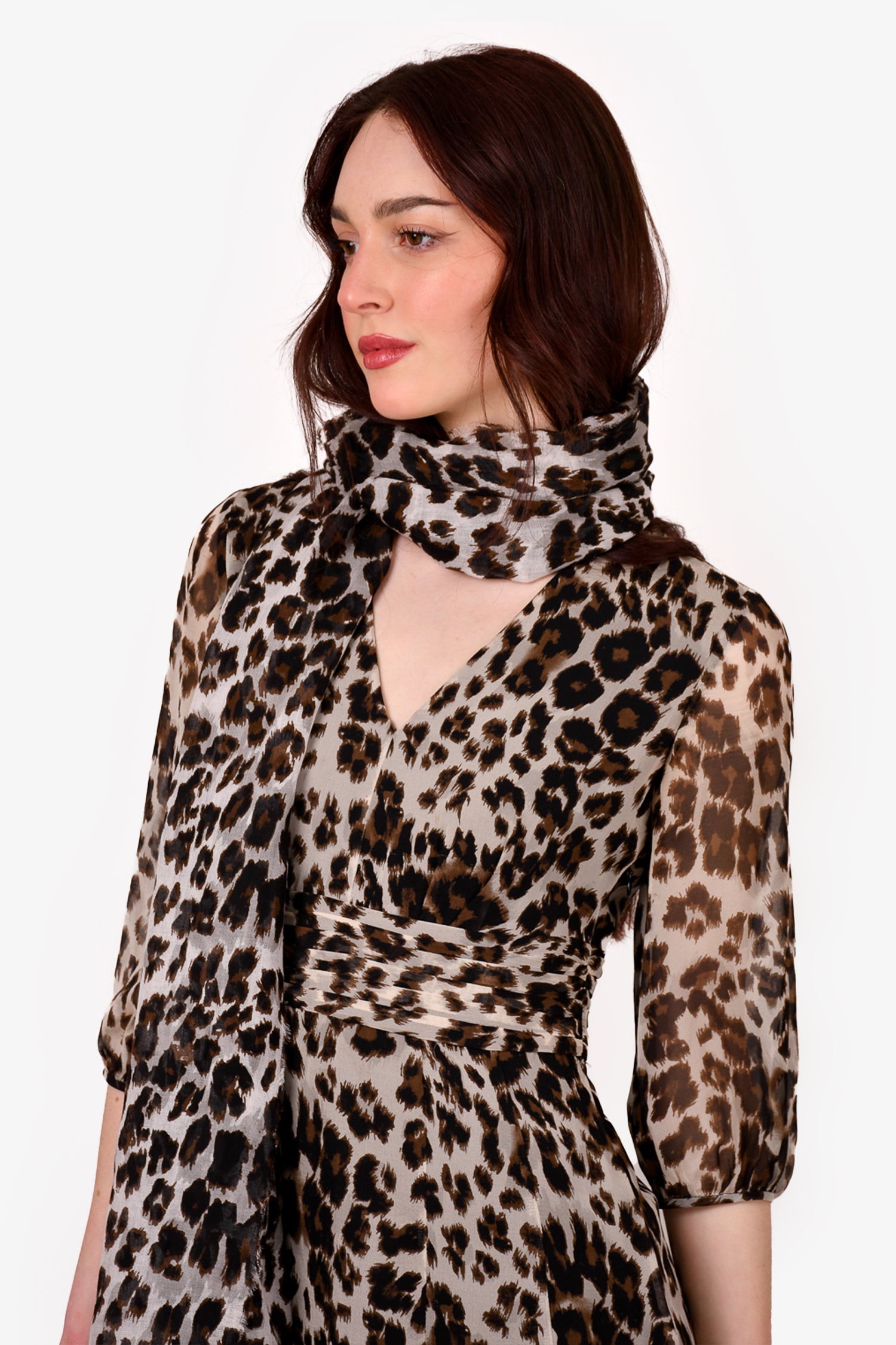 Refresh availabilityDiane Von Furstenberg Leopard Silk Dress with Scarf. V-neck. Lined. Side zip closure. Tonal stitching.