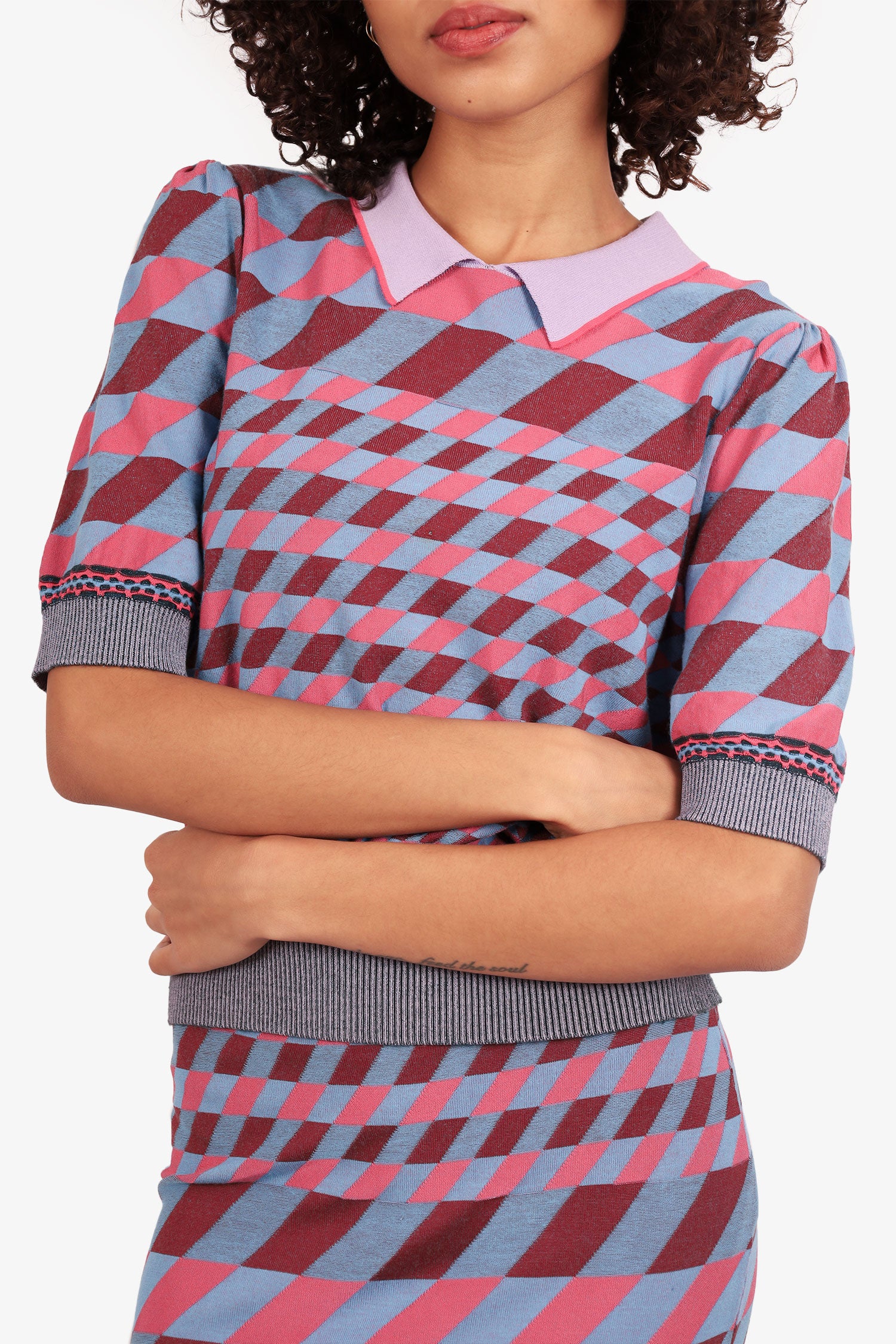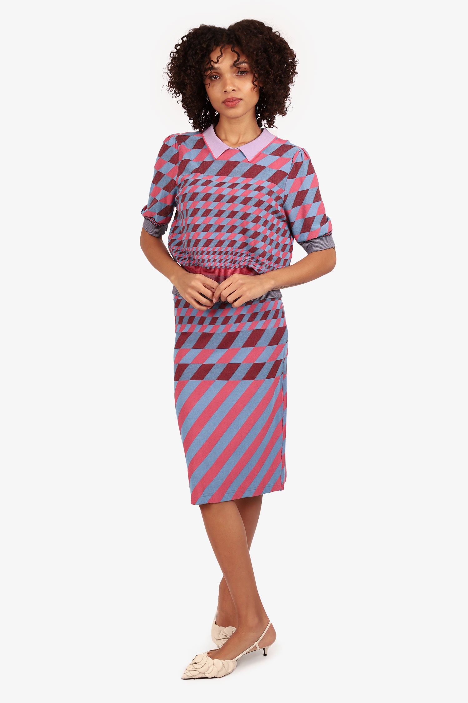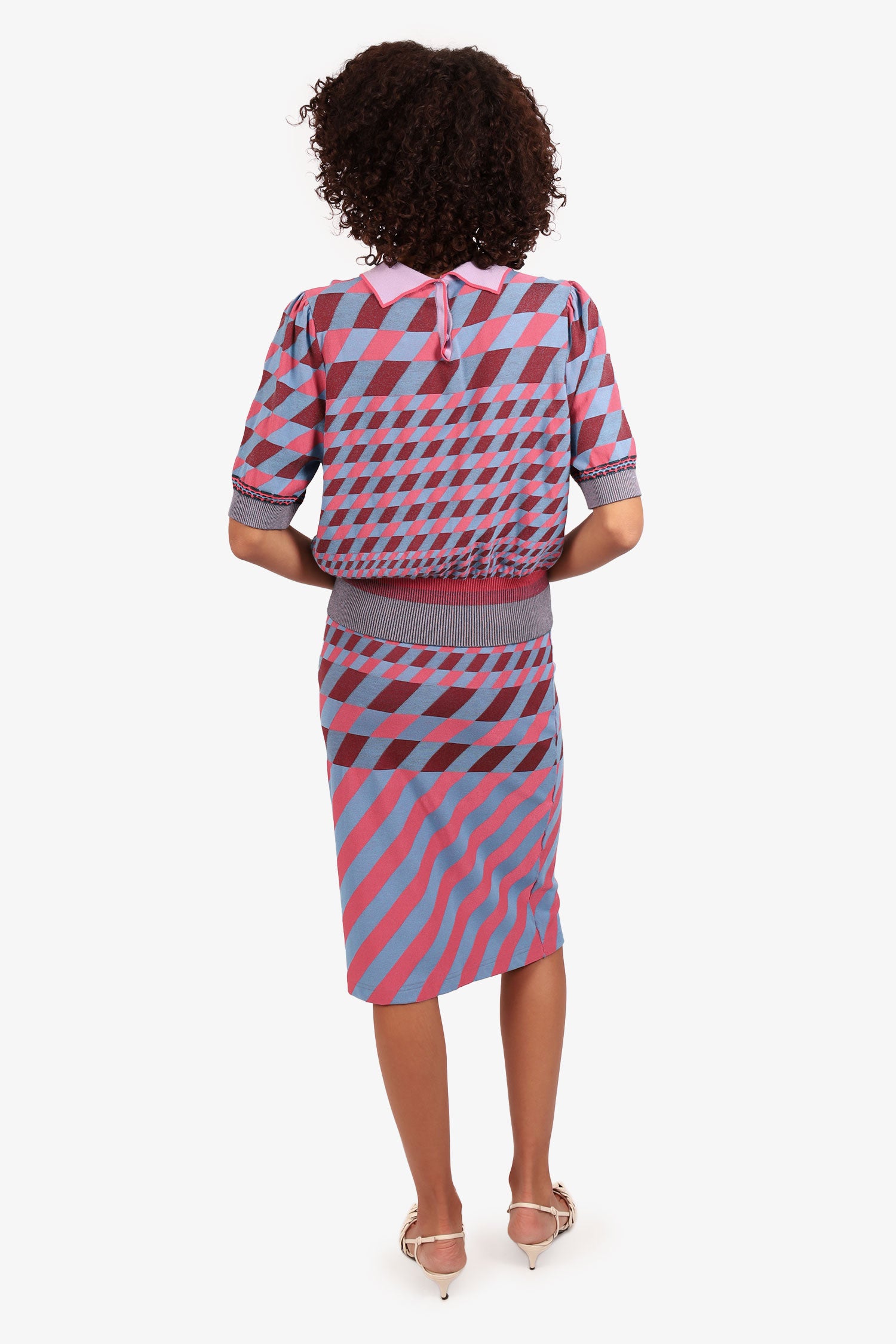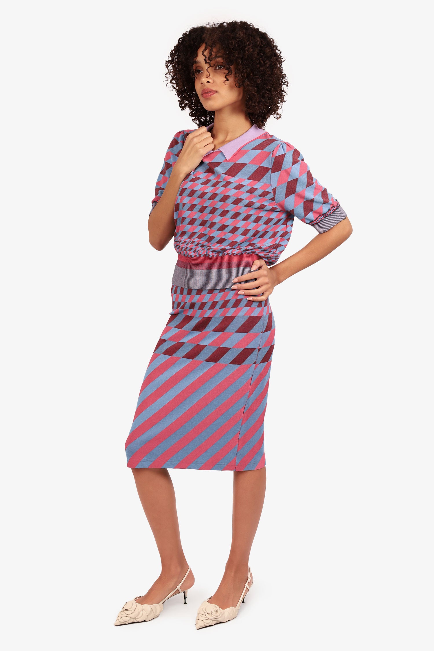 Refresh availabilityDiane von Furstenberg Pink/Blue Jenny Collared Sweater with Skirt Set. Top: Collared neckline. Ribbed and elasticated sleeve cuffs and bottom hem. Rear snap-button closure. Skirt: Ribbed and elasticated waistband. Both items are unlined with tonal stitching.