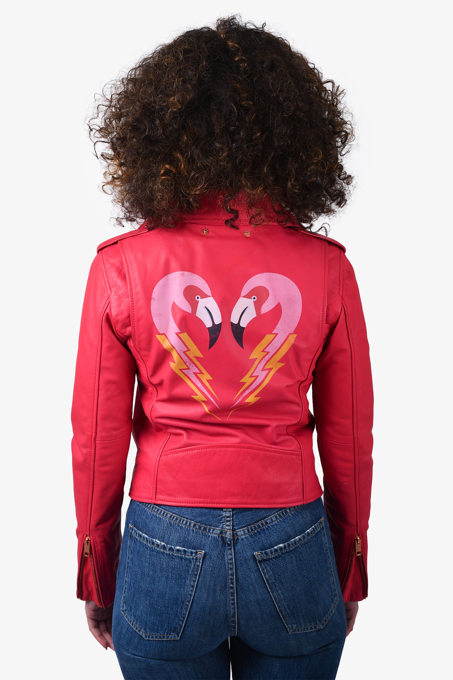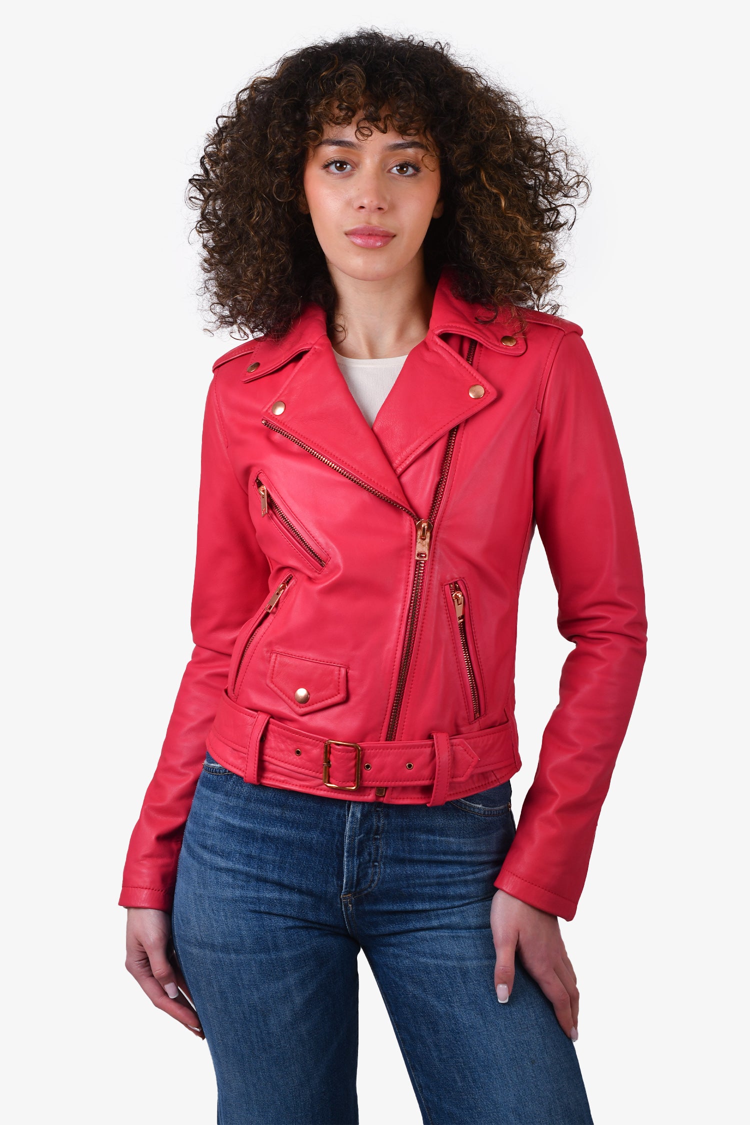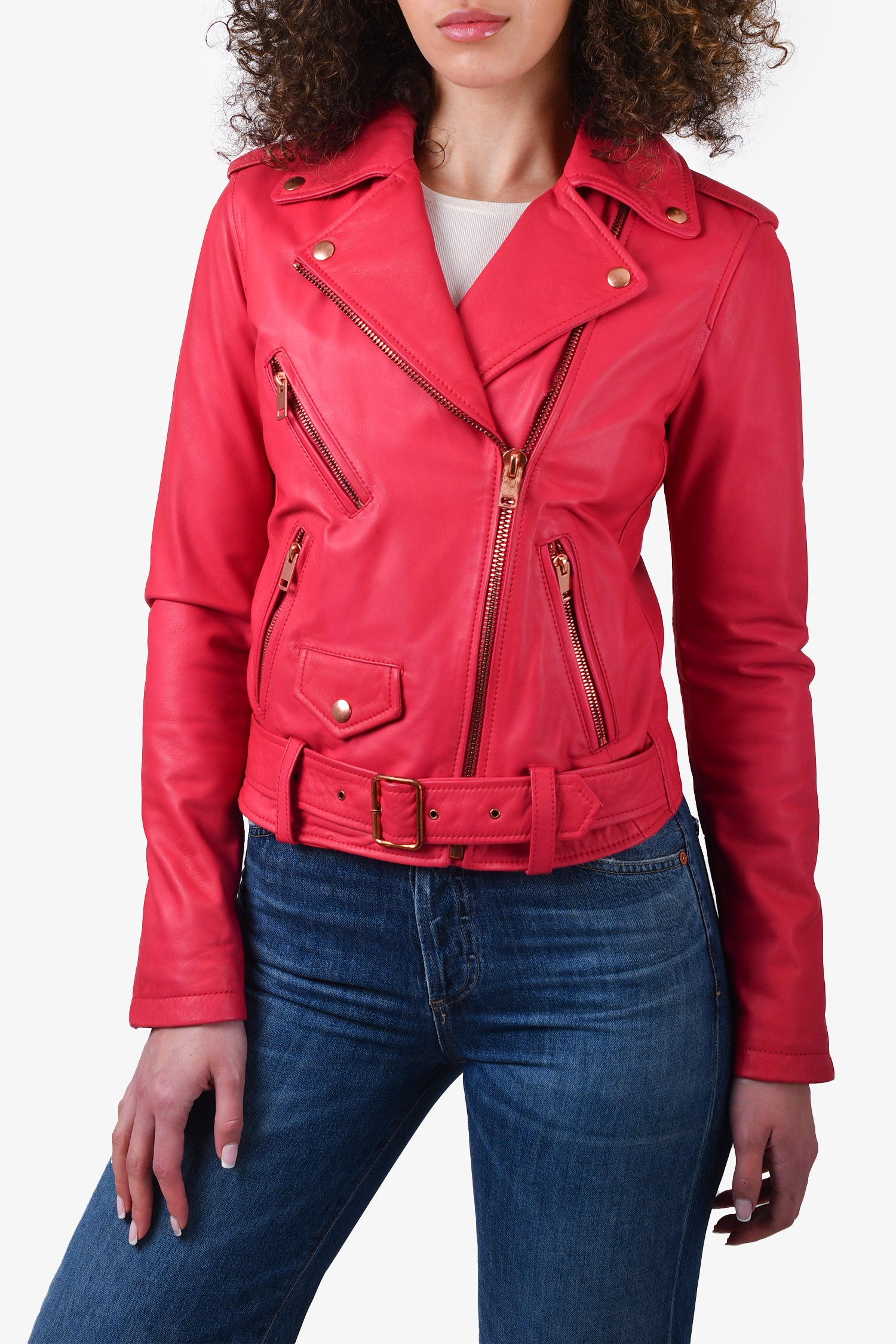 Refresh availabilityDiesel Fuchsia Pink Leather Moto Jacket. Lined. Tonal stitching. 3 front zip pockets. 1 front pocket with button closure. Buckle strap included. 1 interior slip pocket. Zip up closure on front. Rose-gold hardware. Tonal stitching.