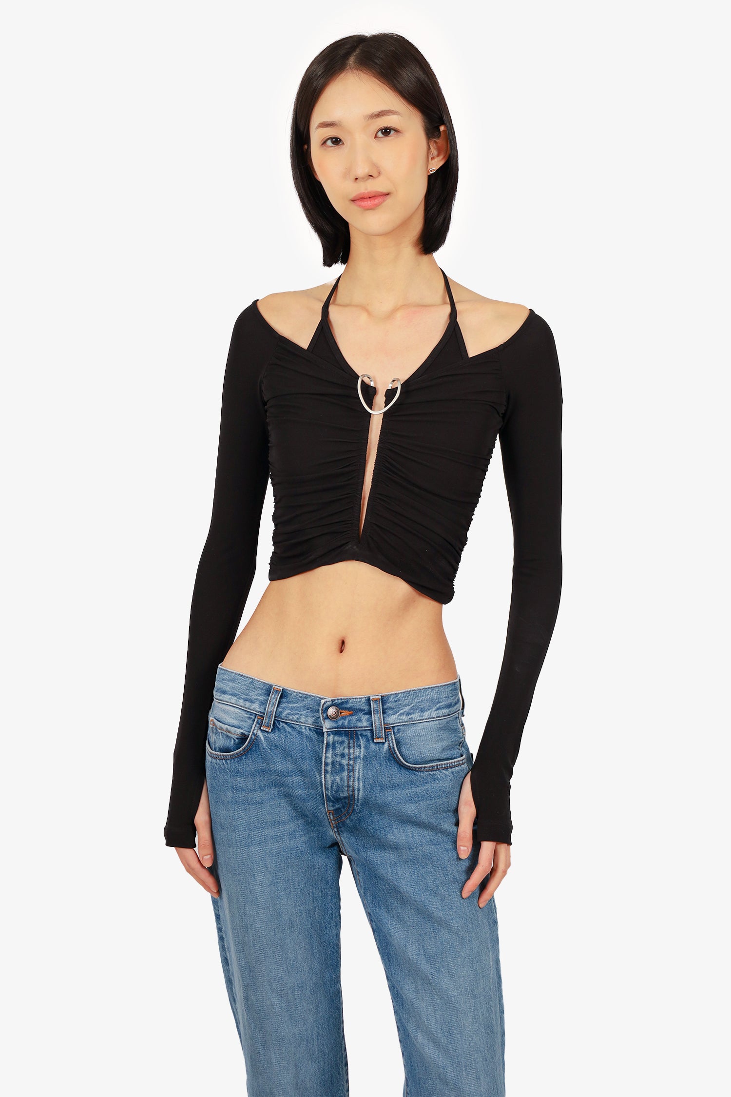 Refresh availabilityDion Lee Black Rushed Jersey Halterneck Top. Rear zip closure. Tie neck closure. Off the shoulder neckline. Ruched detail throughout. Silver-tone hardware. Tonal stitching.