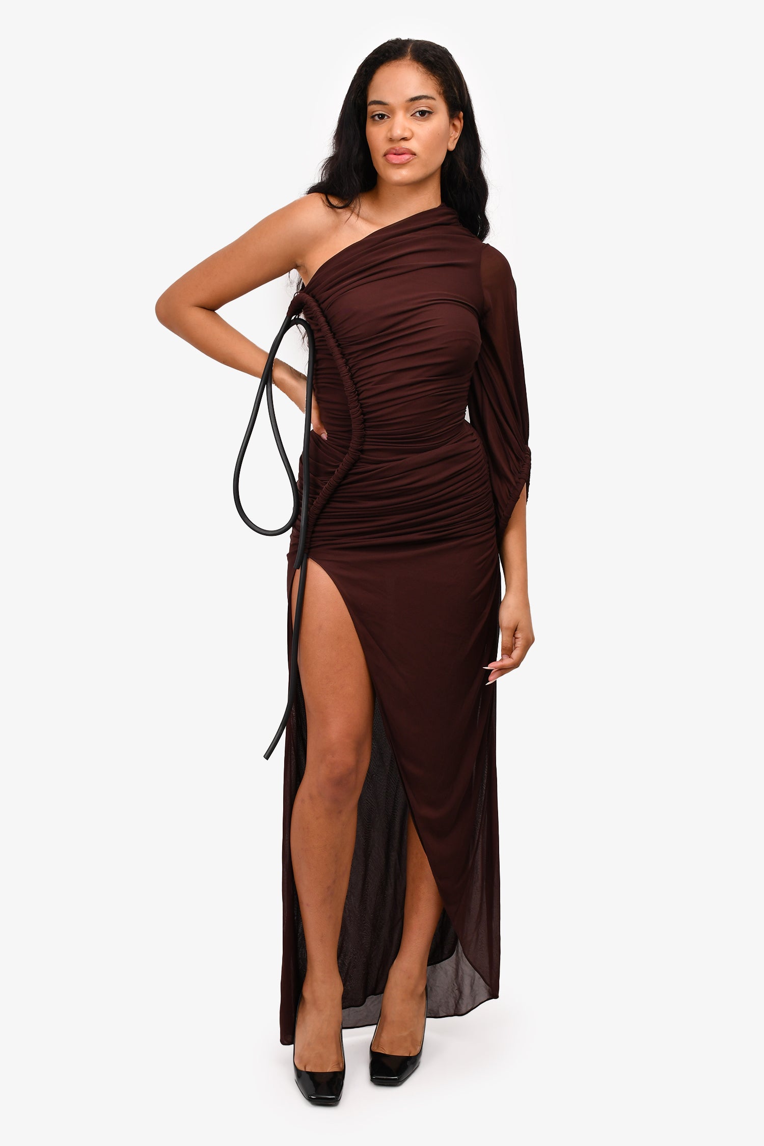 Refresh availabilityDion Lee Brown Ruched Rubber Detail Maxi Dress. Unlined. Hidden side zipper closure. One shoulder styling with statement sleeve. Asymmetrical hem. Tonal stitching.
