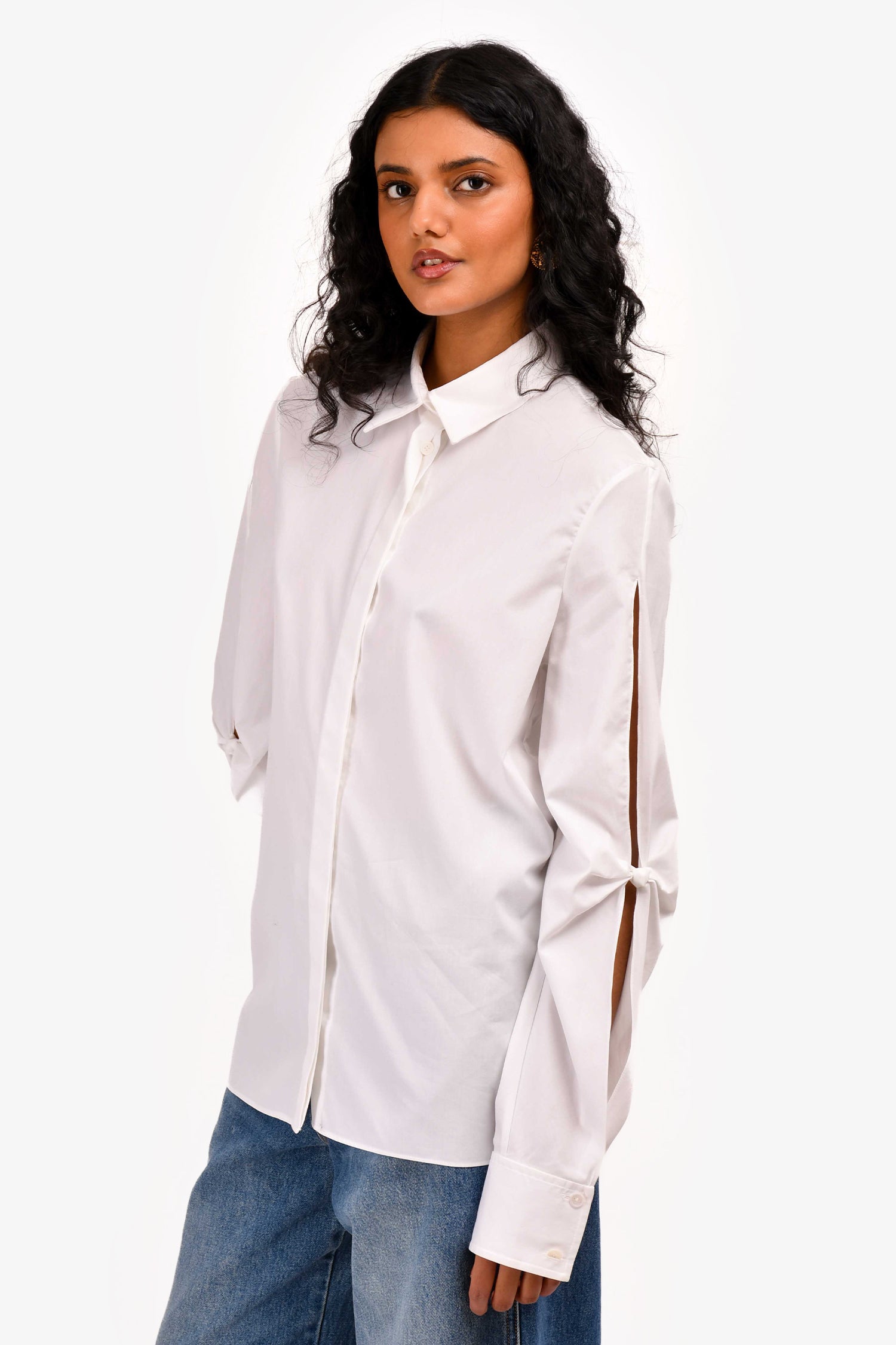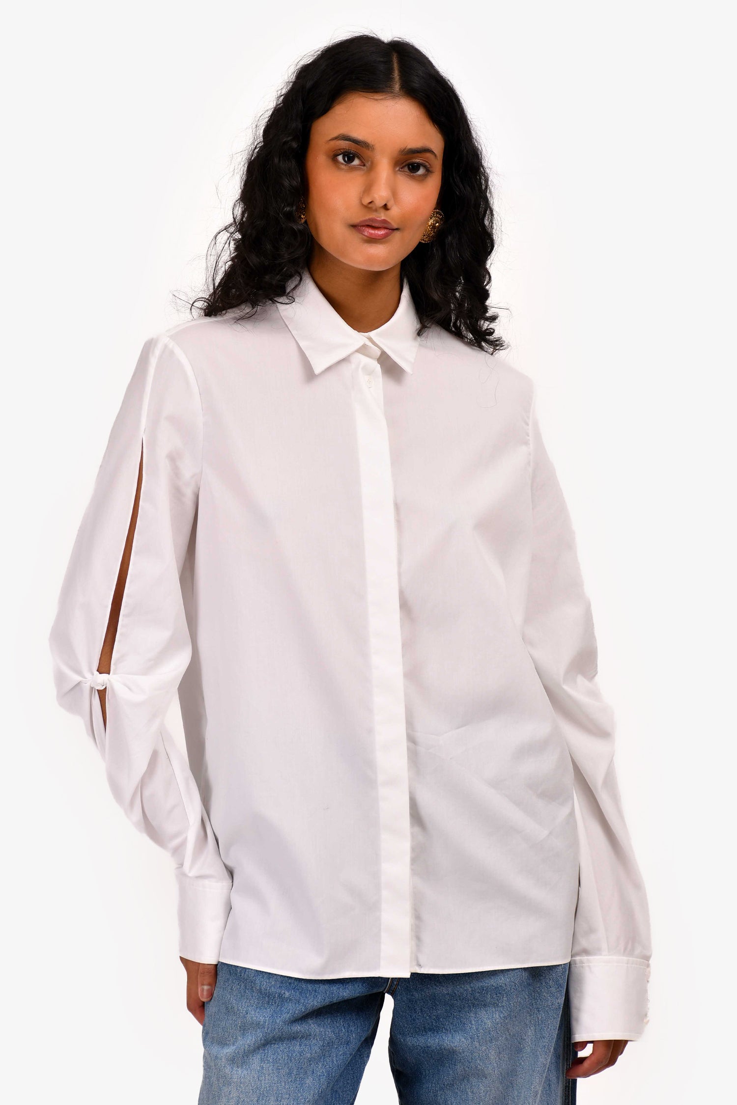 Refresh availabilityDion Lee White Cotton Button-Up Top with Open Sleeve Detail. Collared neckline. Front and sleeve cuff button-up closure.